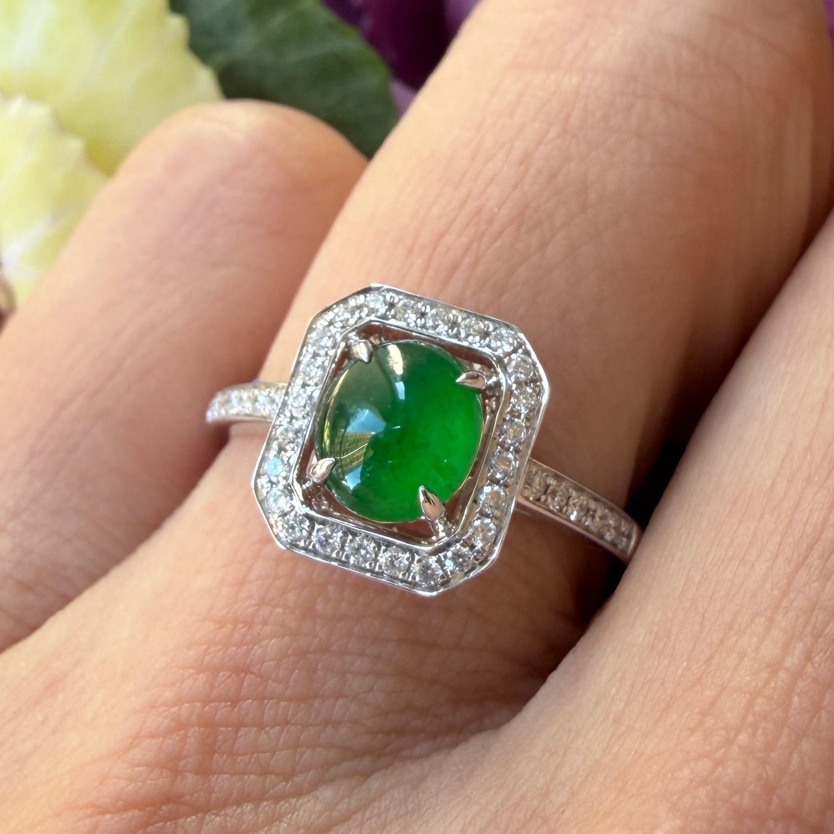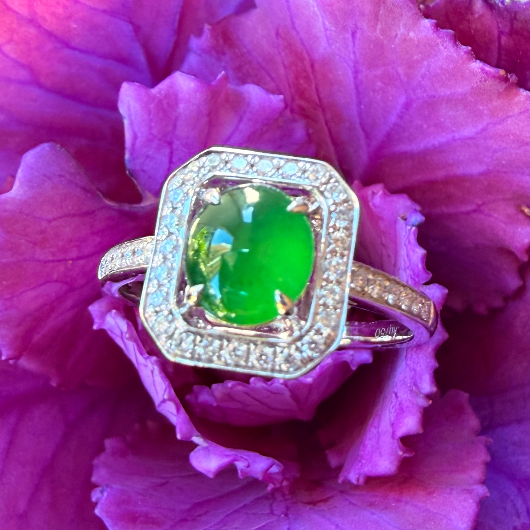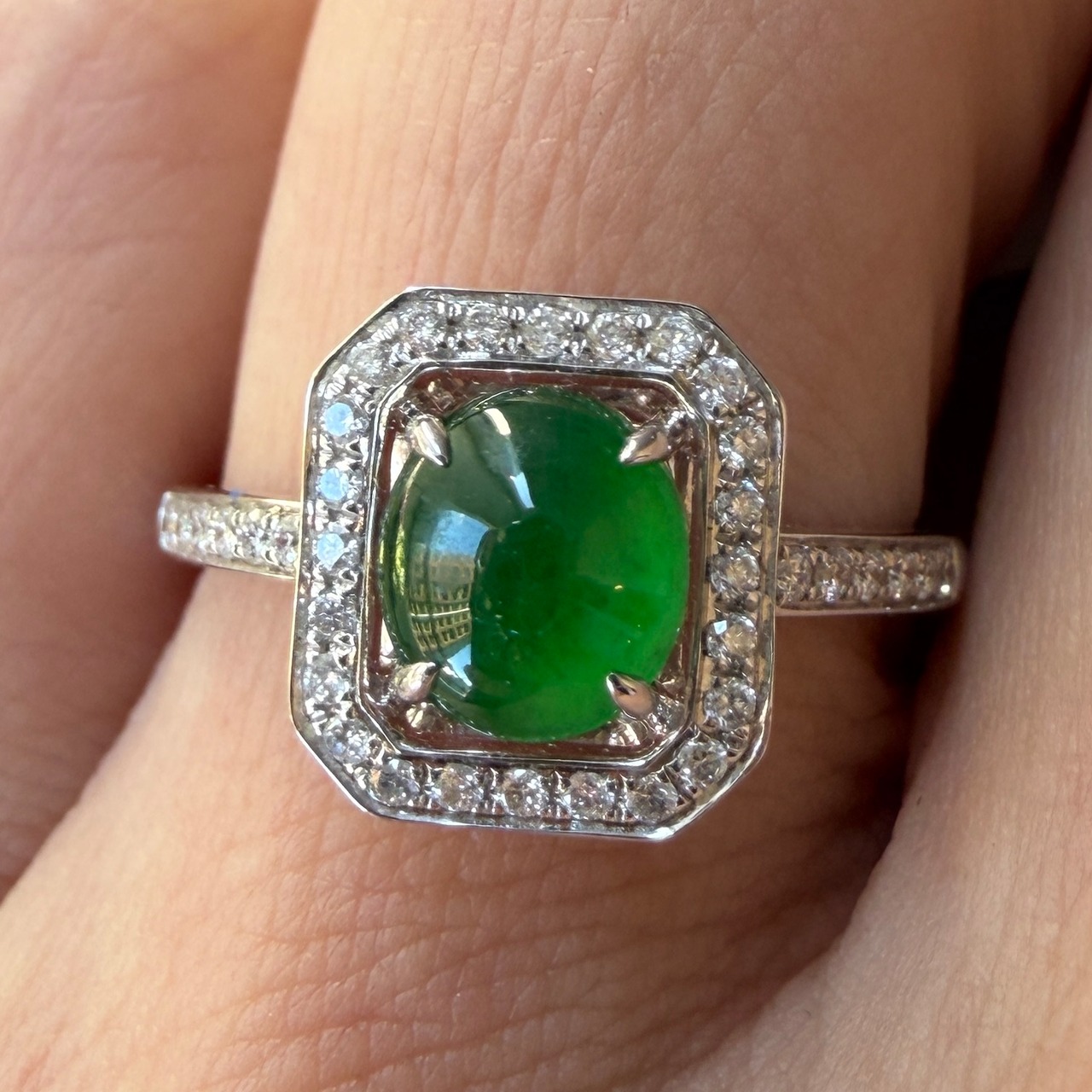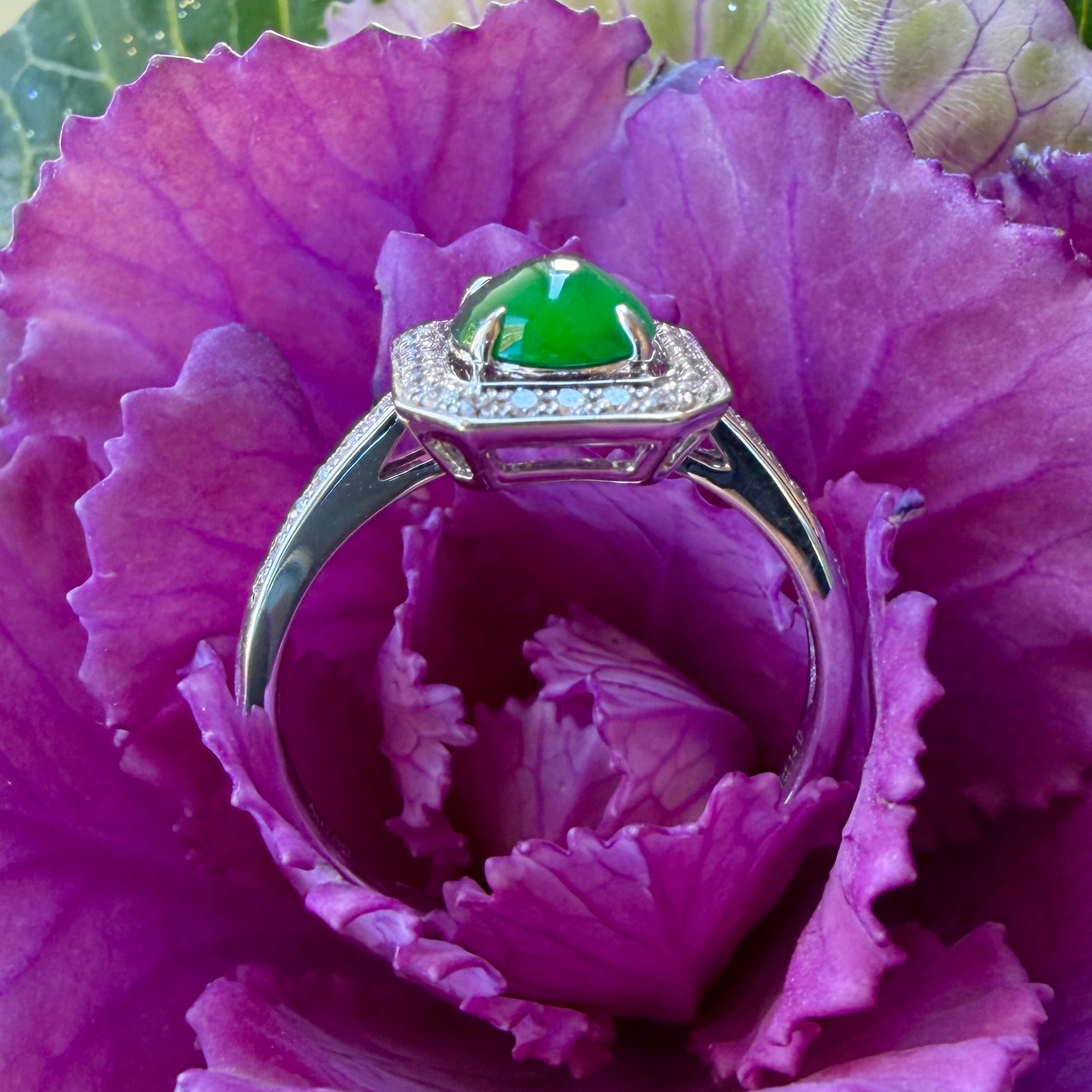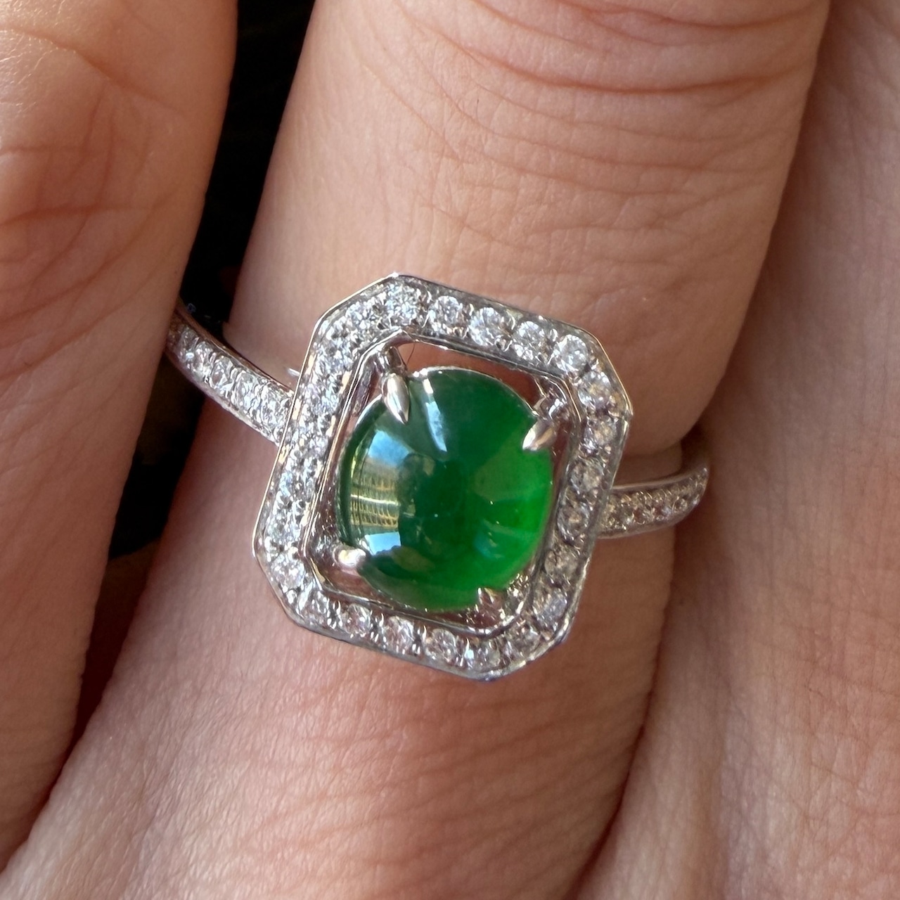 美しい大粒の琅玕翡翠をダイヤモンドで囲んだアールデコ調の存在感のあるリングです。翡翠のリングデザインではなかなか見かけないクラシックな雰囲気も併せ持つモダンなデザインで、エメラルドととは違う奥深く高貴な緑色が、光によって様々な表情を見せてくれる魅惑的なお品です。