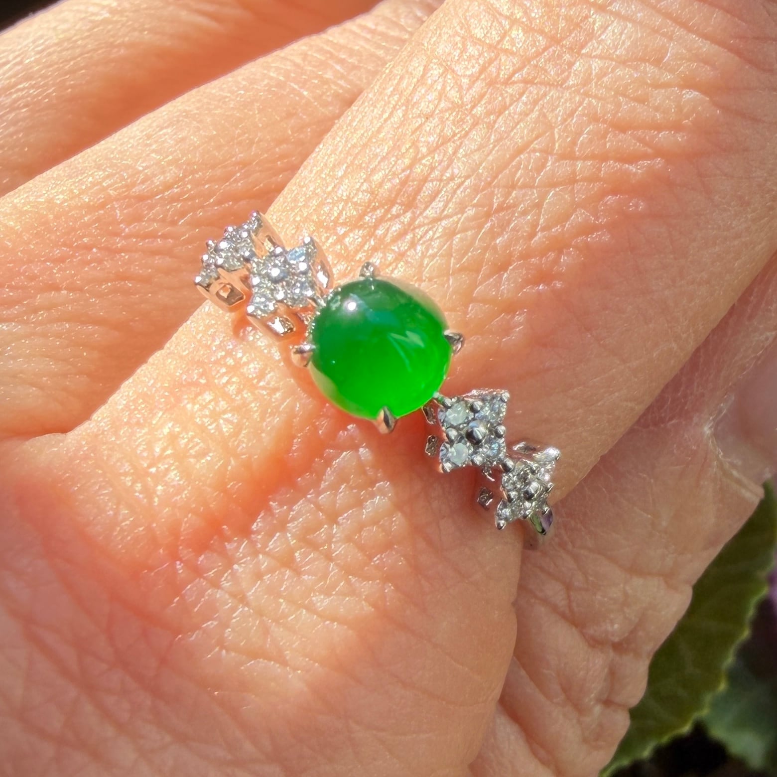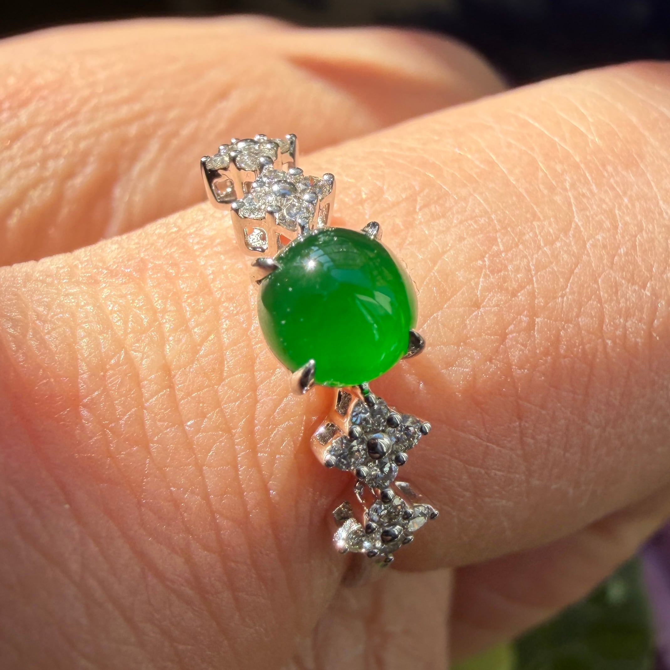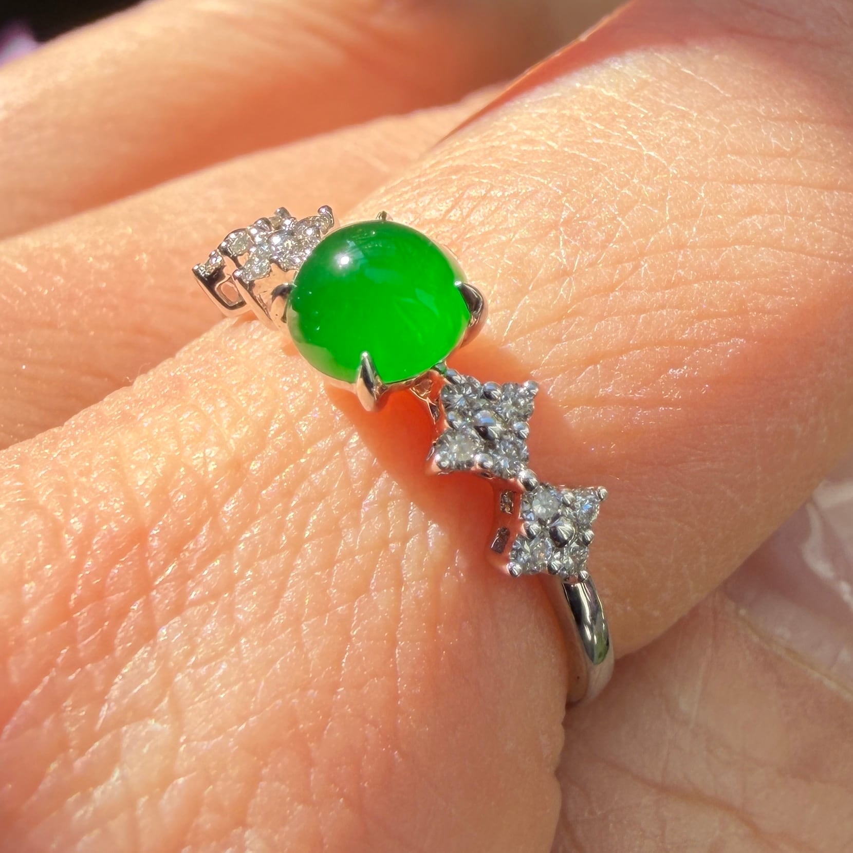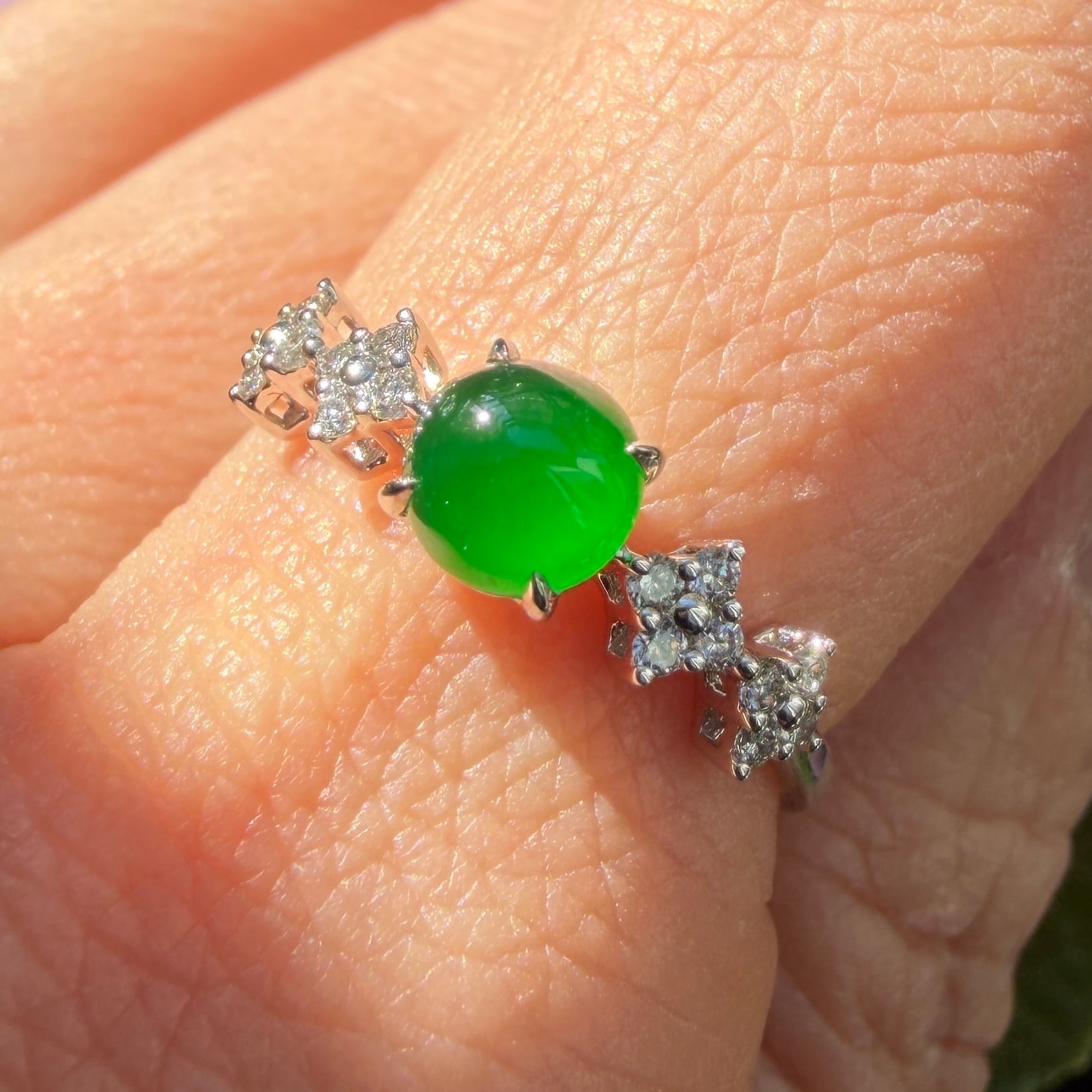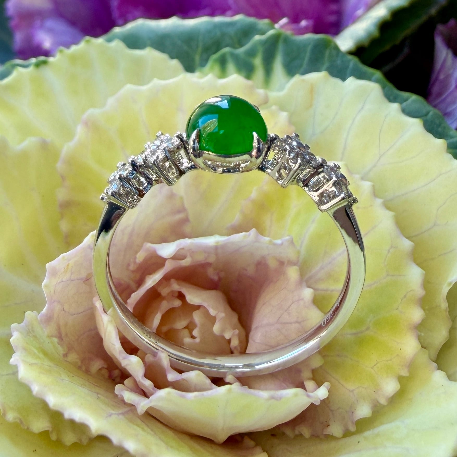 うるうるとしたこれぞ琅玕翡翠といった緑色のセンターストーンのサイドに、美しいダイヤモンドをあしらった18金ホワイトゴールドのリングです。