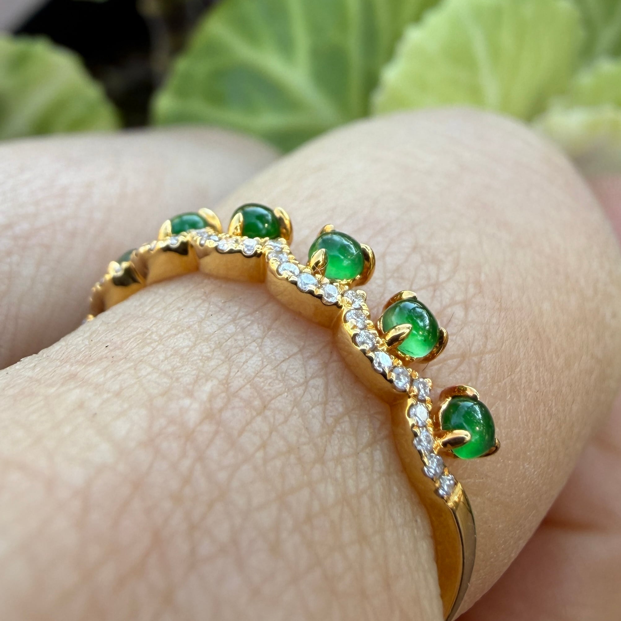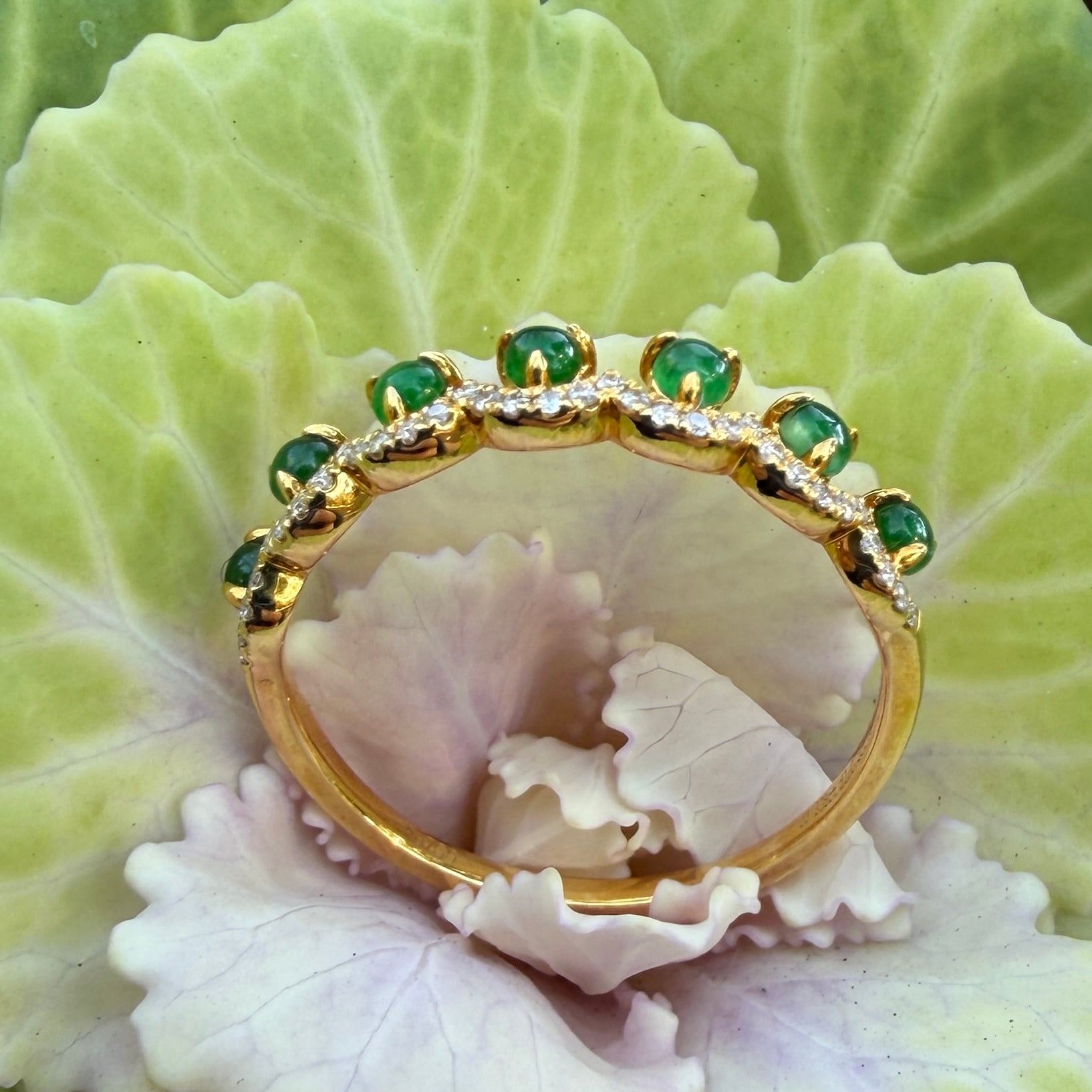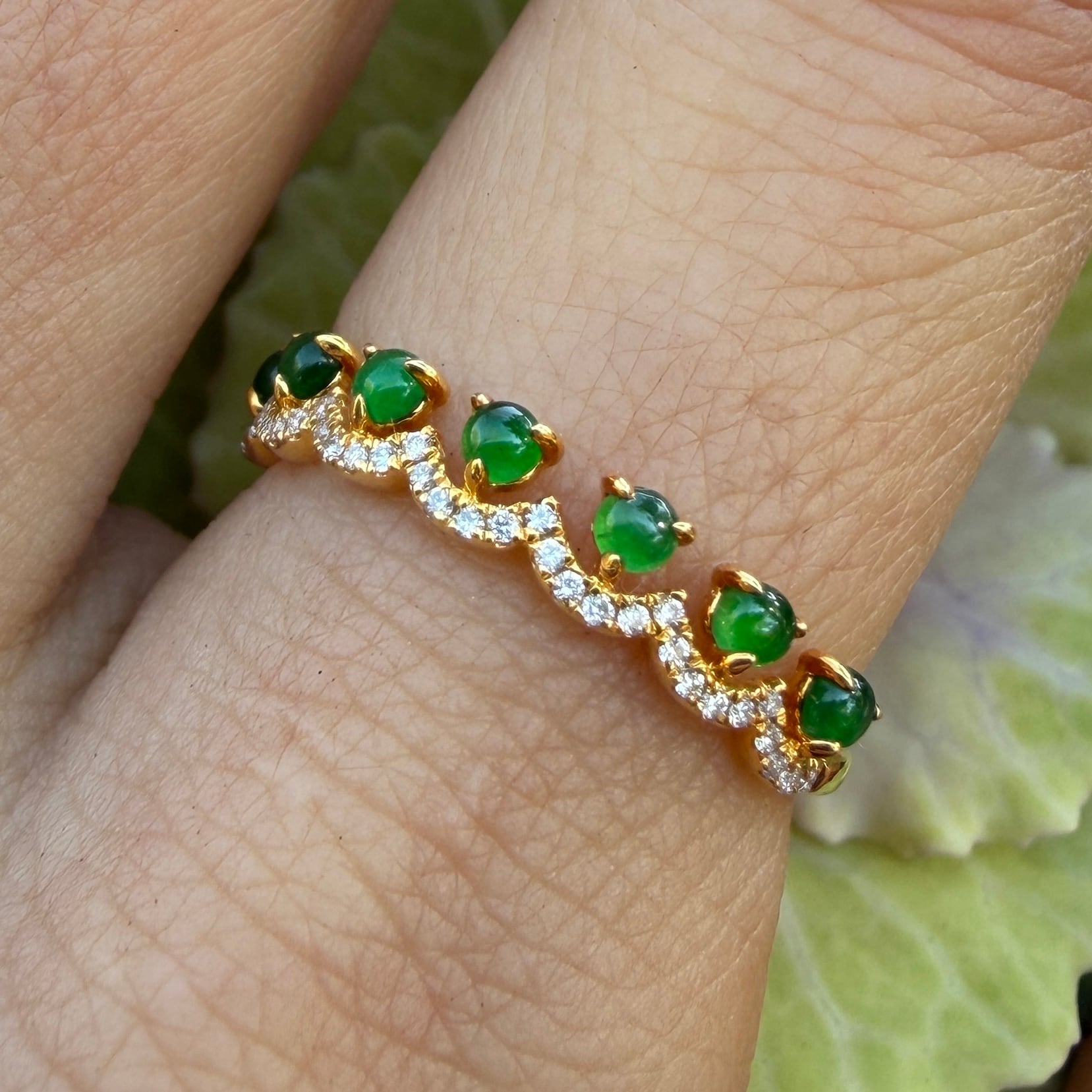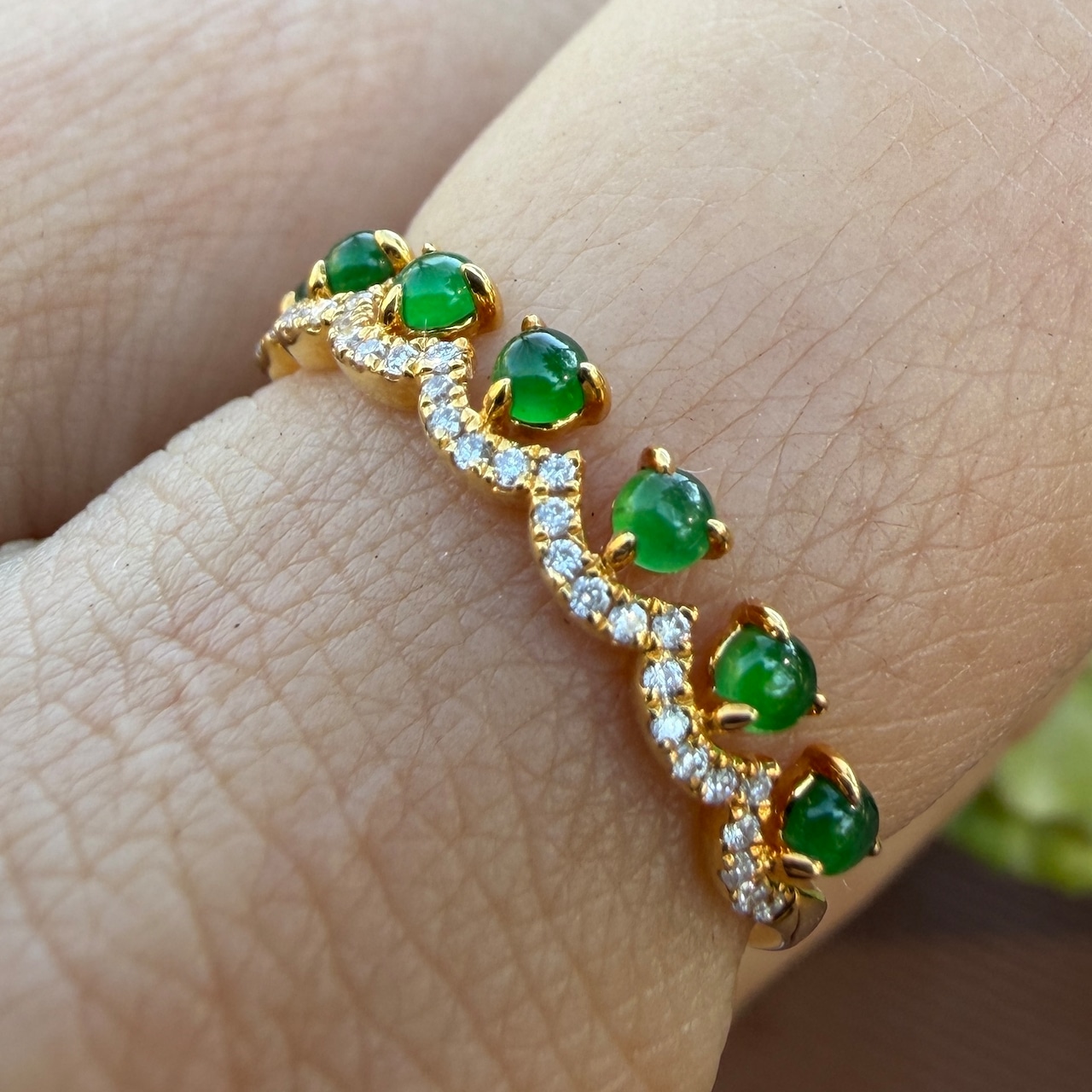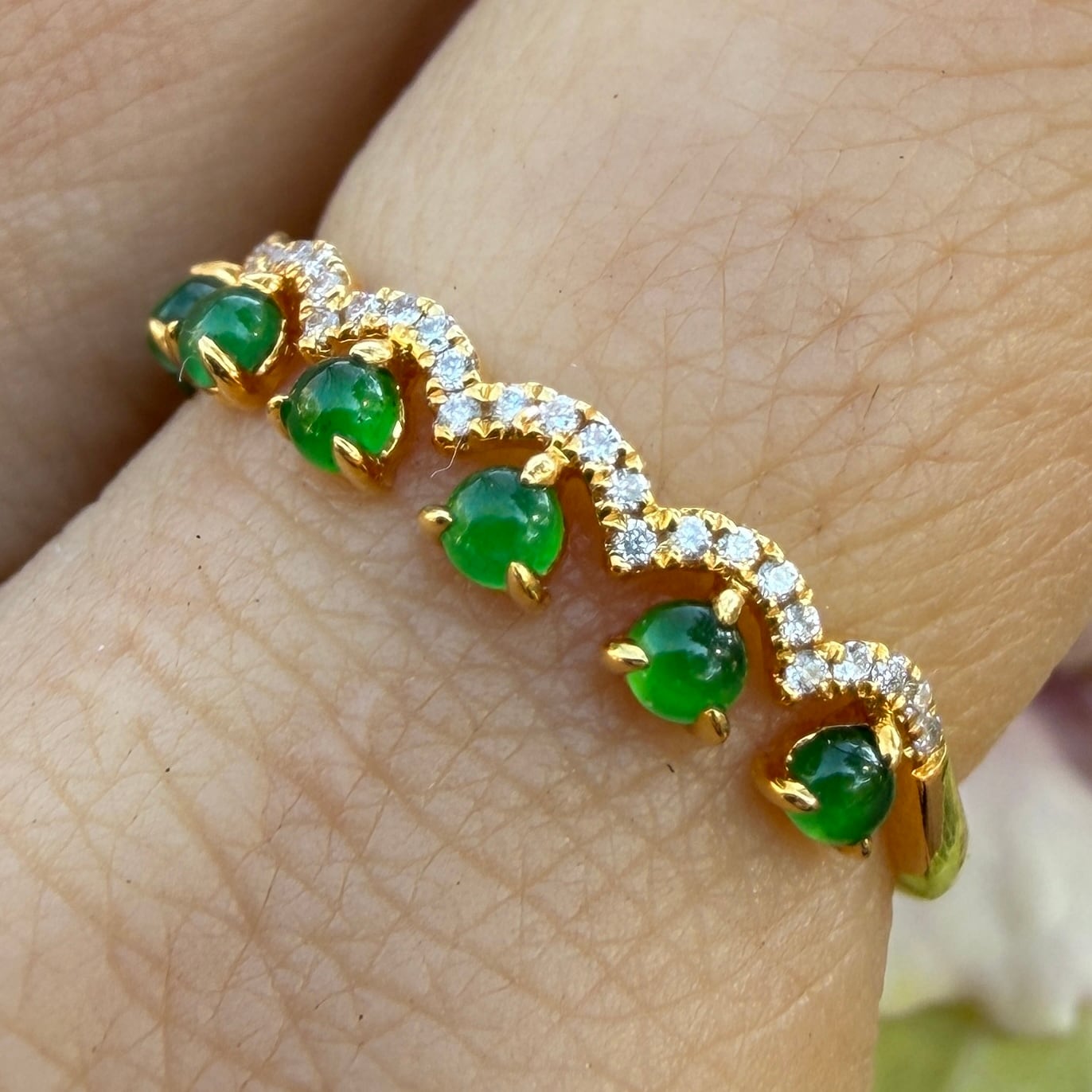 素晴らしい翡翠だけを選抜している為、この様に小さく磨いても素晴らしい発色でまるで発光しているかの様な美しい緑色が特徴です。天然石でこの様なジュエリーを作る時の苦労はつぶの美しさと、形、色を揃える事。この作業だけであっという間に1日が終わってしまうくらい大変な作業です。そんな苦労を感じさせないくらいうるうるとした瑞々しい緑色のまさに粒よりの翡翠と美しいダイヤモンドを18金ゴールドでリングに仕立ててあります。