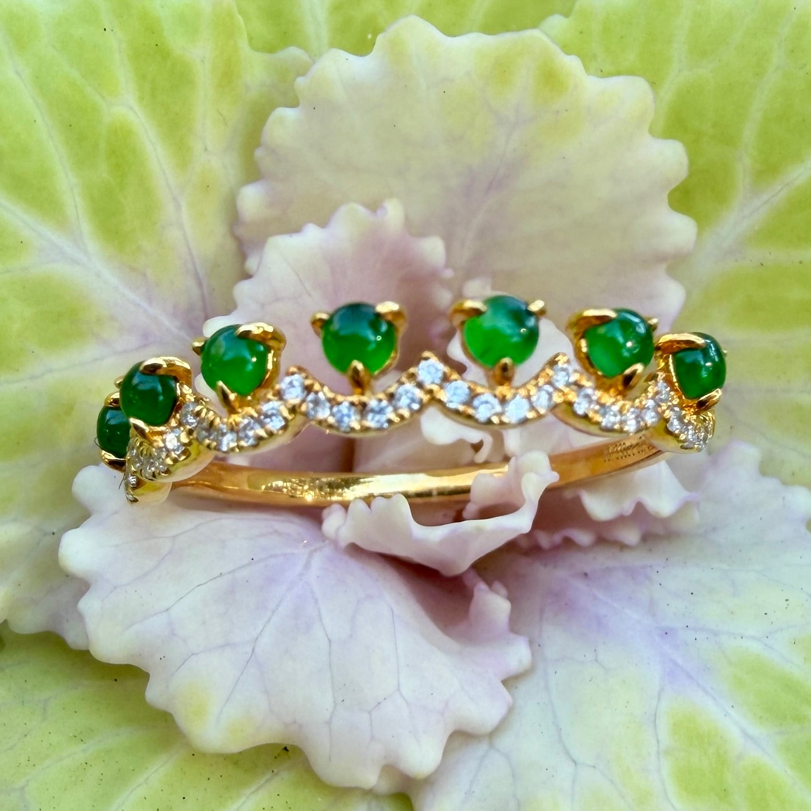 まるで発光しているかの様に美しいと手にされたお客様に大好評の琅玕翡翠。その美しい琅玕翡翠とダイヤモンドをまるでティアラのように仕立てたK18イエローゴールドのプリンセスリングです。お手持ちのリングとのコーディネートもおすすめです。