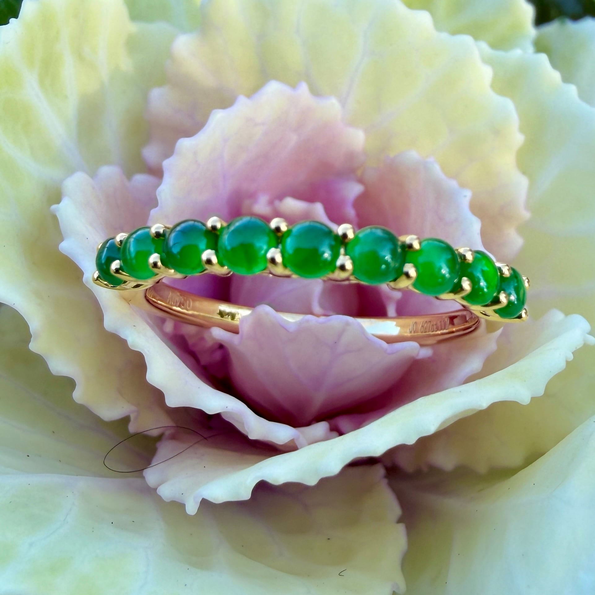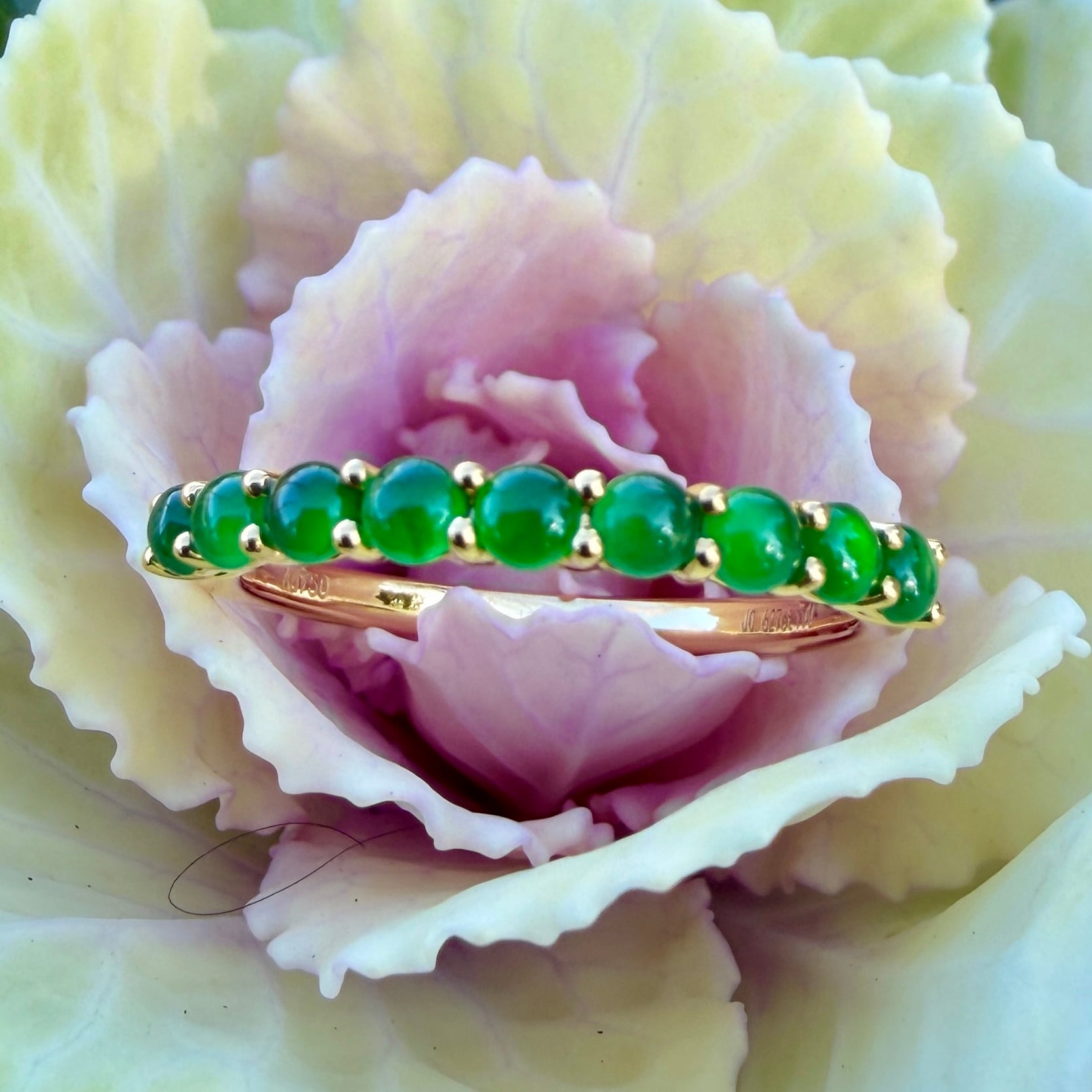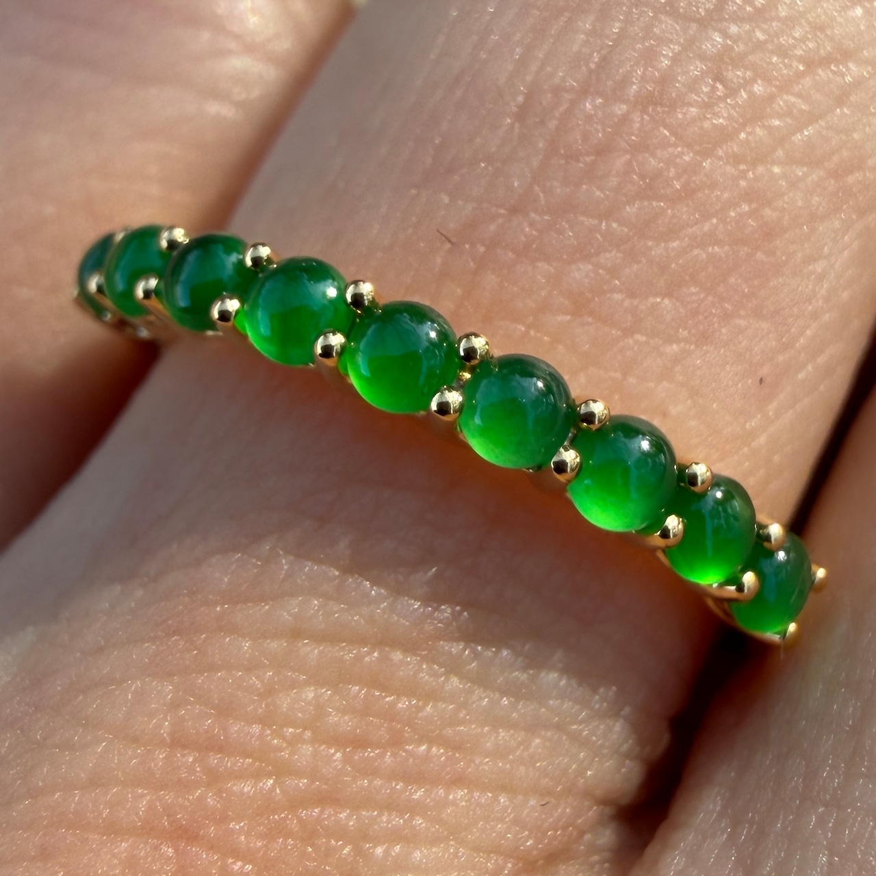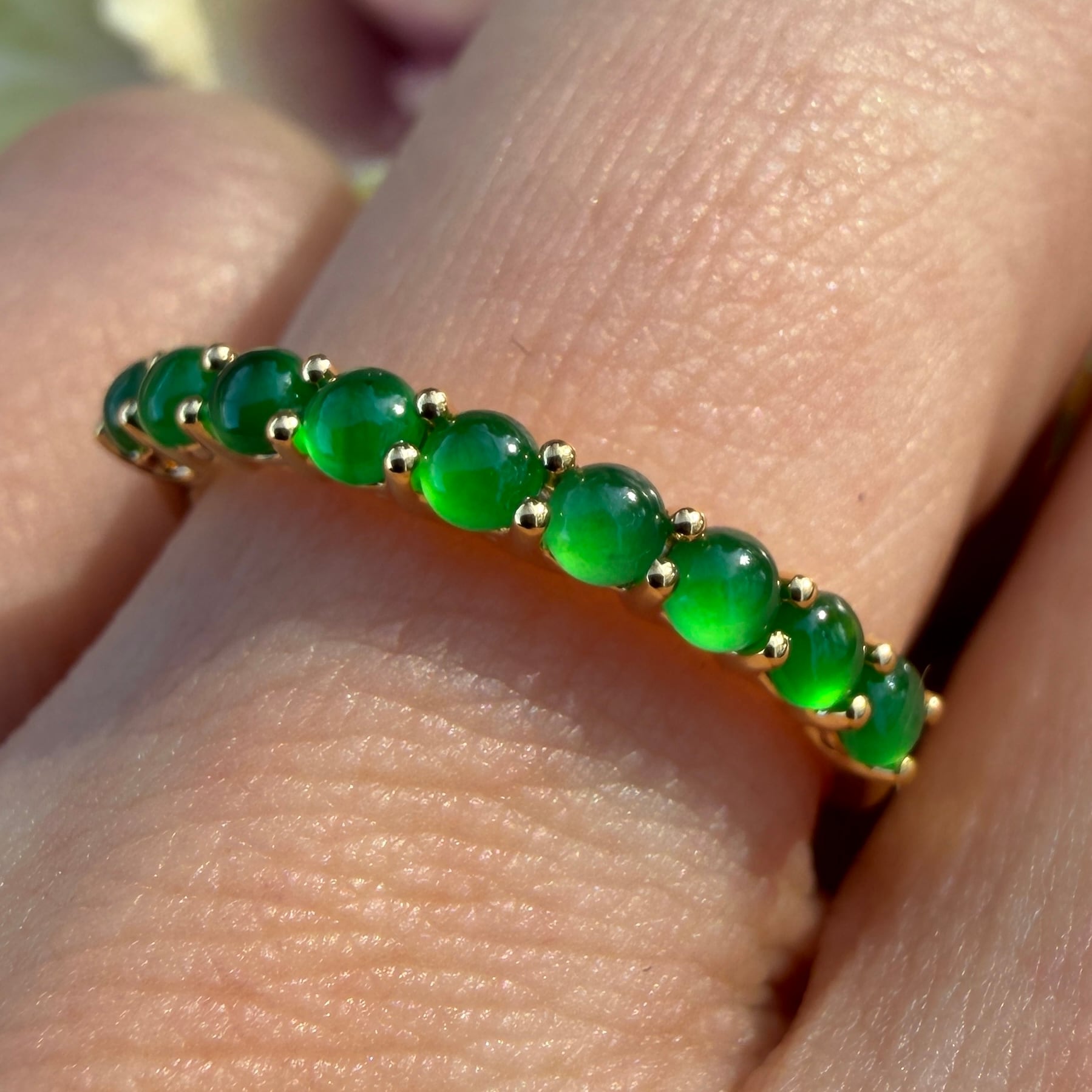 素晴らしい色が特徴の為、この様に小さく磨いても素晴らしい発色でまるで発光しているかの様な美しい緑色が特徴です。天然石でこの様なジュエリーを作る時の苦労はつぶの美しさと、形、色を揃える事。この作業だけであっという間に1日が終わってしまうくらい大変な作業です。そんな苦労を感じさせないくらいうるうるとした瑞々しい緑色のまさに粒よりの翡翠を18金イエローゴールドでリングに仕立ててあります。