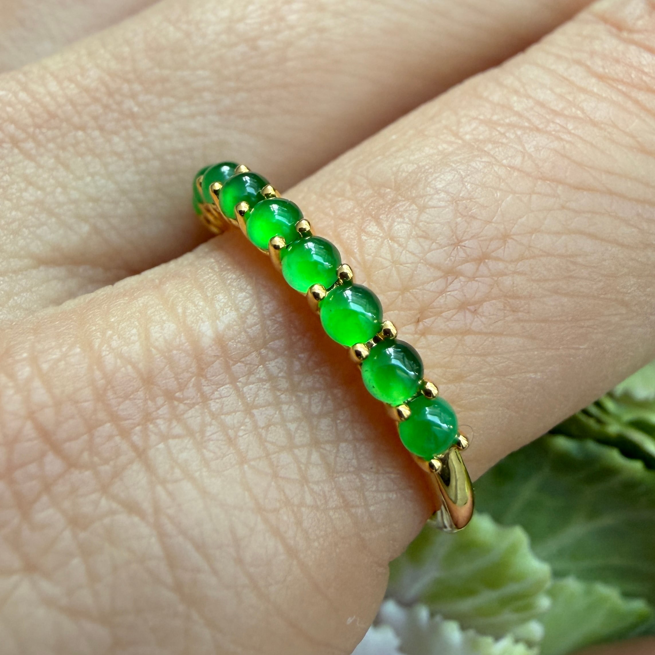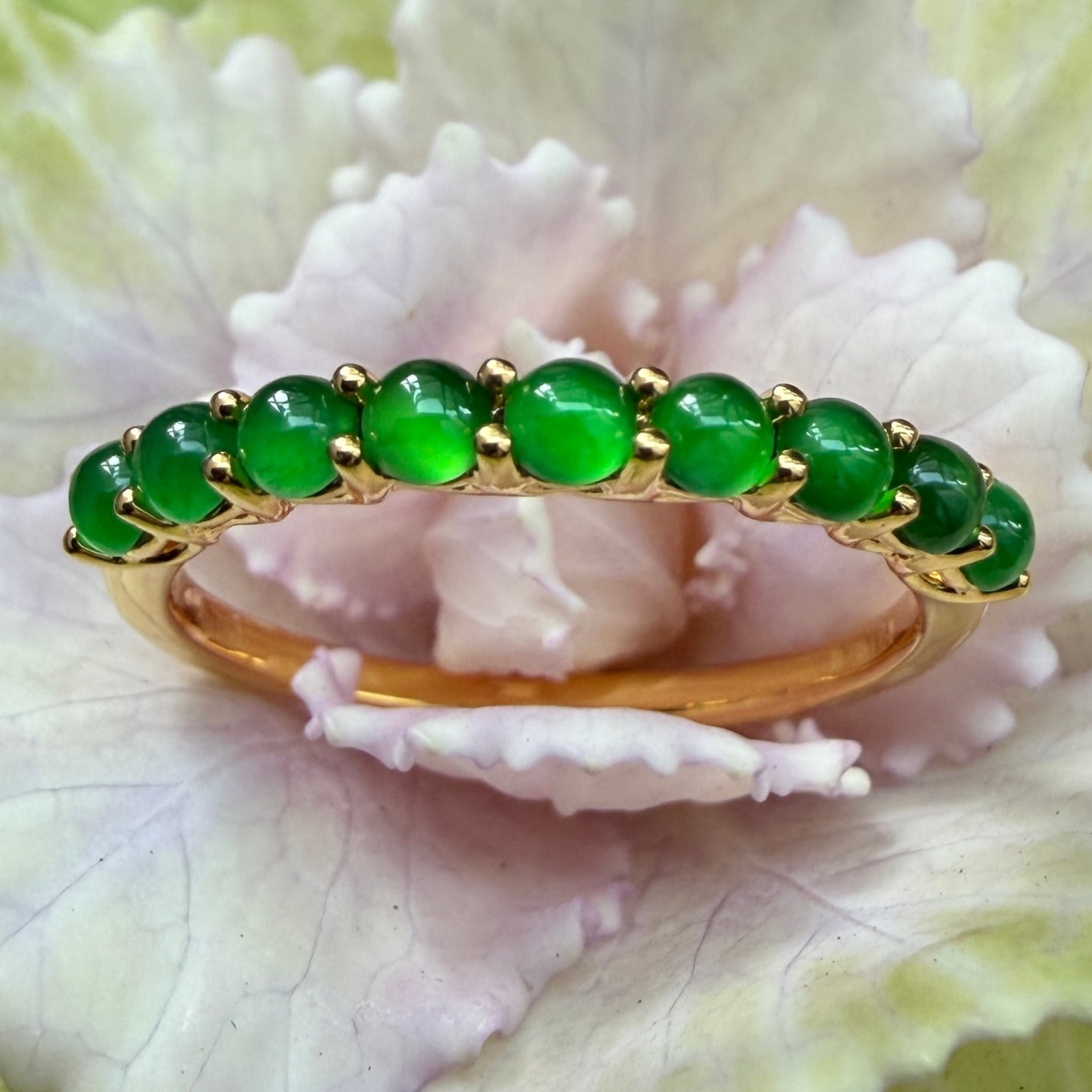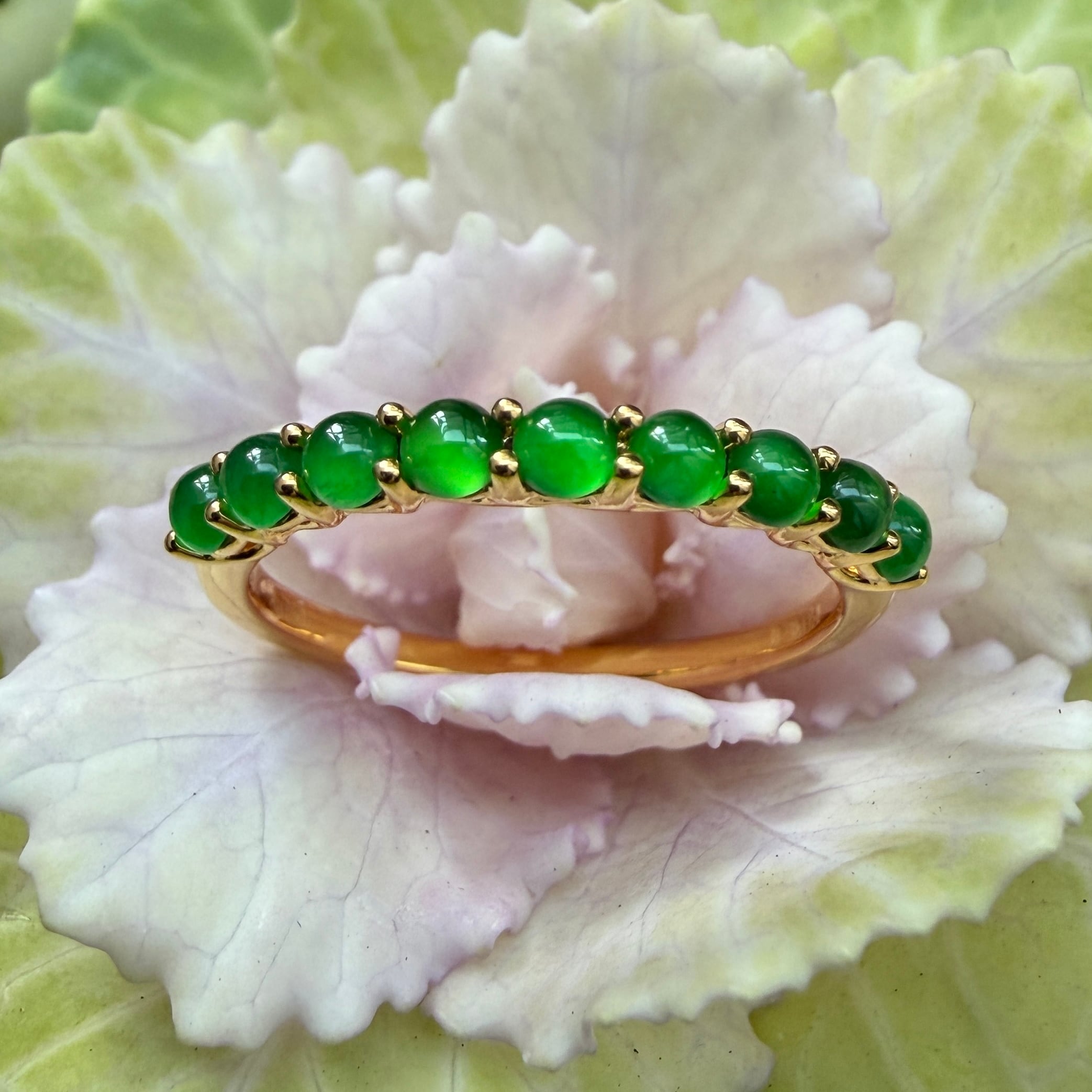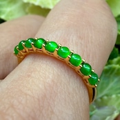 素晴らしい色が特徴の為、この様に小さく磨いても素晴らしい発色でまるで発光しているかの様な美しい緑色が特徴です。天然石でこの様なジュエリーを作る時の苦労はつぶの美しさと、形、色を揃える事。この作業だけであっという間に1日が終わってしまうくらい大変な作業です。そんな苦労を感じさせないくらいうるうるとした瑞々しい緑色のまさに粒よりの翡翠を18金イエローゴールドでリングに仕立ててあります。
