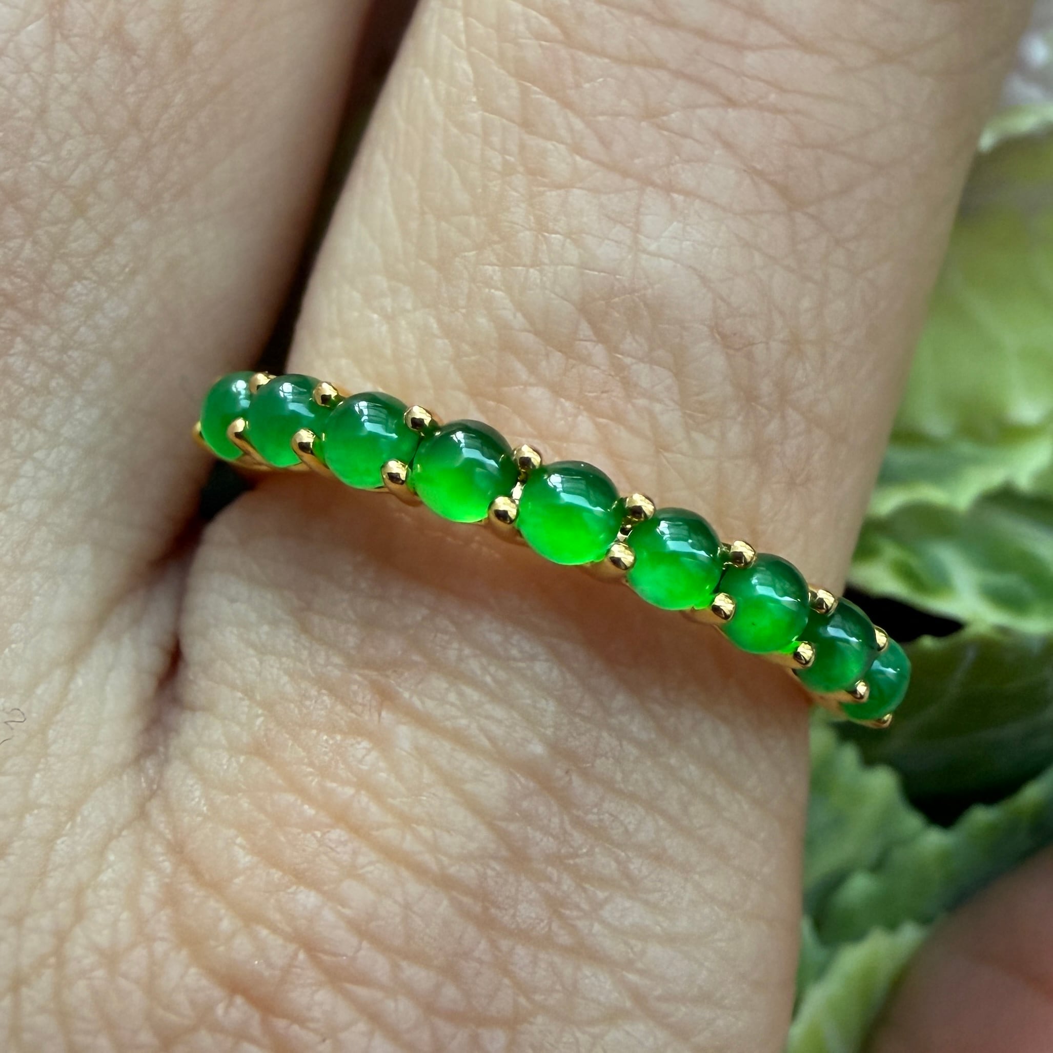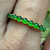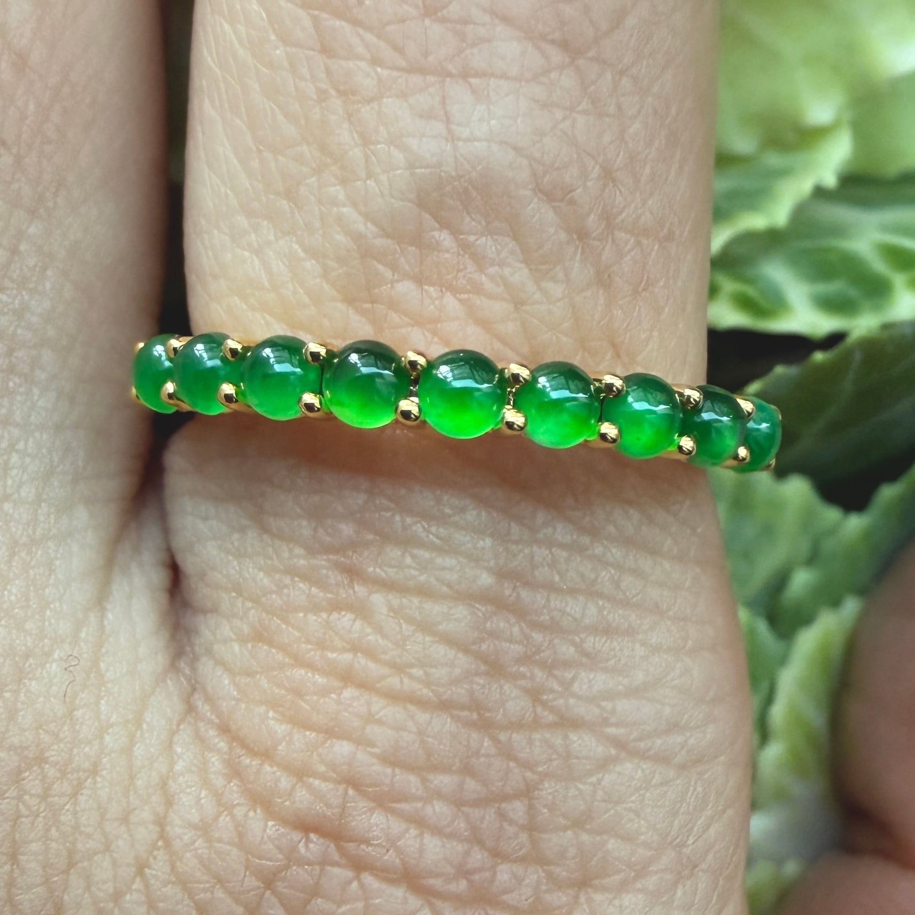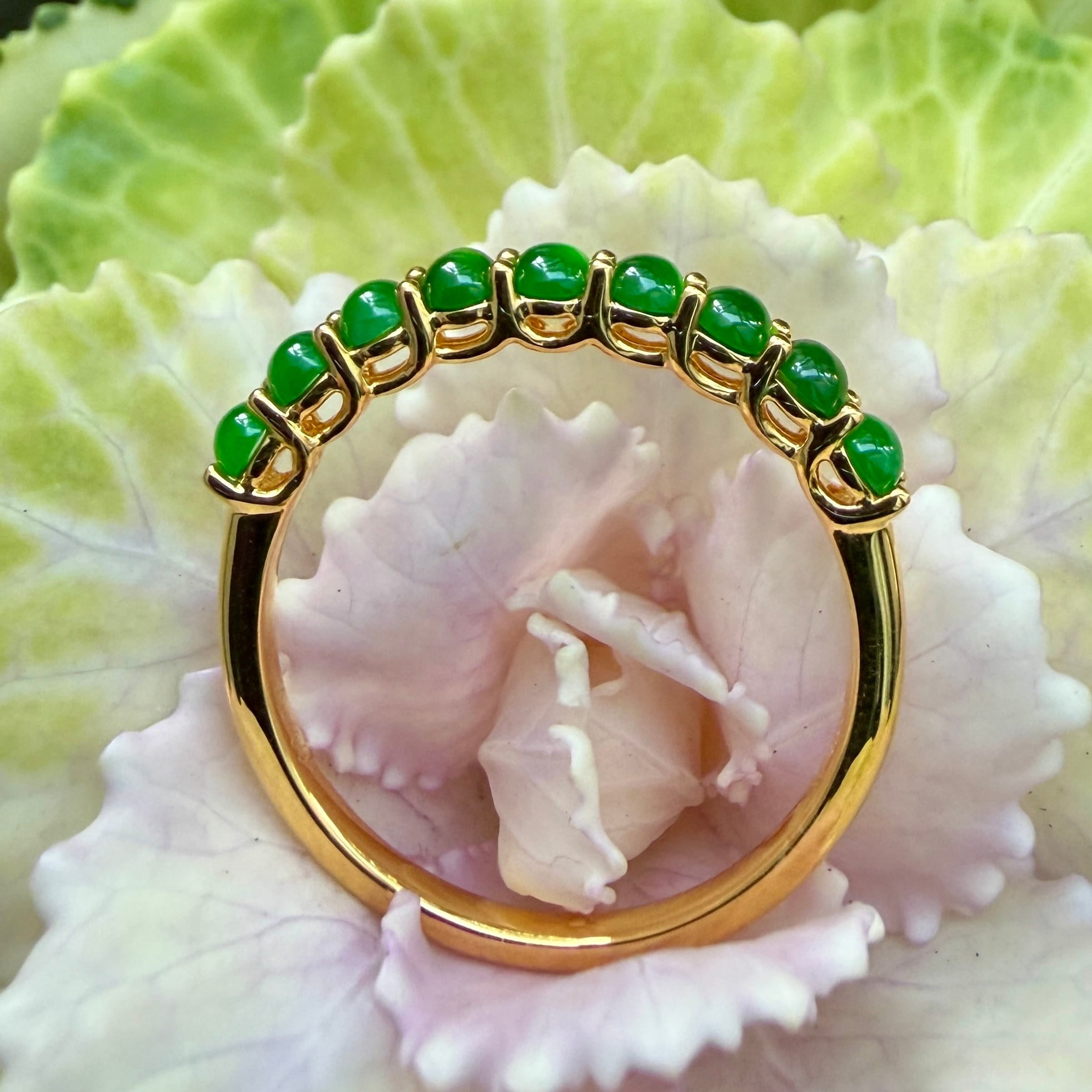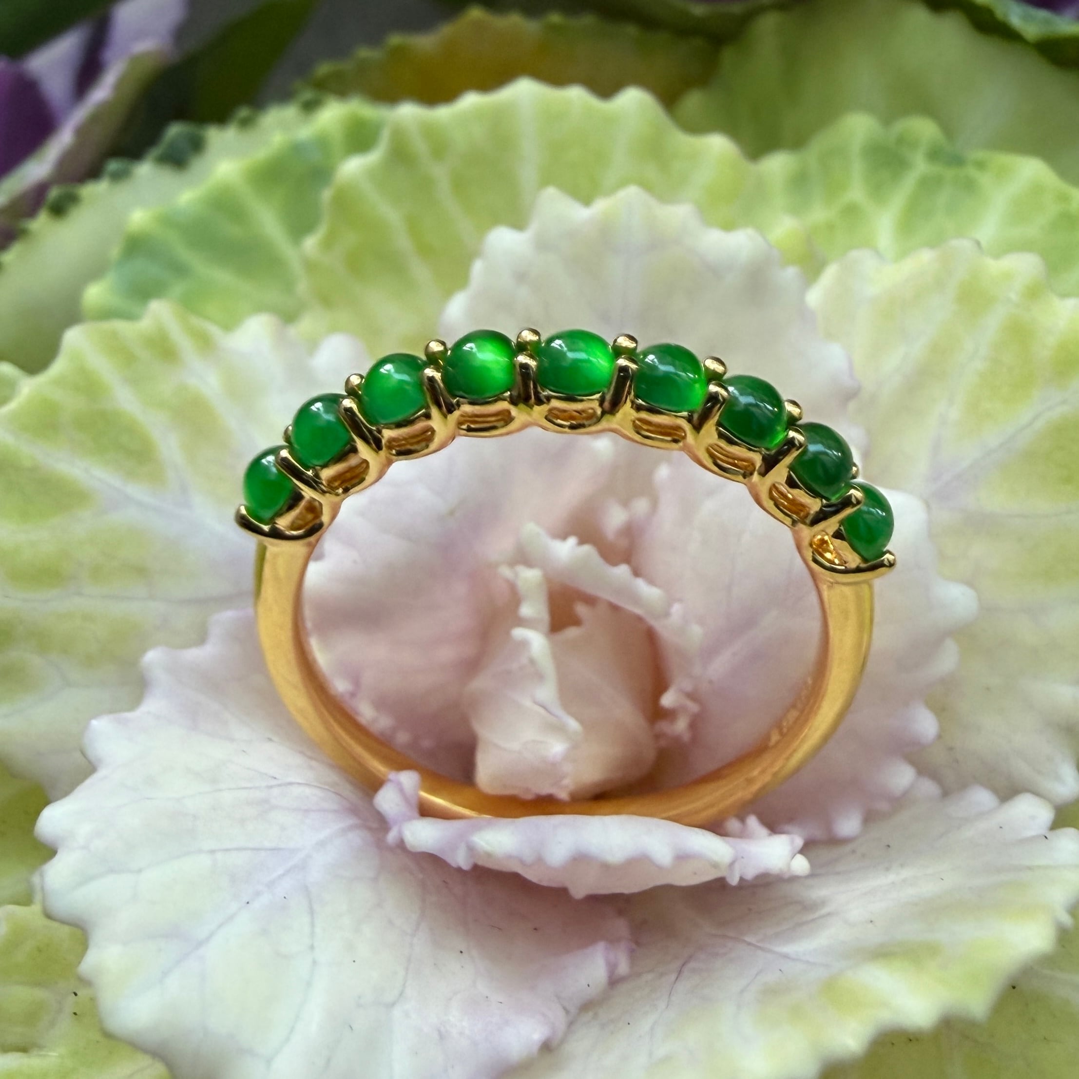 素晴らしい色が特徴の為、この様に小さく磨いても素晴らしい発色でまるで発光しているかの様な美しい緑色が特徴です。天然石でこの様なジュエリーを作る時の苦労はつぶの美しさと、形、色を揃える事。この作業だけであっという間に1日が終わってしまうくらい大変な作業です。そんな苦労を感じさせないくらいうるうるとした瑞々しい緑色のまさに粒よりの翡翠を18金イエローゴールドでリングに仕立ててあります。