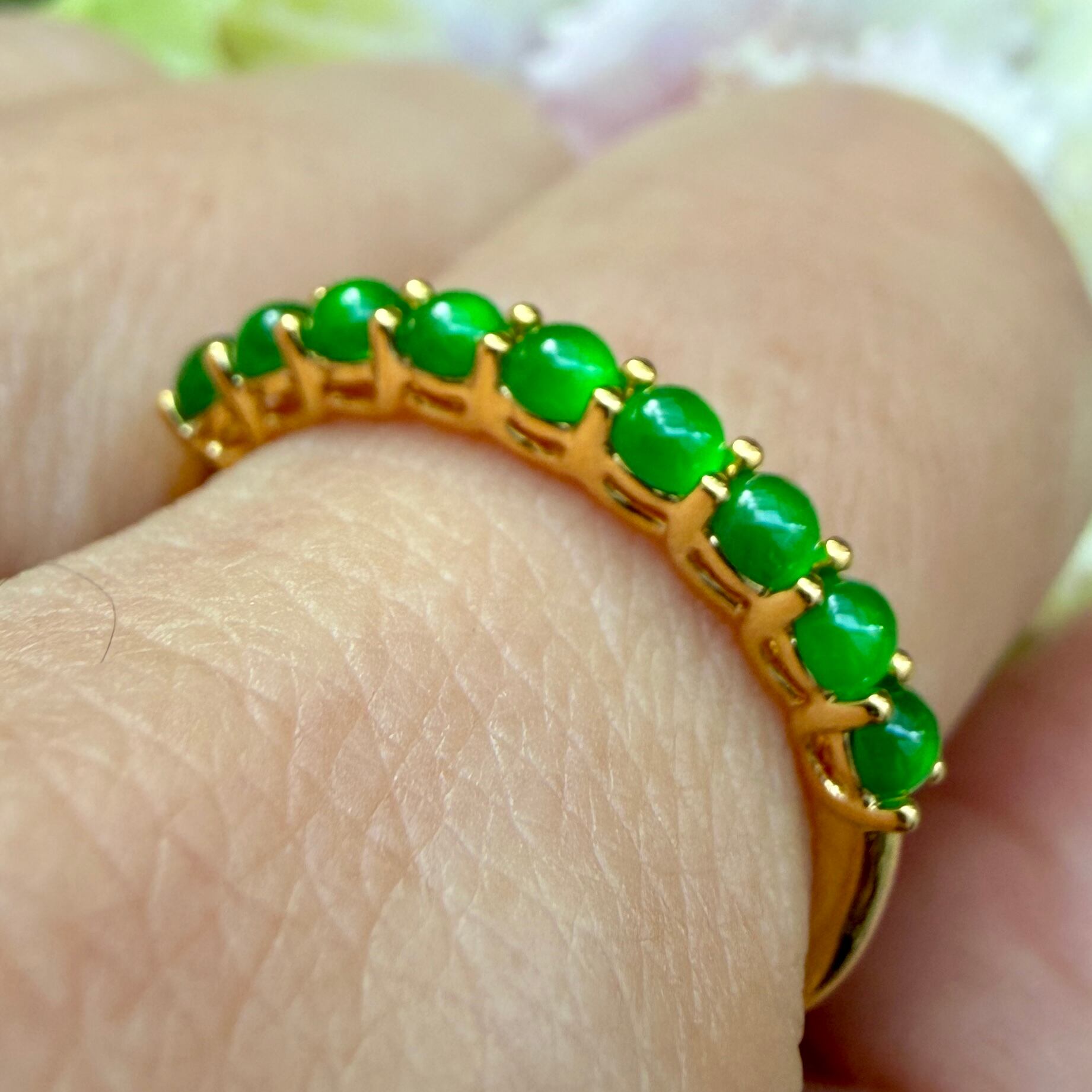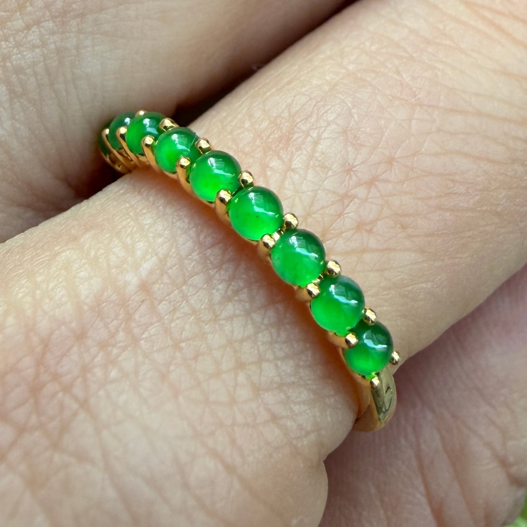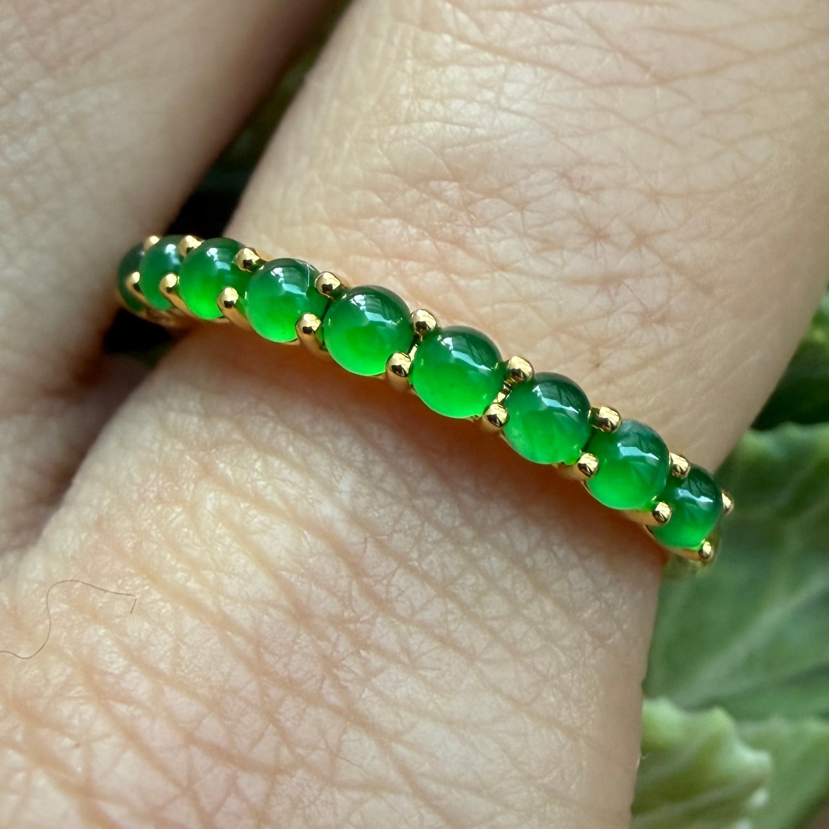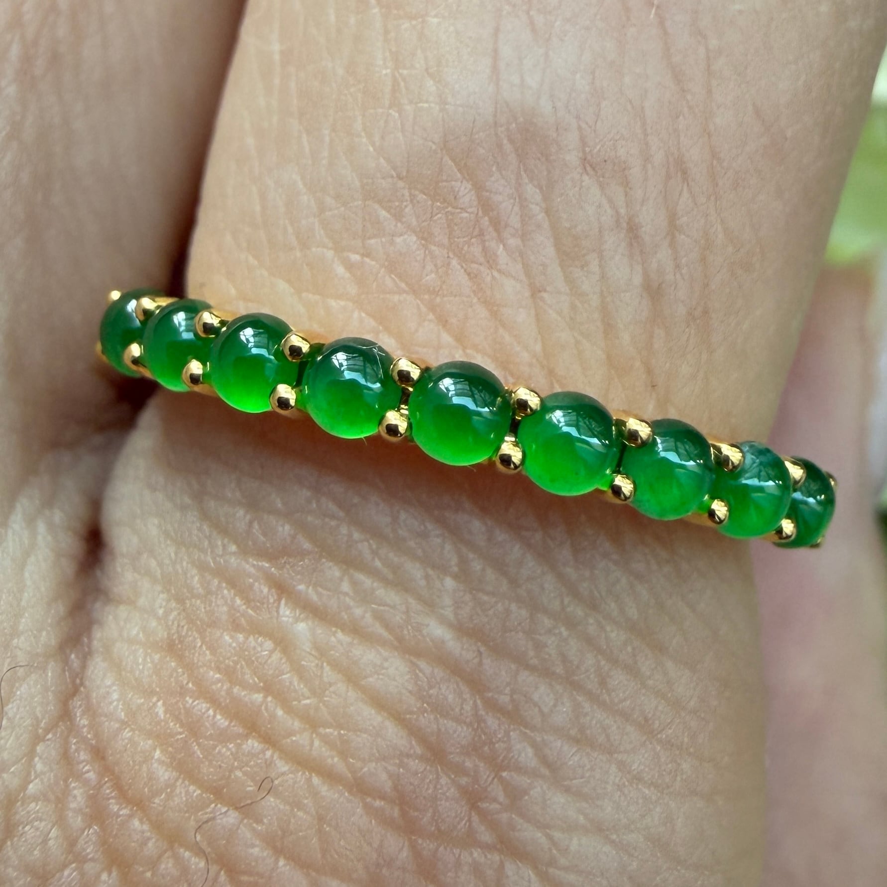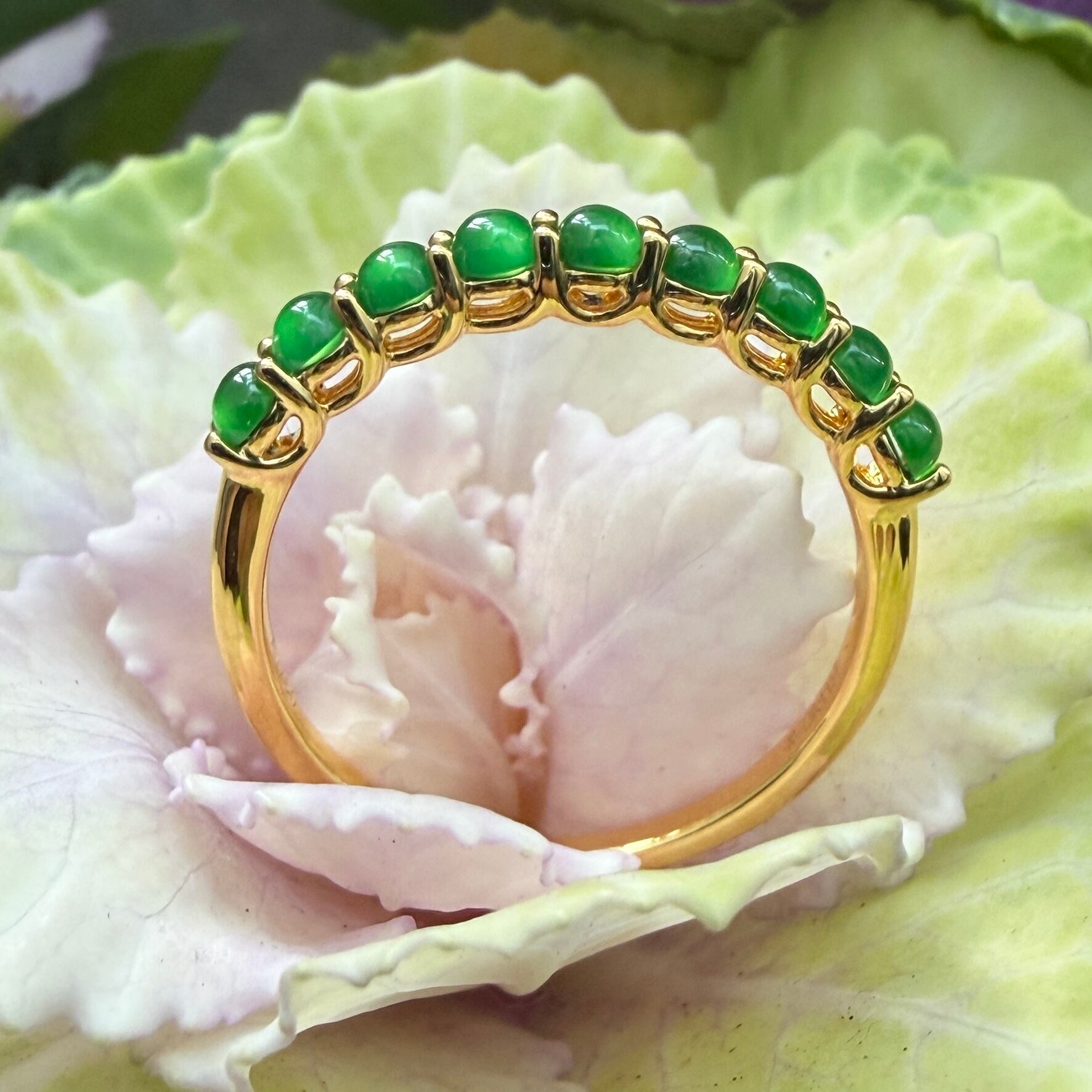 素晴らしい色が特徴の為、この様に小さく磨いても素晴らしい発色でまるで発光しているかの様な美しい緑色が特徴です。天然石でこの様なジュエリーを作る時の苦労はつぶの美しさと、形、色を揃える事。この作業だけであっという間に1日が終わってしまうくらい大変な作業です。そんな苦労を感じさせないくらいうるうるとした瑞々しい緑色のまさに粒よりの翡翠を18金イエローゴールドでリングに仕立ててあります。
