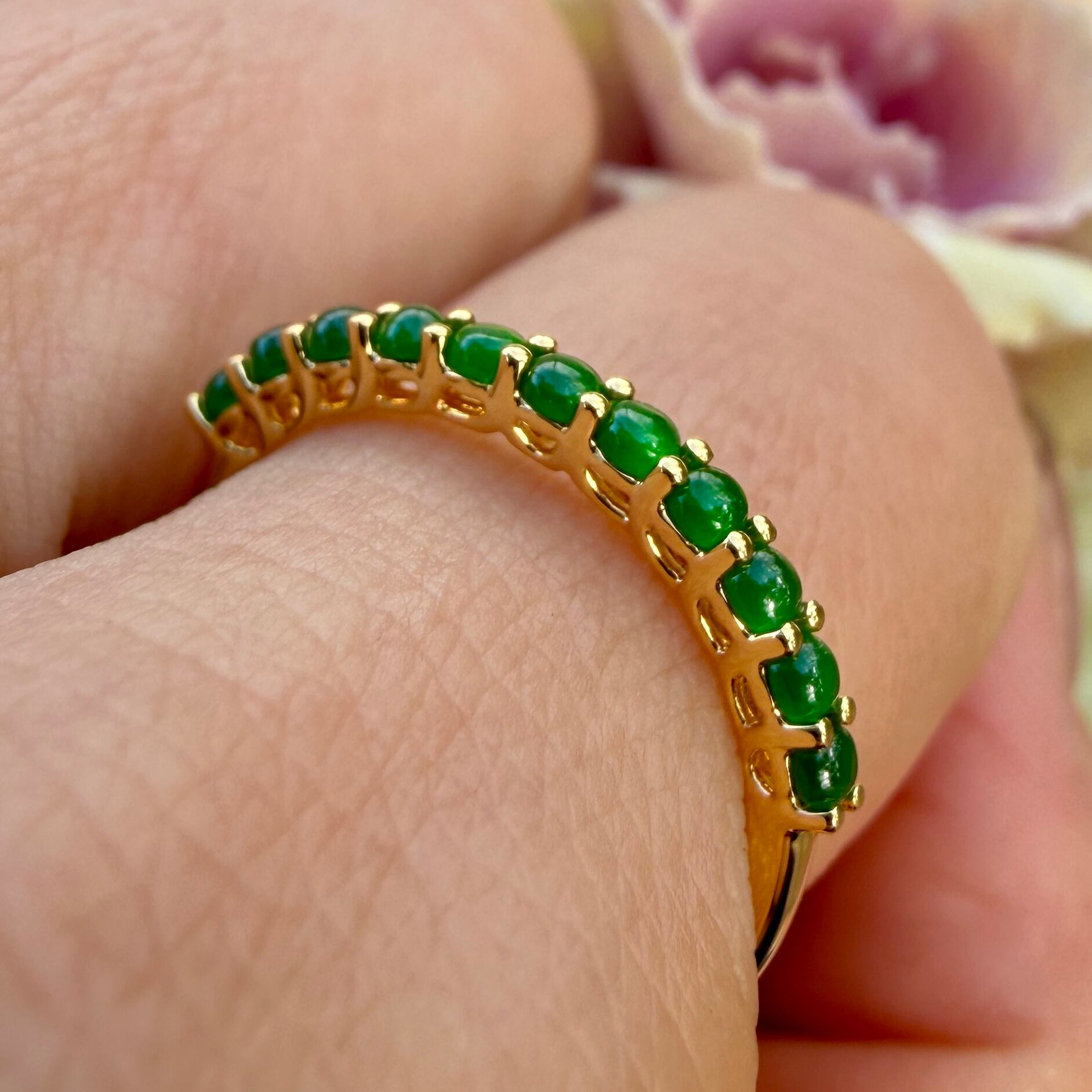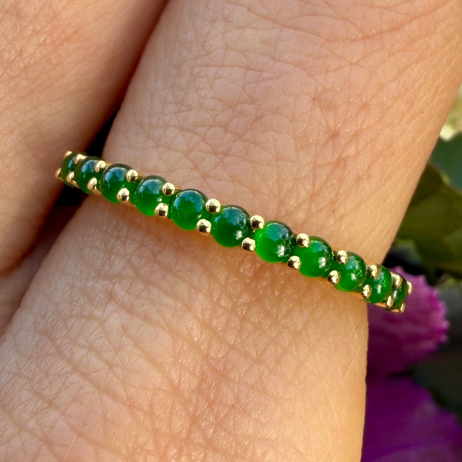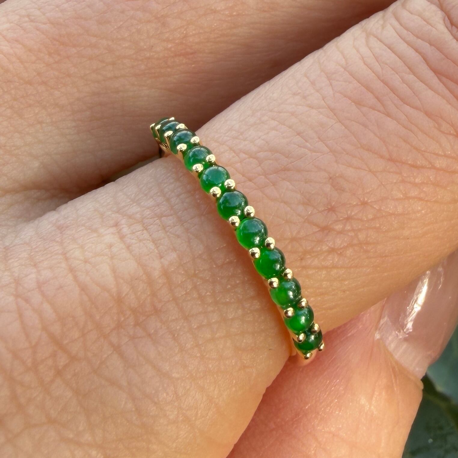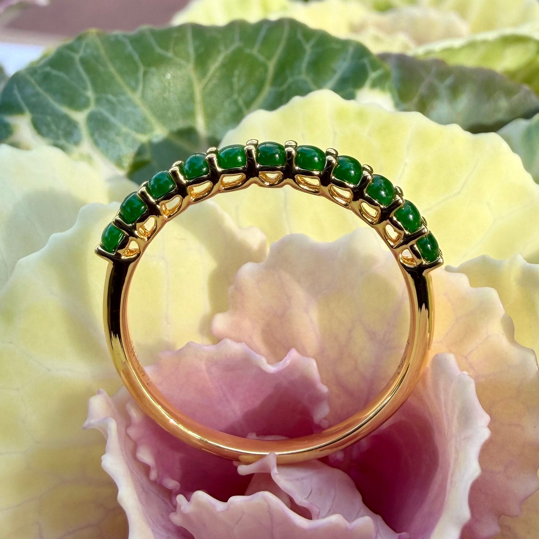 素晴らしい色が特徴の為、この様に小さく磨いても素晴らしい発色でまるで発光しているかの様な美しい緑色が特徴です。天然石でこの様なジュエリーを作る時の苦労はつぶの美しさと、形、色を揃える事。この作業だけであっという間に1日が終わってしまうくらい大変な作業です。そんな苦労を感じさせないくらいうるうるとした瑞々しい緑色のまさに粒よりの翡翠を18金イエローゴールドでリングに仕立ててあります。