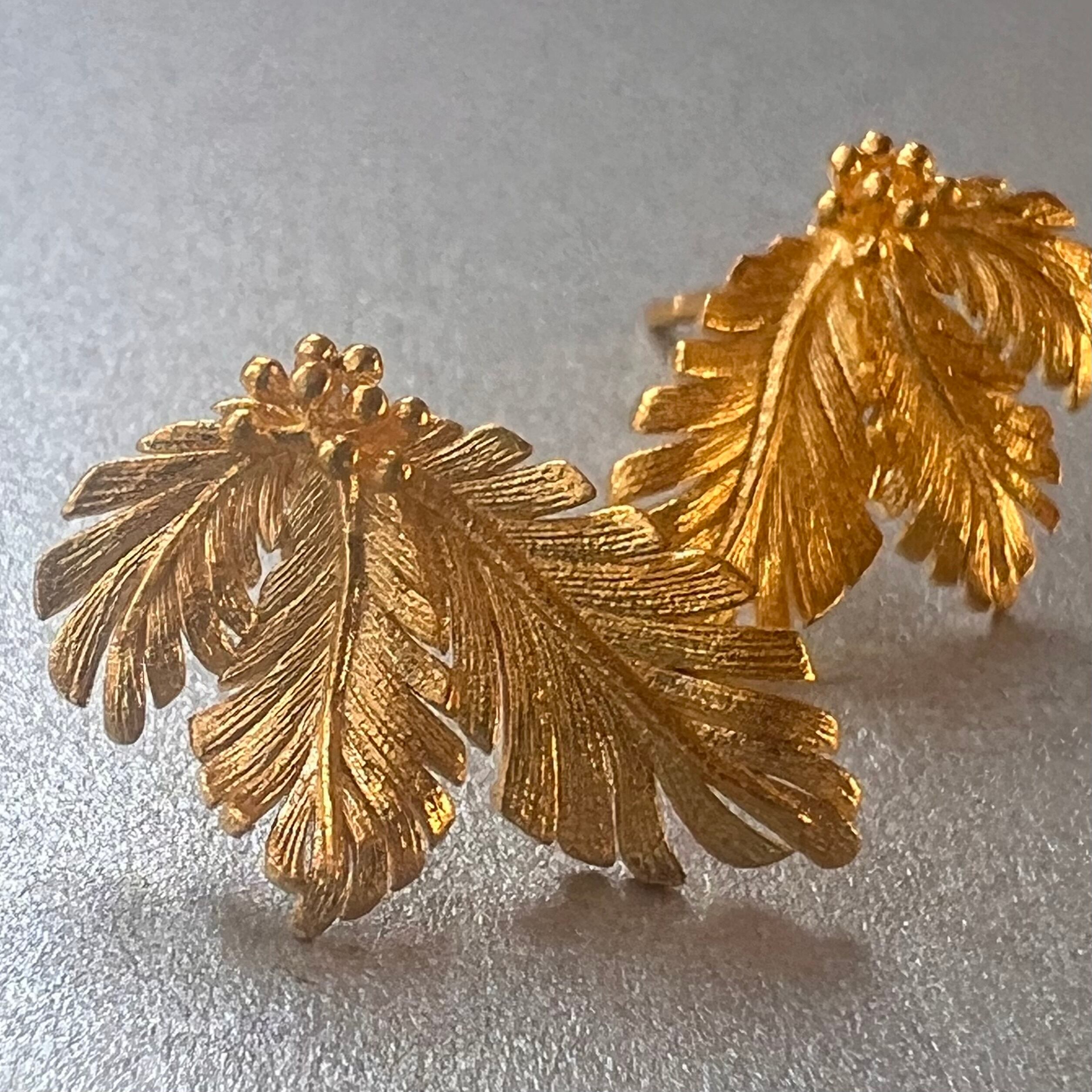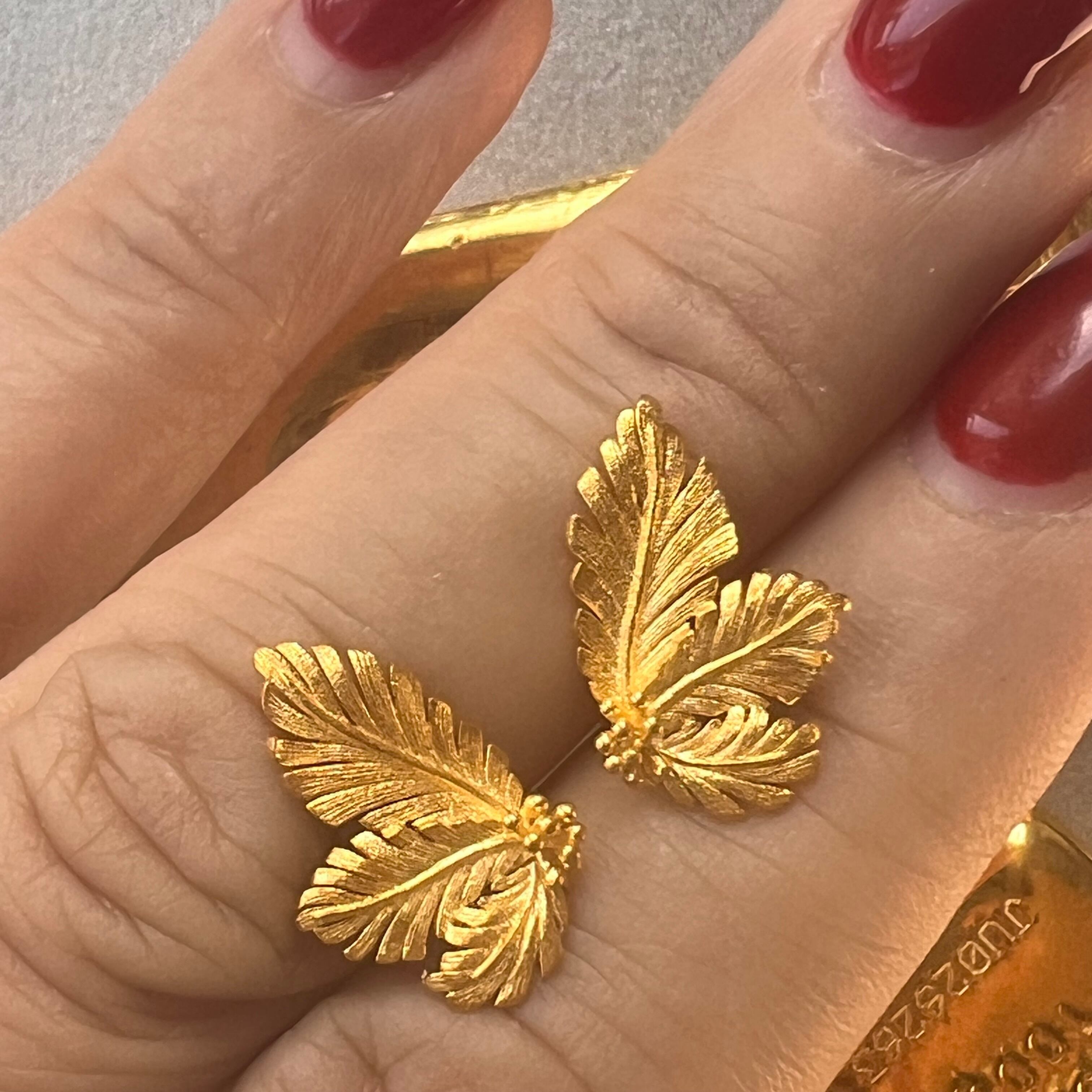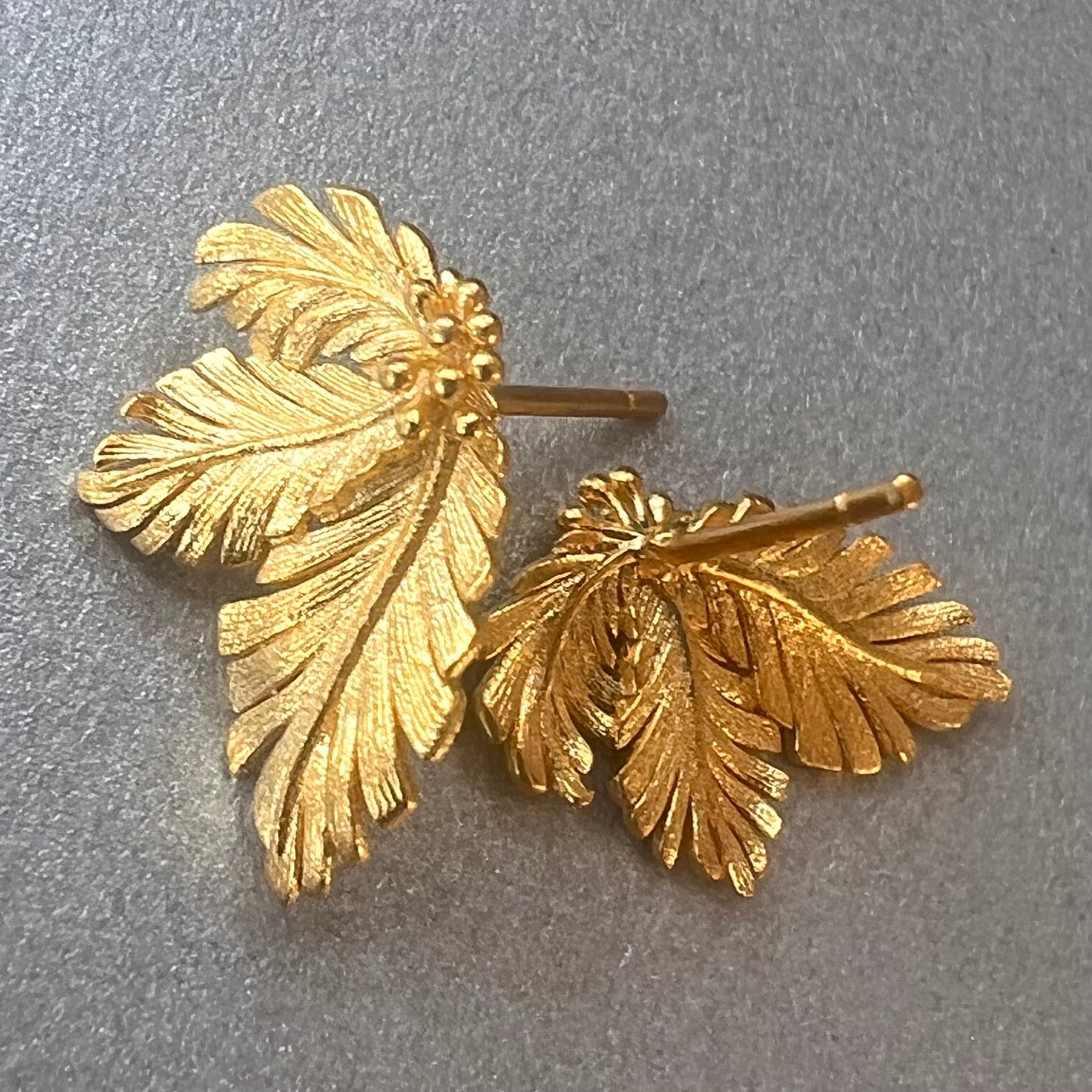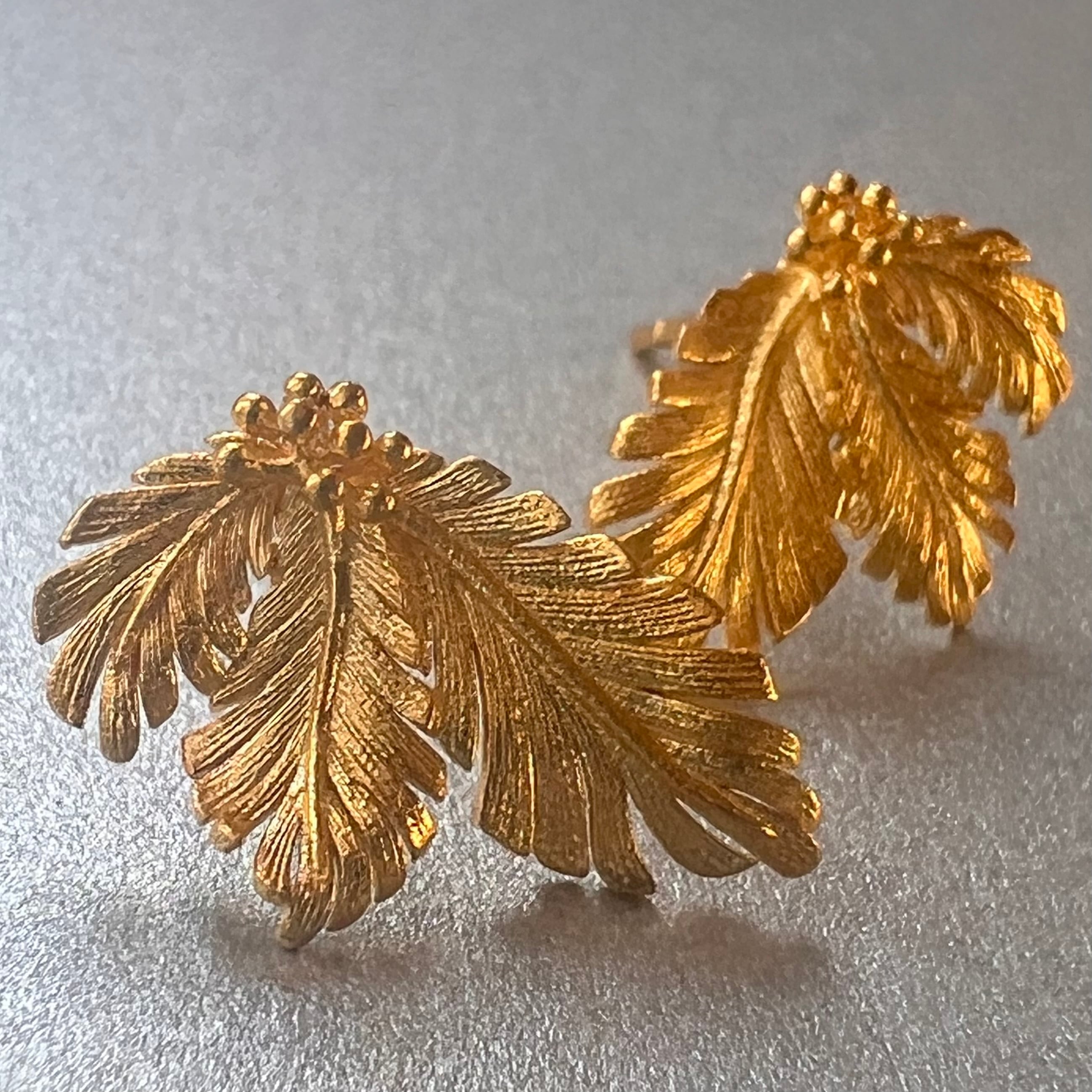 とても美しい24金、純金で出来た手作りの美しい葉っぱと実のデザインのピアスです。