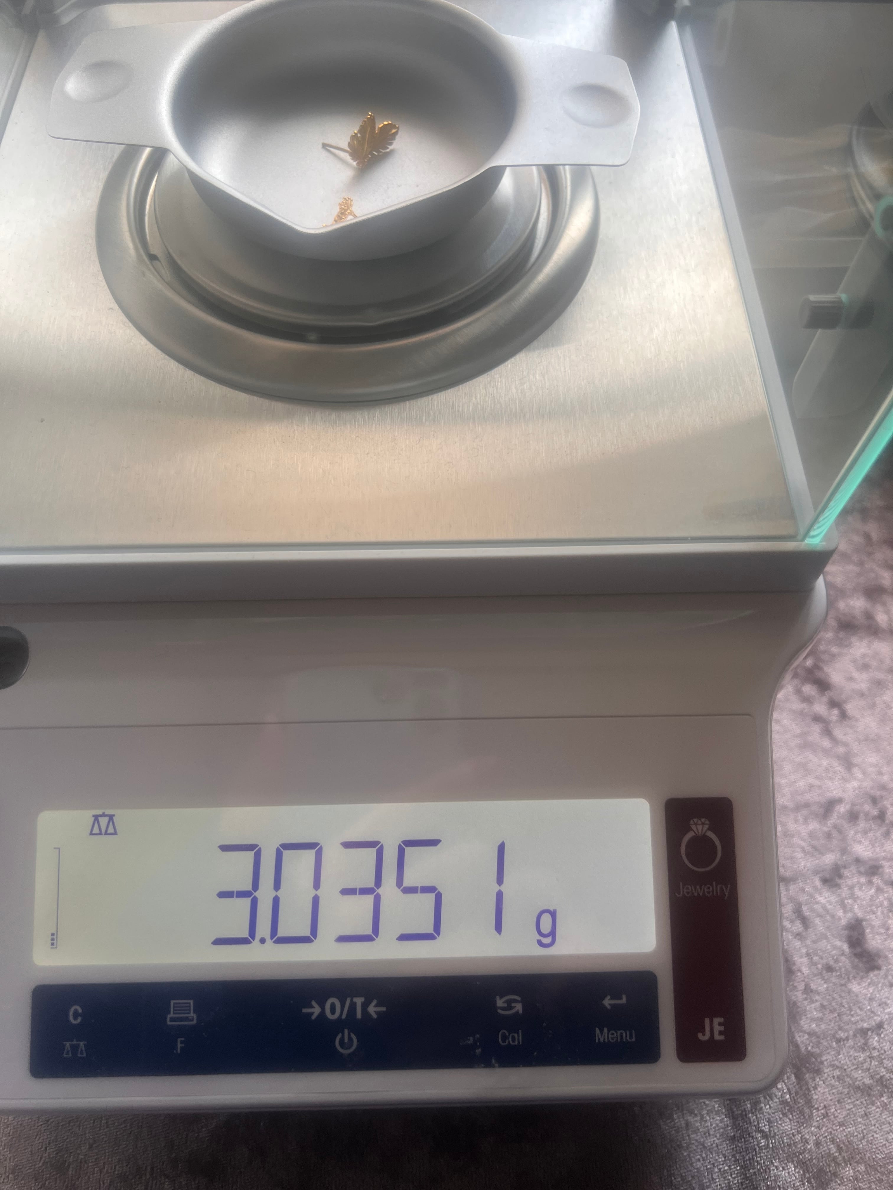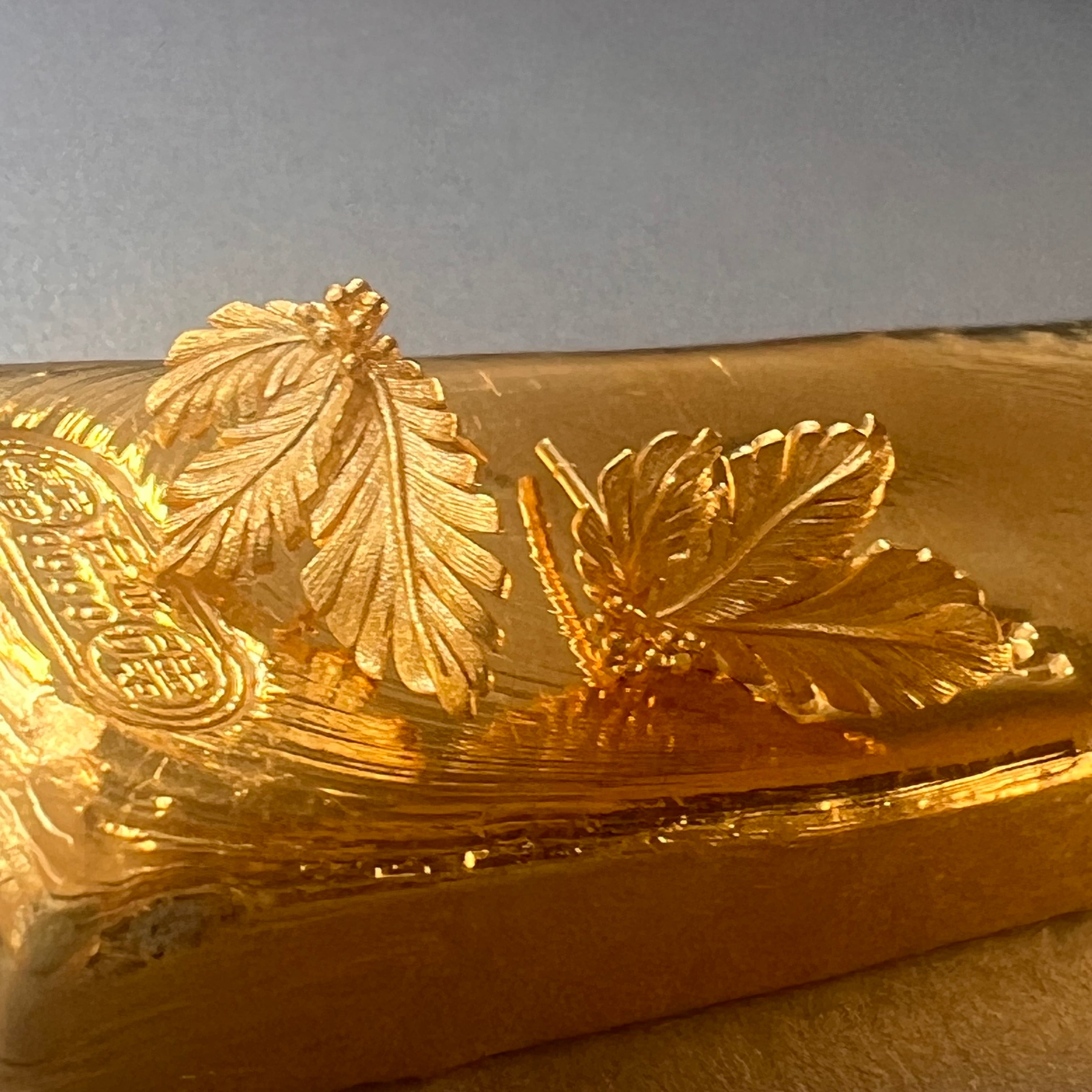 イギリスの大学で金属工芸を専門に学んでいたので金属の加工法に非常に興味があり、従来では柔らかい金属である事から24金のジュエリーは日本ではあまり好まれないと言う事で暫く敬遠していました。しかしながら資産性や何よりもこの美しい純金の色、また最近の技法で今までよりも圧倒的に強度を高めた作り方とこの繊細な美しい葉っぱの葉脈のディテールに心惹かれ仕入れて見ました。撮影の為友人の金を扱うゴールド商から金の延べ棒を借りて一緒に撮影してみましたが、ああ!やっぱり金って素敵!