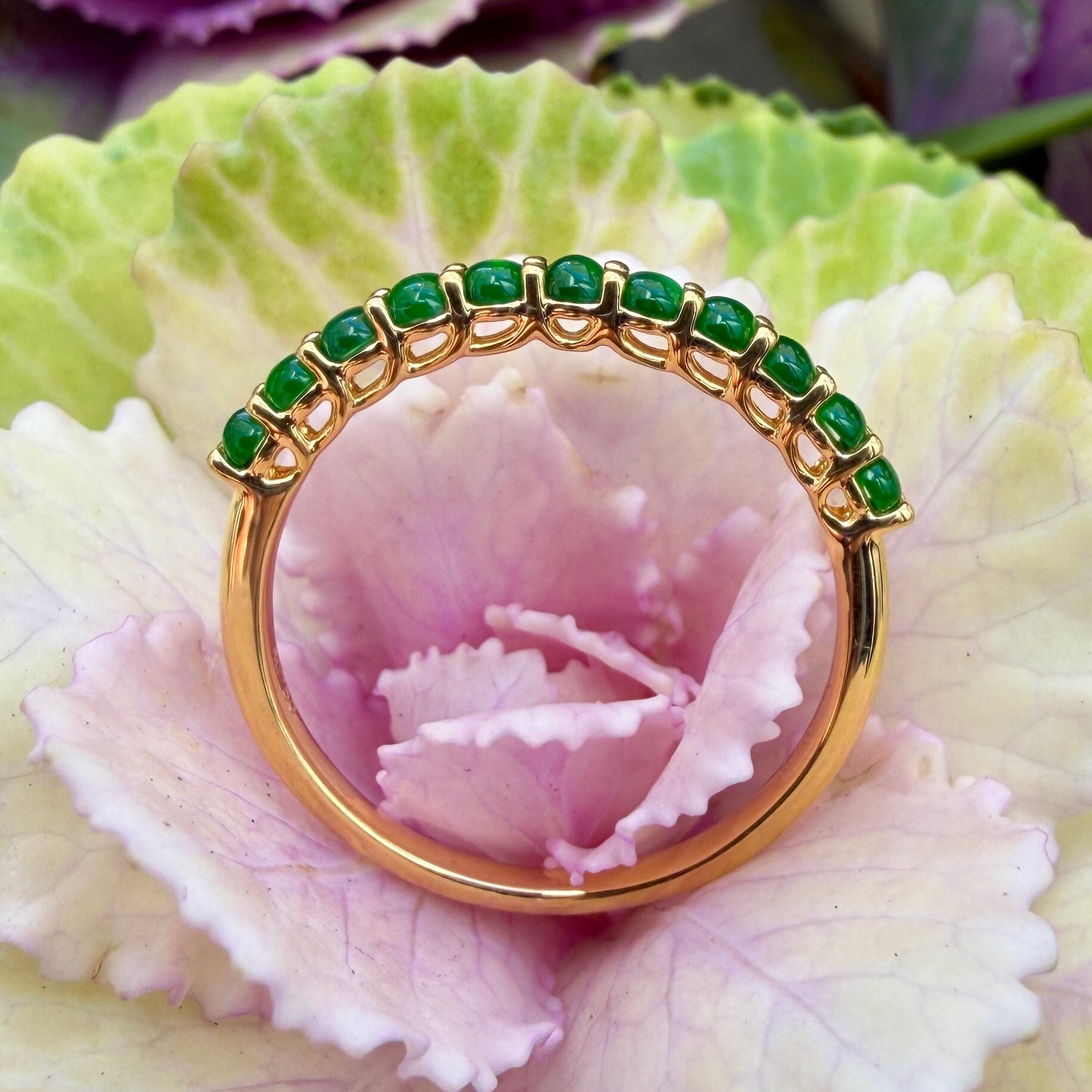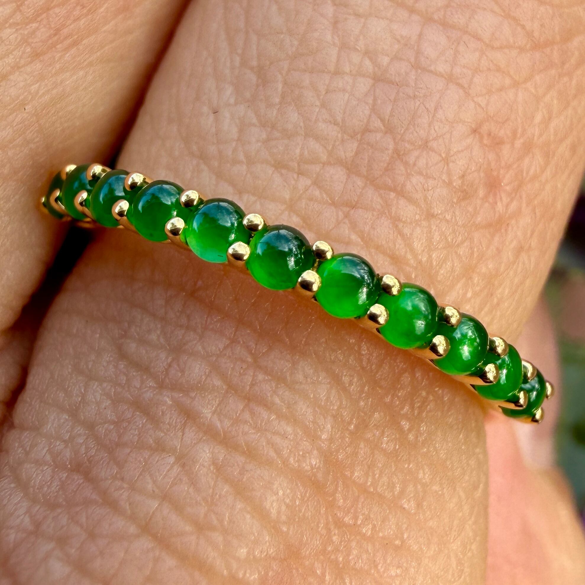素晴らしい色が特徴の為、この様に小さく磨いても素晴らしい発色でまるで発光しているかの様な美しい緑色が特徴です。天然石でこの様なジュエリーを作る時の苦労はつぶの美しさと、形、色を揃える事。この作業だけであっという間に1日が終わってしまうくらい大変な作業です。そんな苦労を感じさせないくらいうるうるとした瑞々しい緑色のまさに粒よりの翡翠を18金イエローゴールドでリングに仕立ててあります。