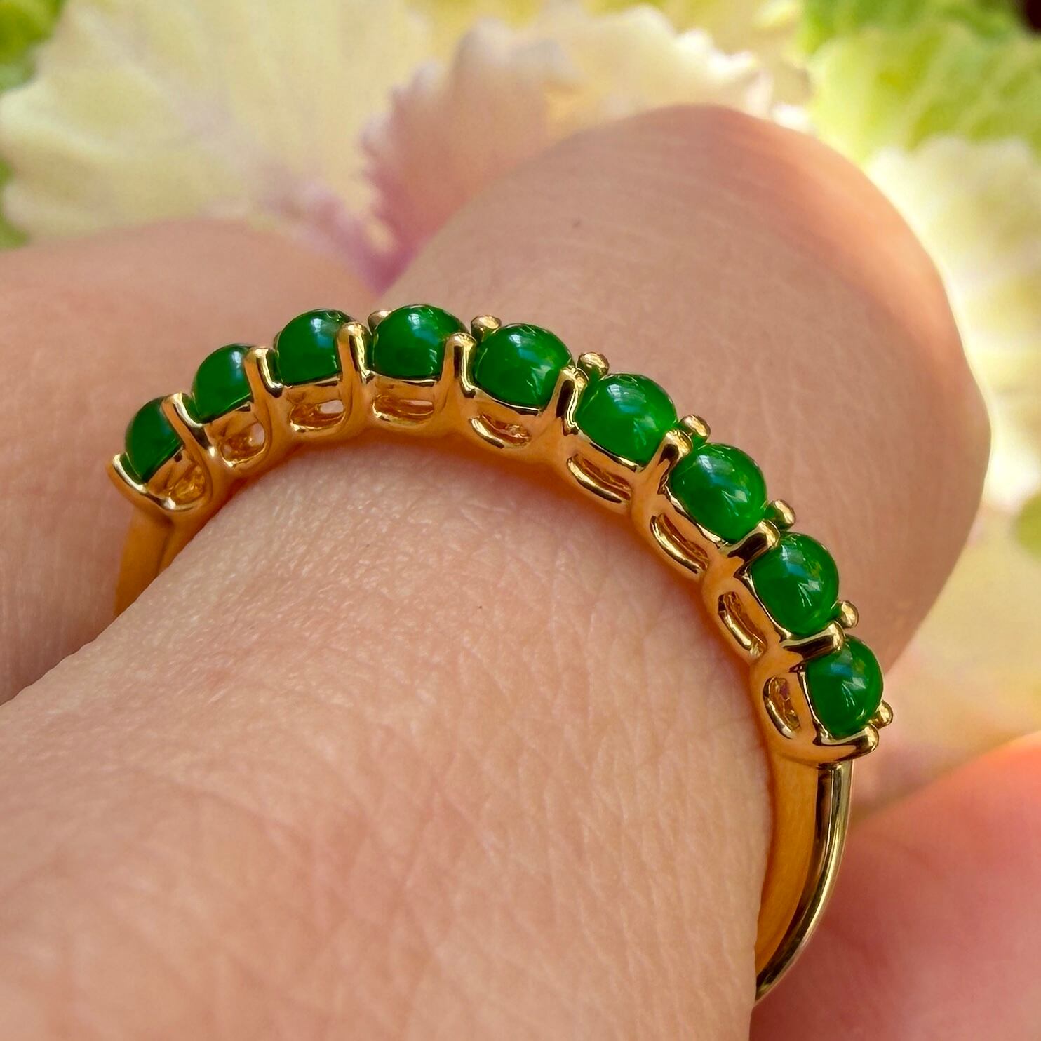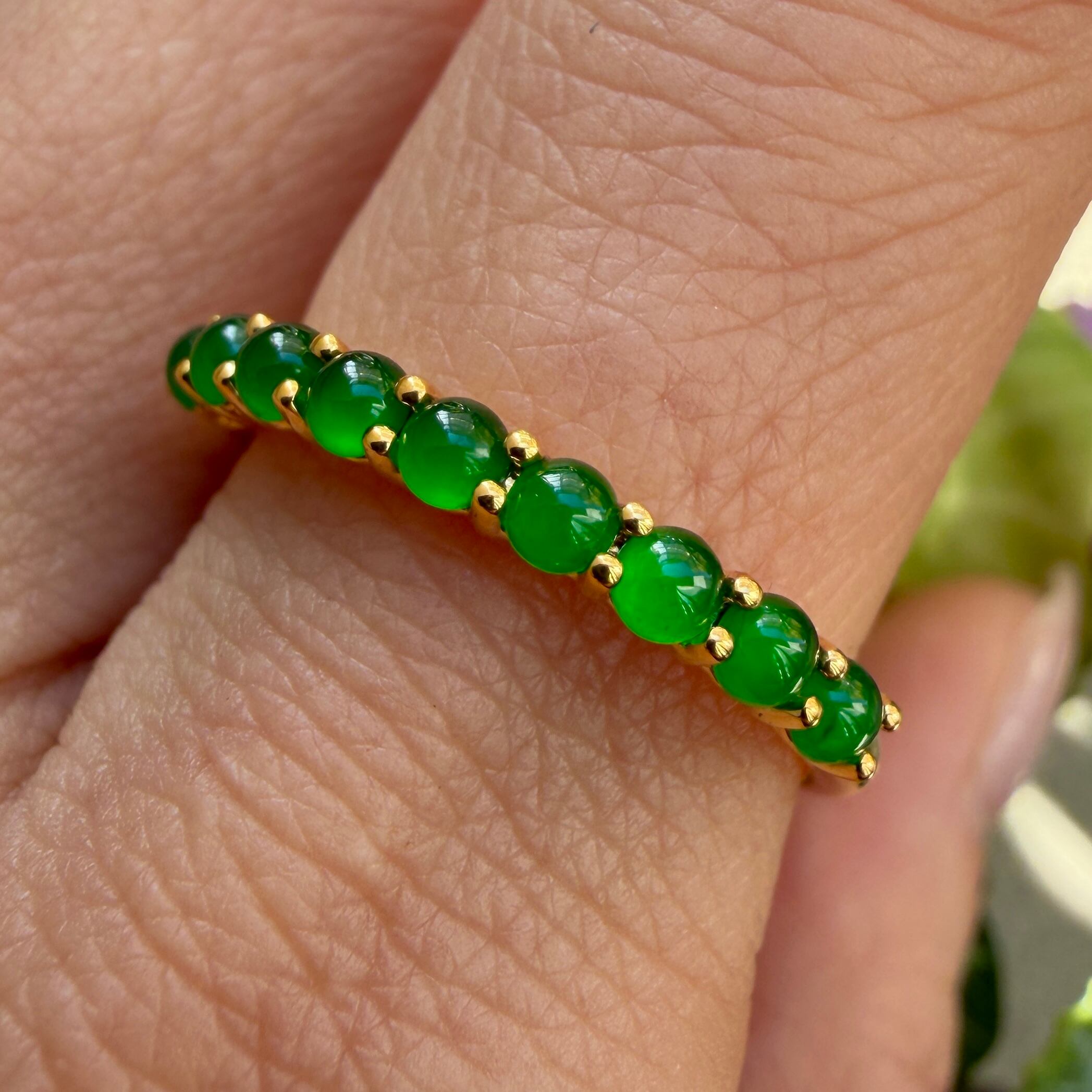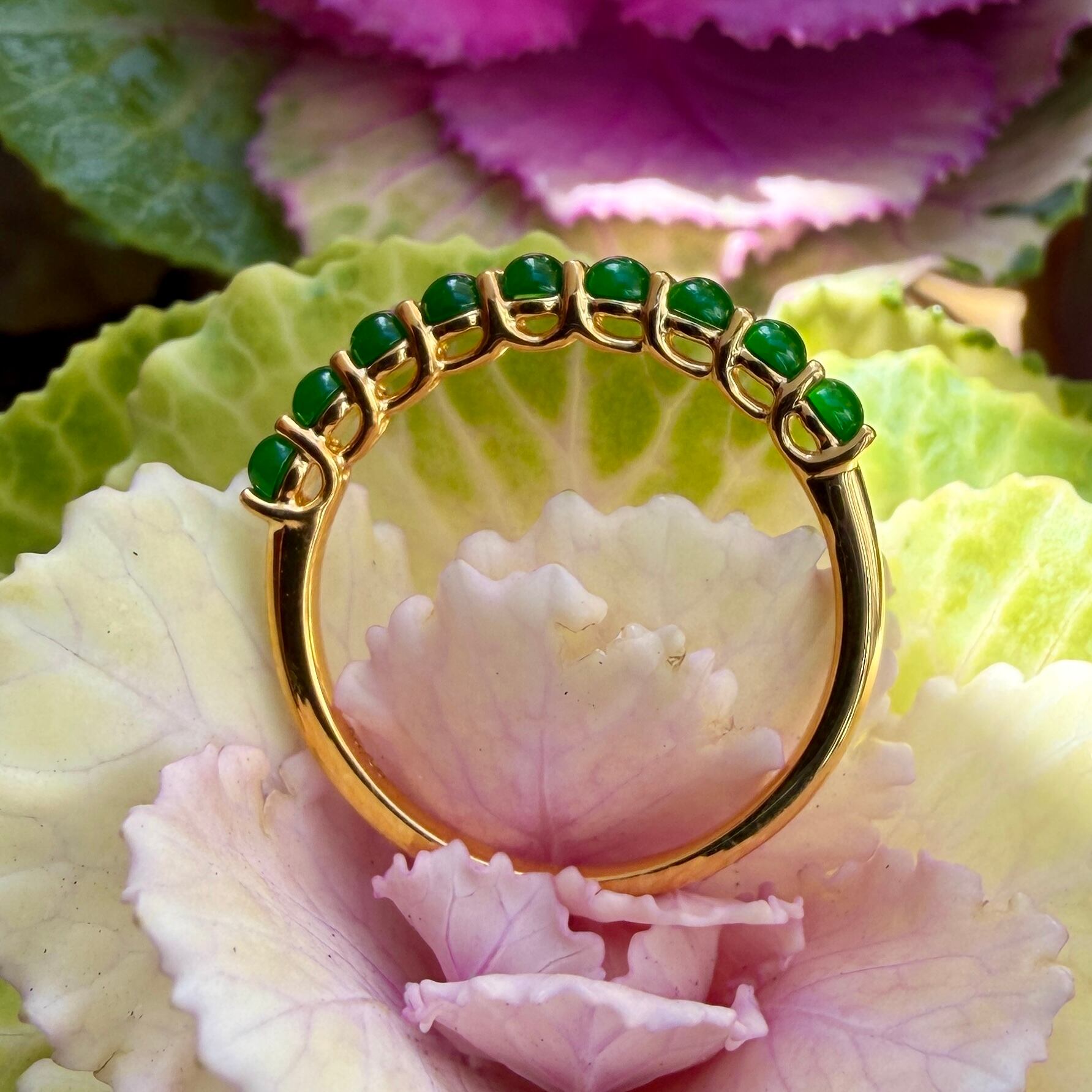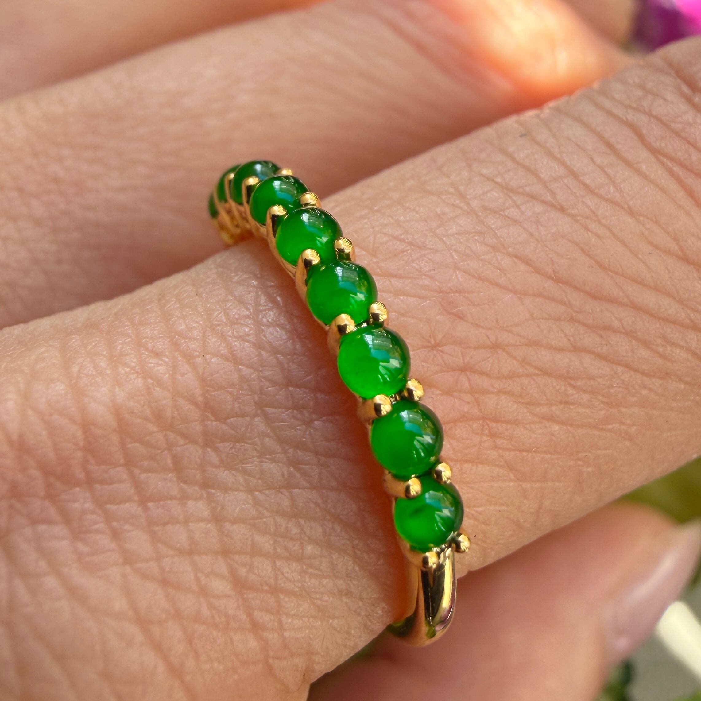 素晴らしい色が特徴の為、この様に小さく磨いても素晴らしい発色でまるで発光しているかの様な美しい緑色が特徴です。天然石でこの様なジュエリーを作る時の苦労はつぶの美しさと、形、色を揃える事。この作業だけであっという間に1日が終わってしまうくらい大変な作業です。そんな苦労を感じさせないくらいうるうるとした瑞々しい緑色のまさに粒よりの翡翠を18金イエローゴールドでリングに仕立ててあります。