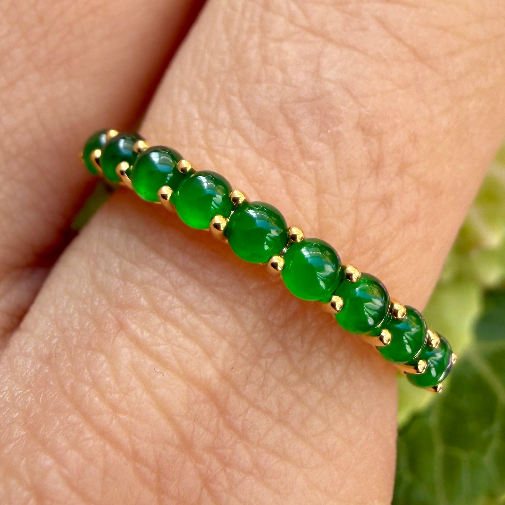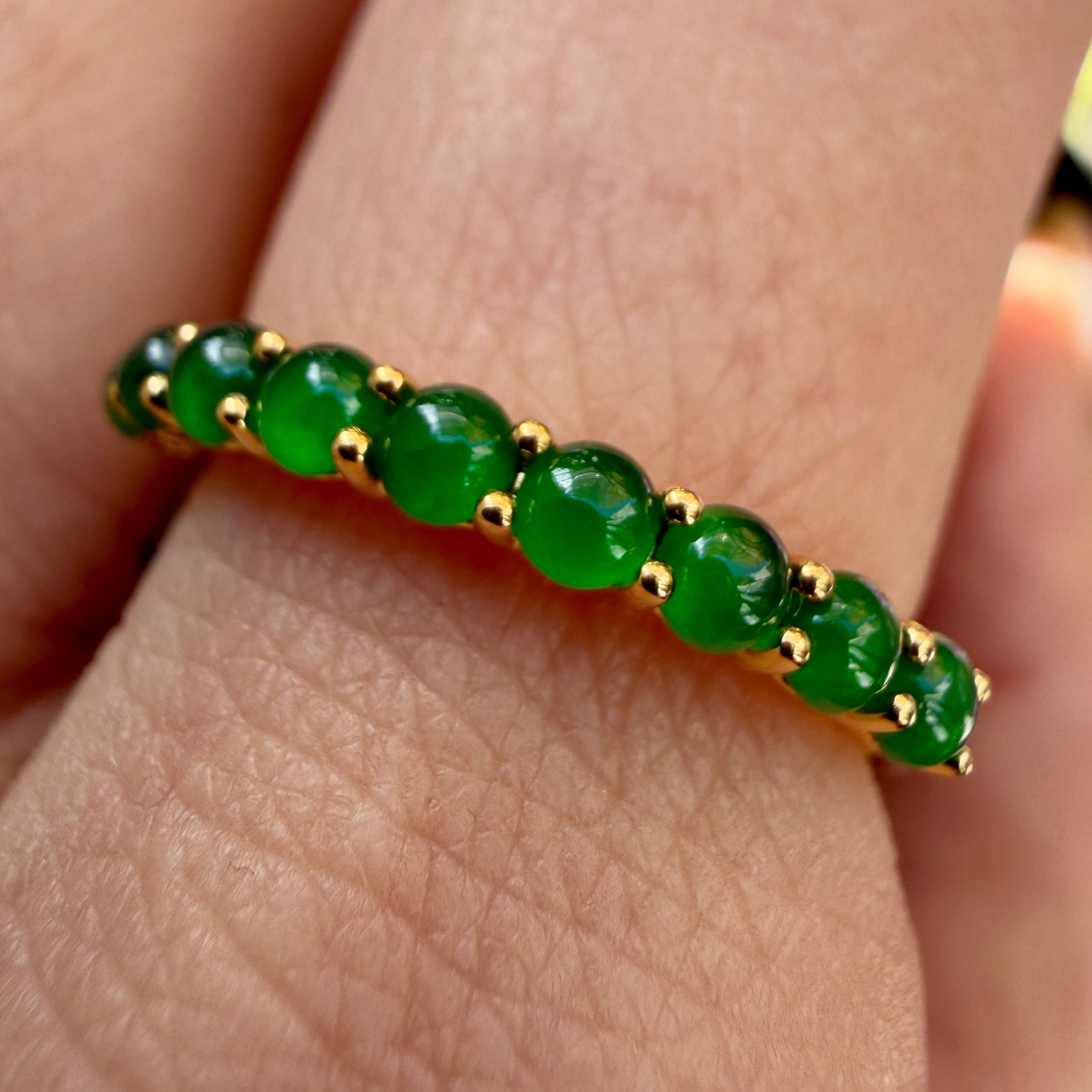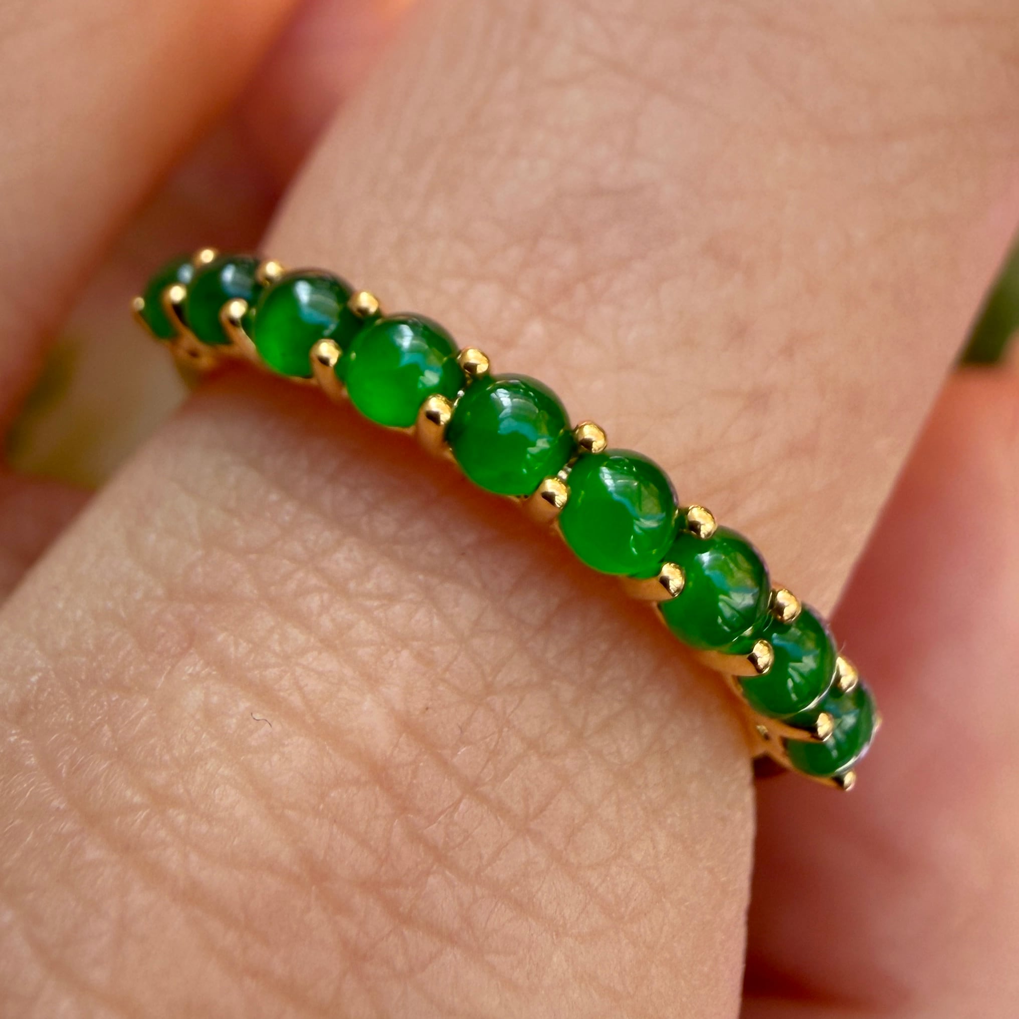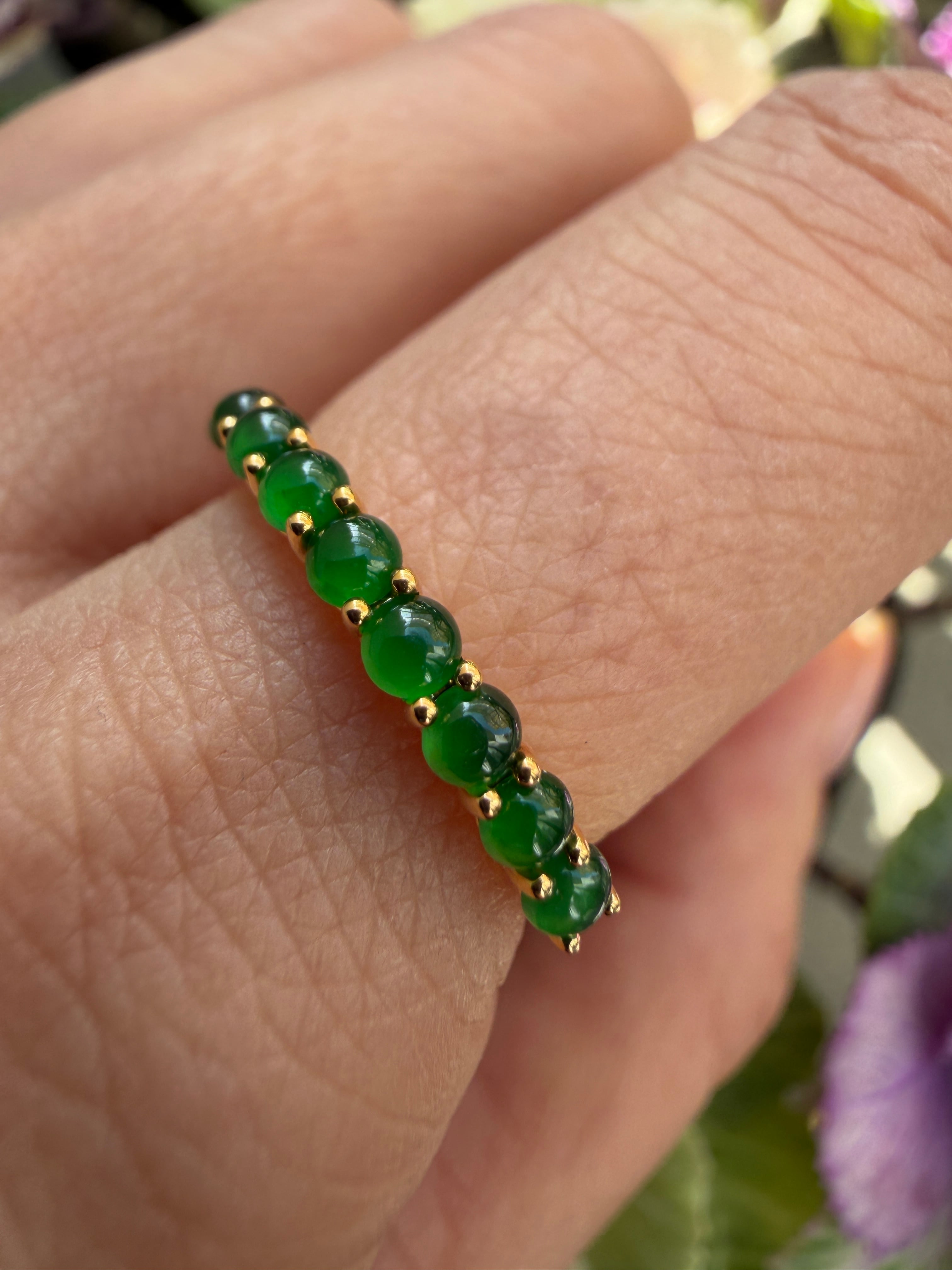 素晴らしい色が特徴の為、この様に小さく磨いても素晴らしい発色でまるで発光しているかの様な美しい緑色が特徴です。天然石でこの様なジュエリーを作る時の苦労はつぶの美しさと、形、色を揃える事。この作業だけであっという間に1日が終わってしまうくらい大変な作業です。そんな苦労を感じさせないくらいうるうるとした瑞々しい緑色のまさに粒よりの翡翠を18金イエローゴールドでリングに仕立ててあります。