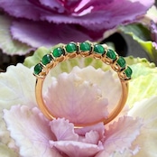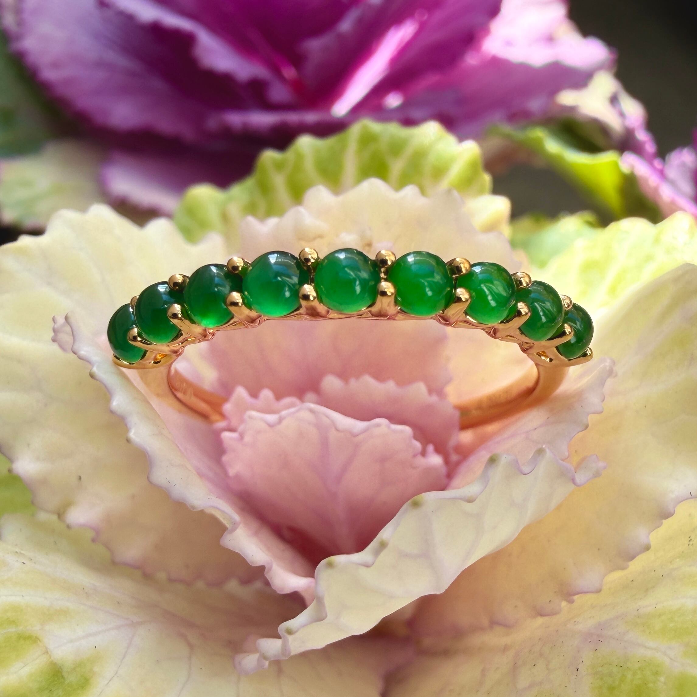 素晴らしい色が特徴の為、この様に小さく磨いても素晴らしい発色でまるで発光しているかの様な美しい緑色が特徴です。天然石でこの様なジュエリーを作る時の苦労はつぶの美しさと、形、色を揃える事。この作業だけであっという間に1日が終わってしまうくらい大変な作業です。そんな苦労を感じさせないくらいうるうるとした瑞々しい緑色のまさに粒よりの翡翠を18金イエローゴールドでリングに仕立ててあります。