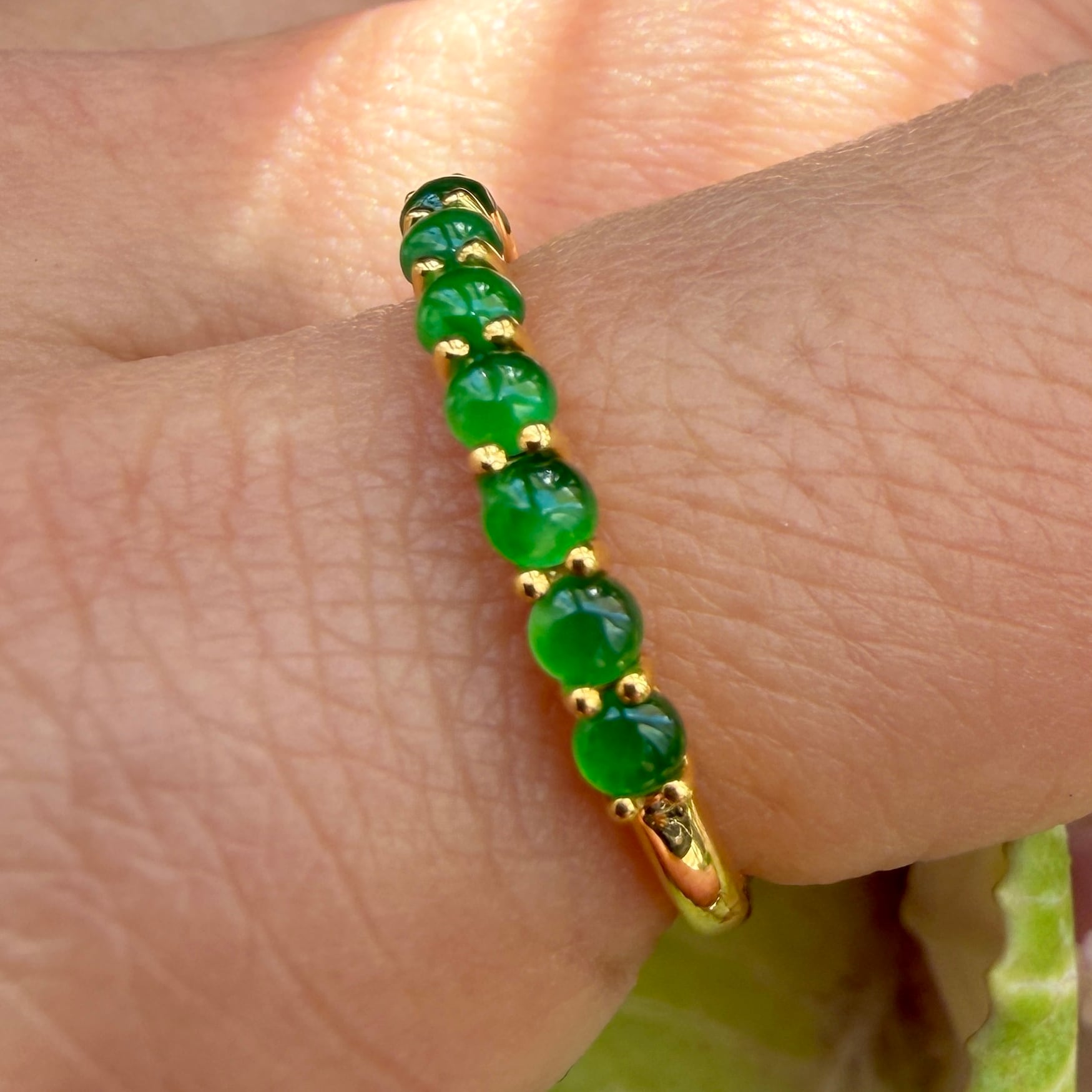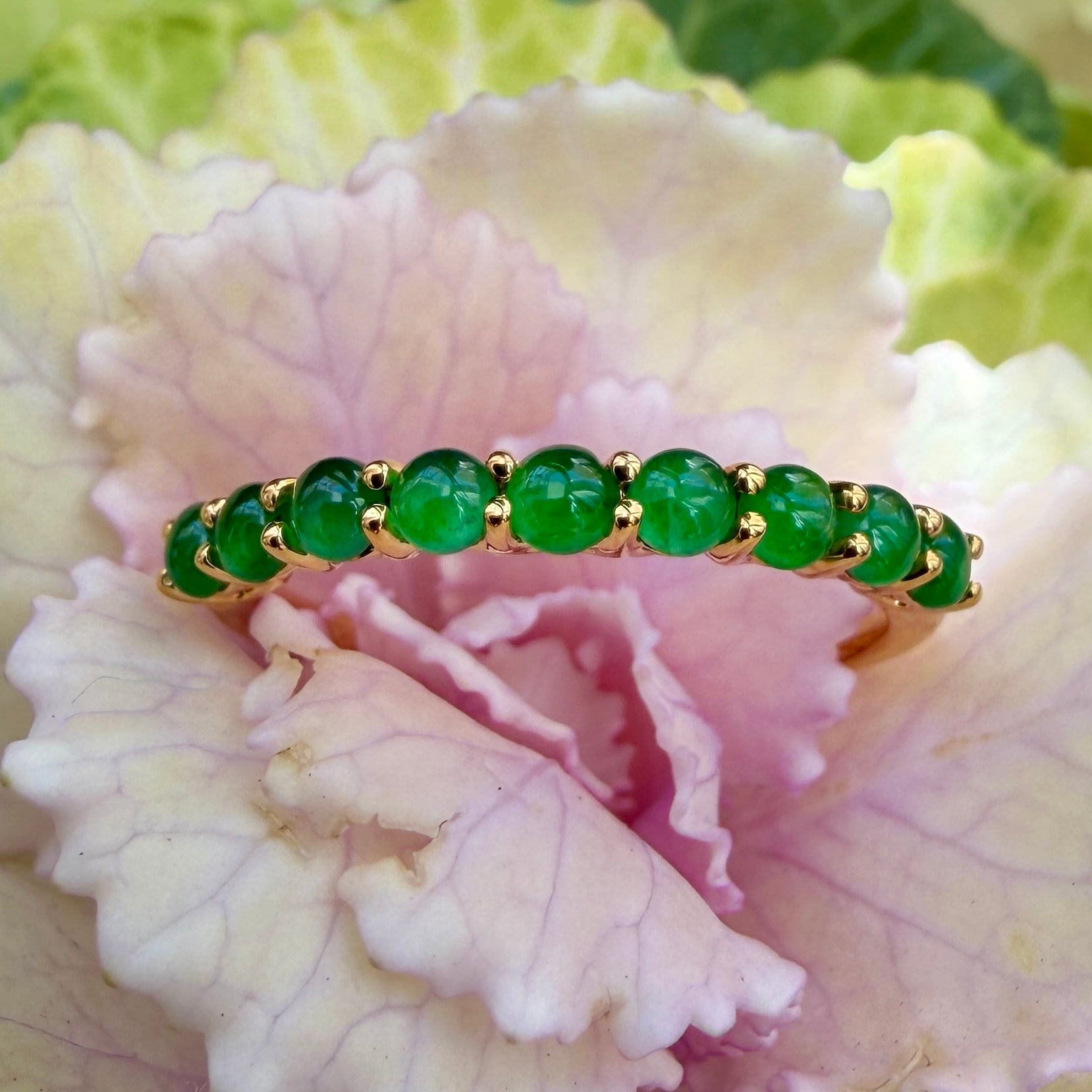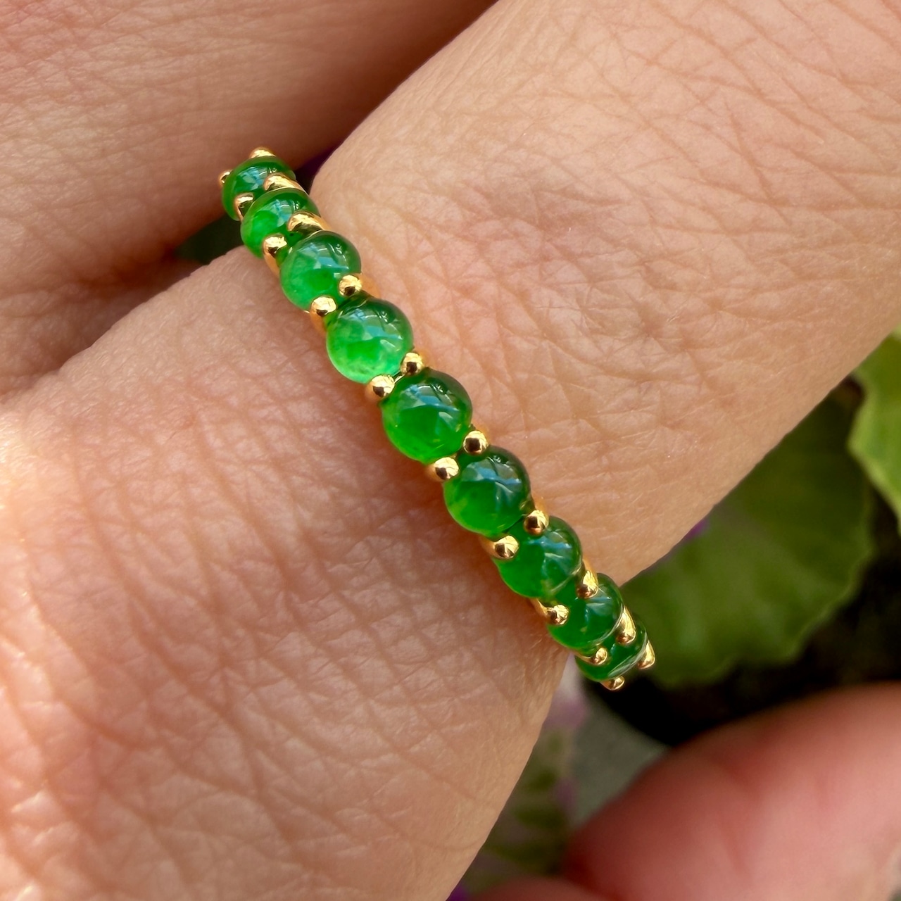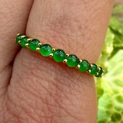 素晴らしい色が特徴の為、この様に小さく磨いても素晴らしい発色でまるで発光しているかの様な美しい緑色が特徴です。天然石でこの様なジュエリーを作る時の苦労はつぶの美しさと、形、色を揃える事。この作業だけであっという間に1日が終わってしまうくらい大変な作業です。そんな苦労を感じさせないくらいうるうるとした瑞々しい緑色のまさに粒よりの翡翠を18金イエローゴールドでリングに仕立ててあります。