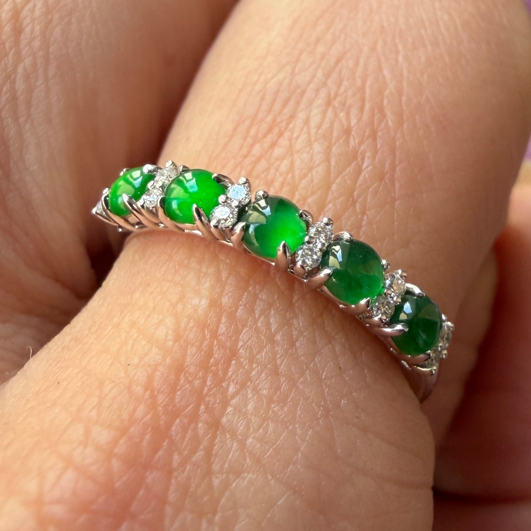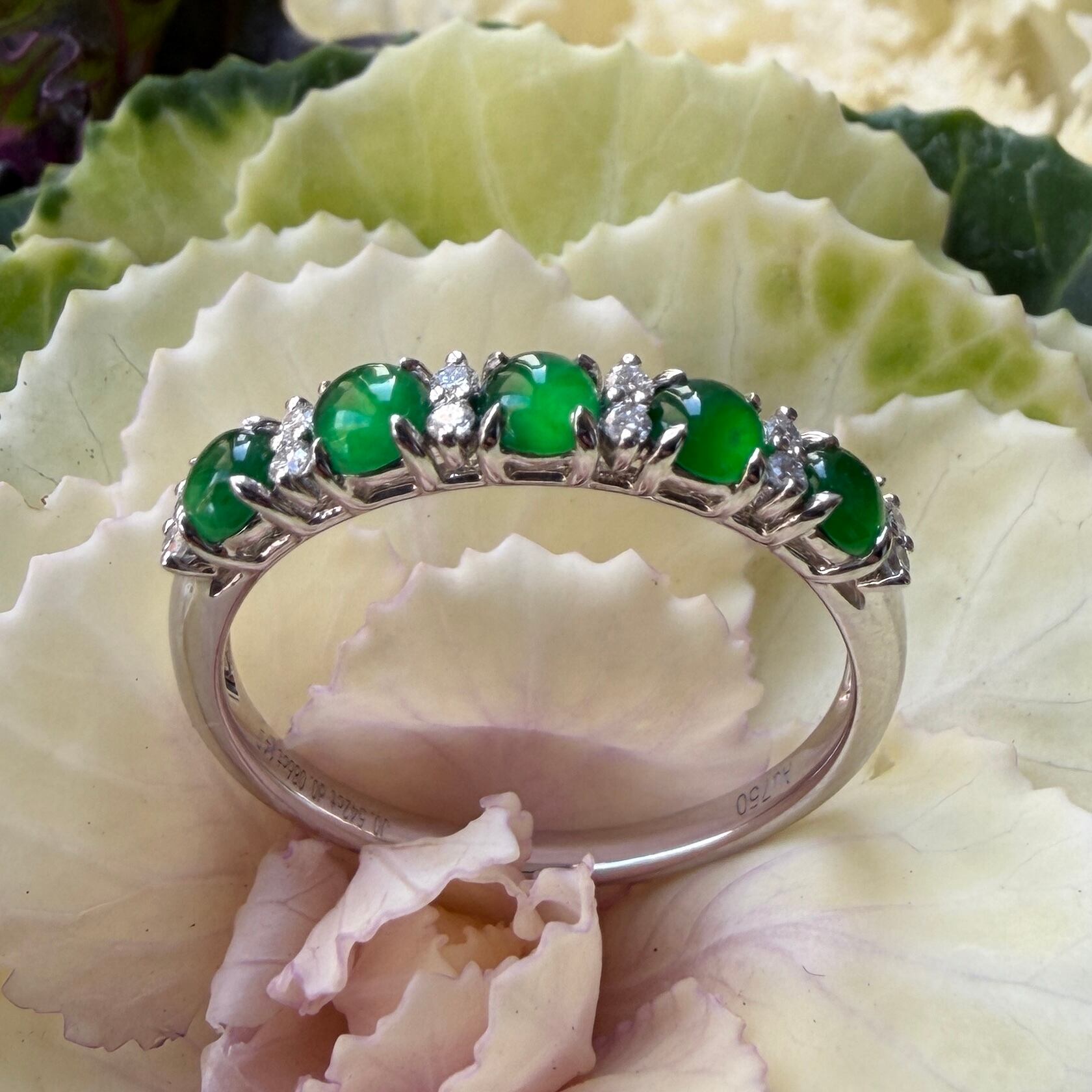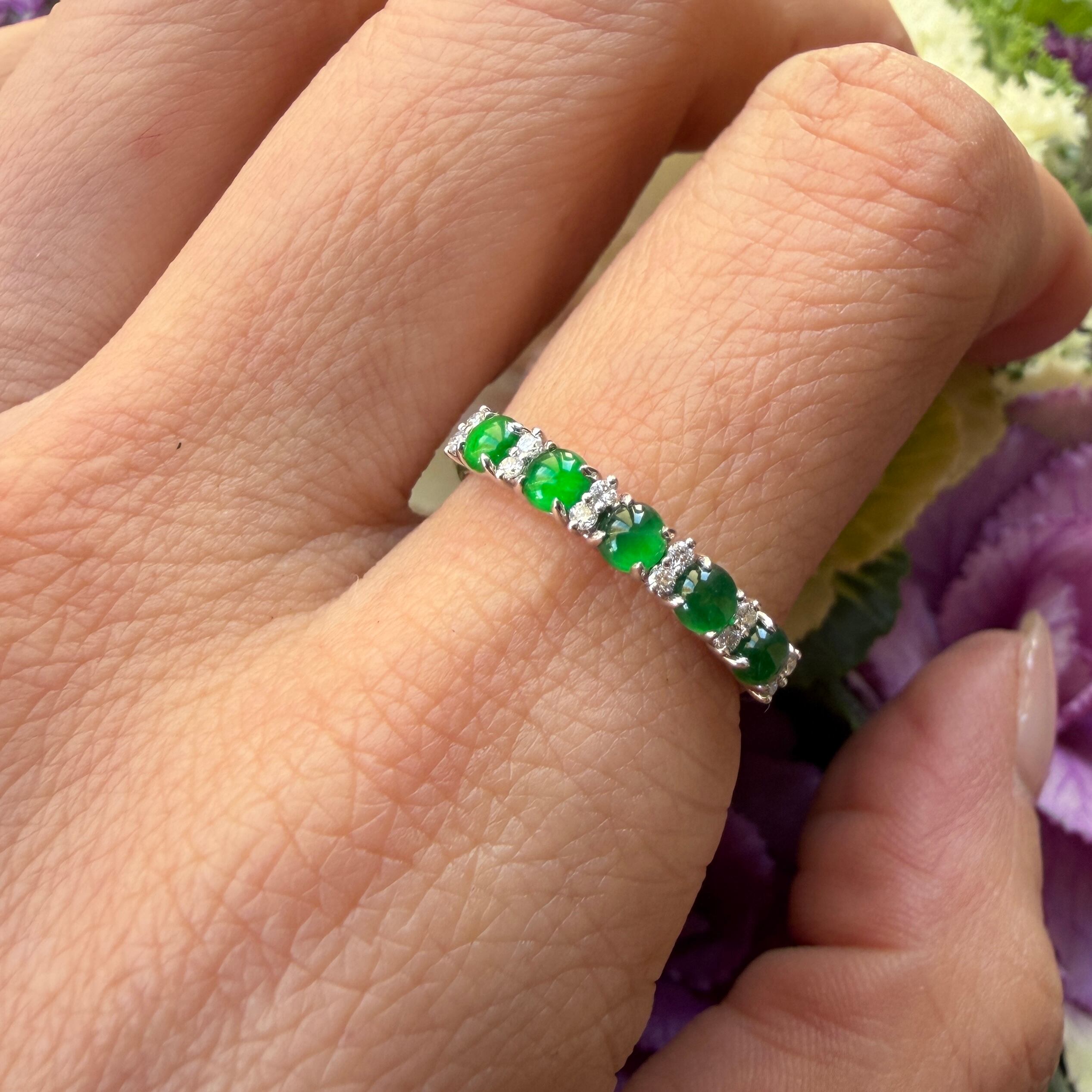 素晴らしい色が特徴の為、この様に小さく磨いても素晴らしい発色でまるで発光しているかの様な美しい緑色が特徴です。天然石でこの様なジュエリーを作る時の苦労はつぶの美しさと、形、色を揃える事。この作業だけであっという間に1日が終わってしまうくらい大変な作業です。そんな苦労を感じさせないくらいうるうるとした瑞々しい緑色のまさに粒よりの翡翠と美しいダイヤモンドを交互に並べて18金ホワイトゴールドでリングに仕立ててあります。