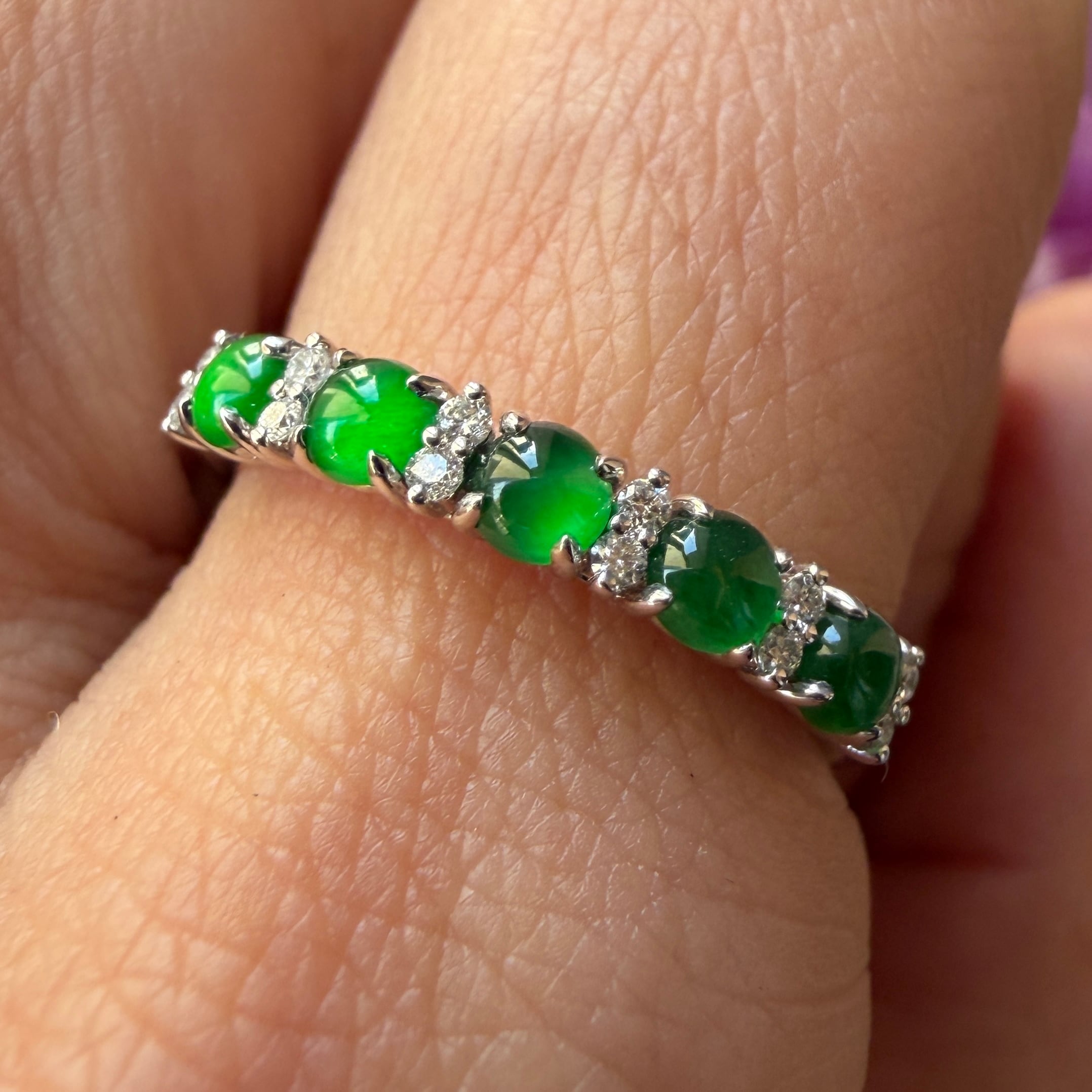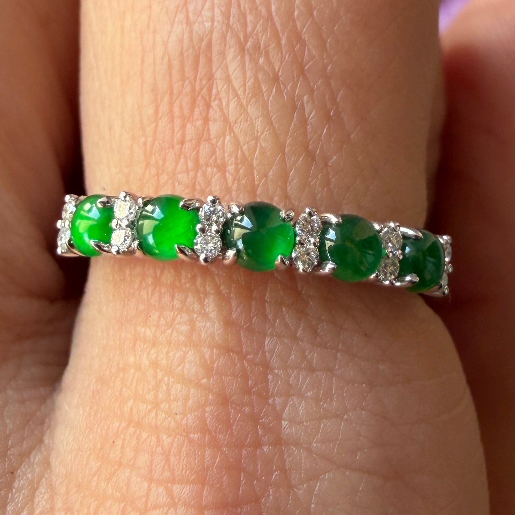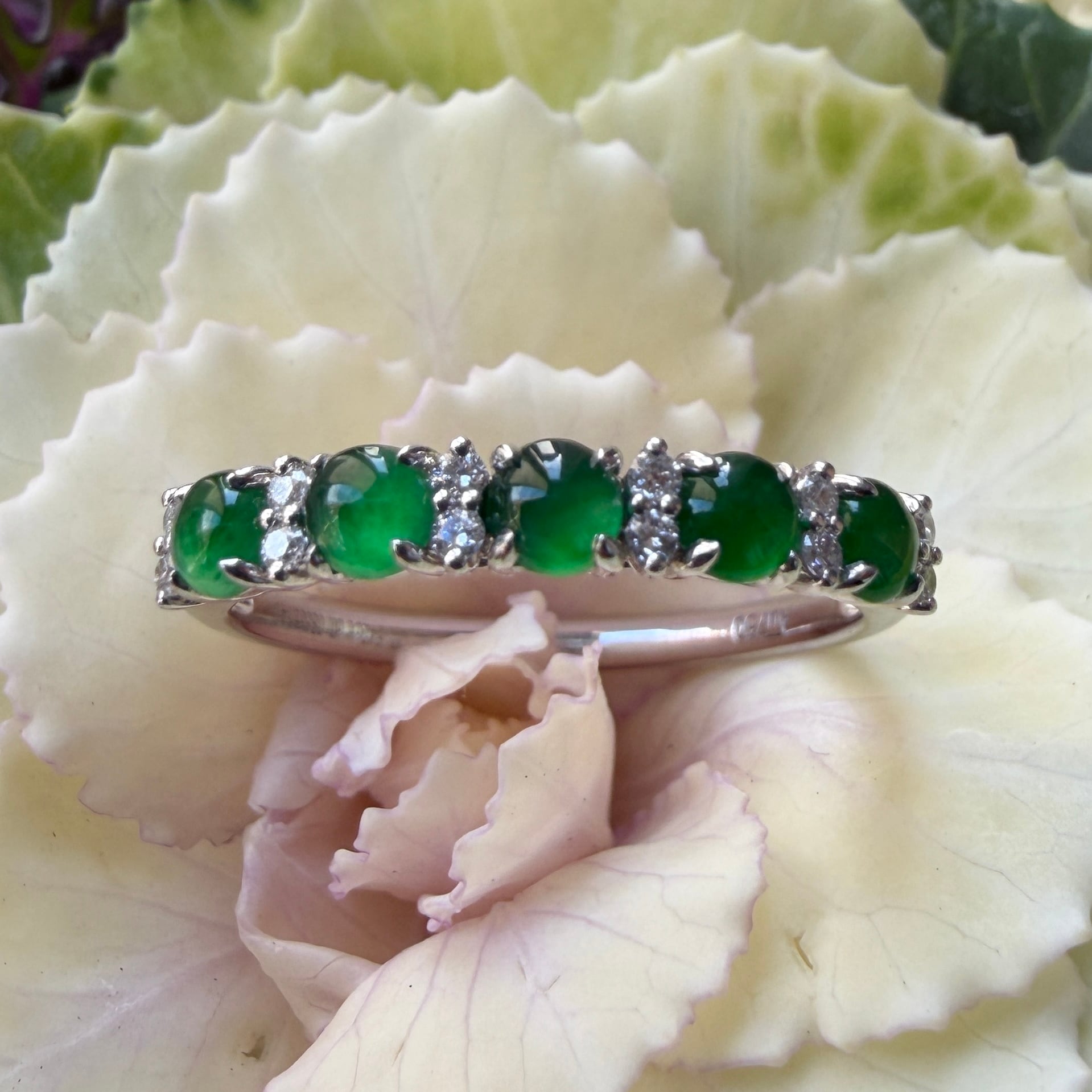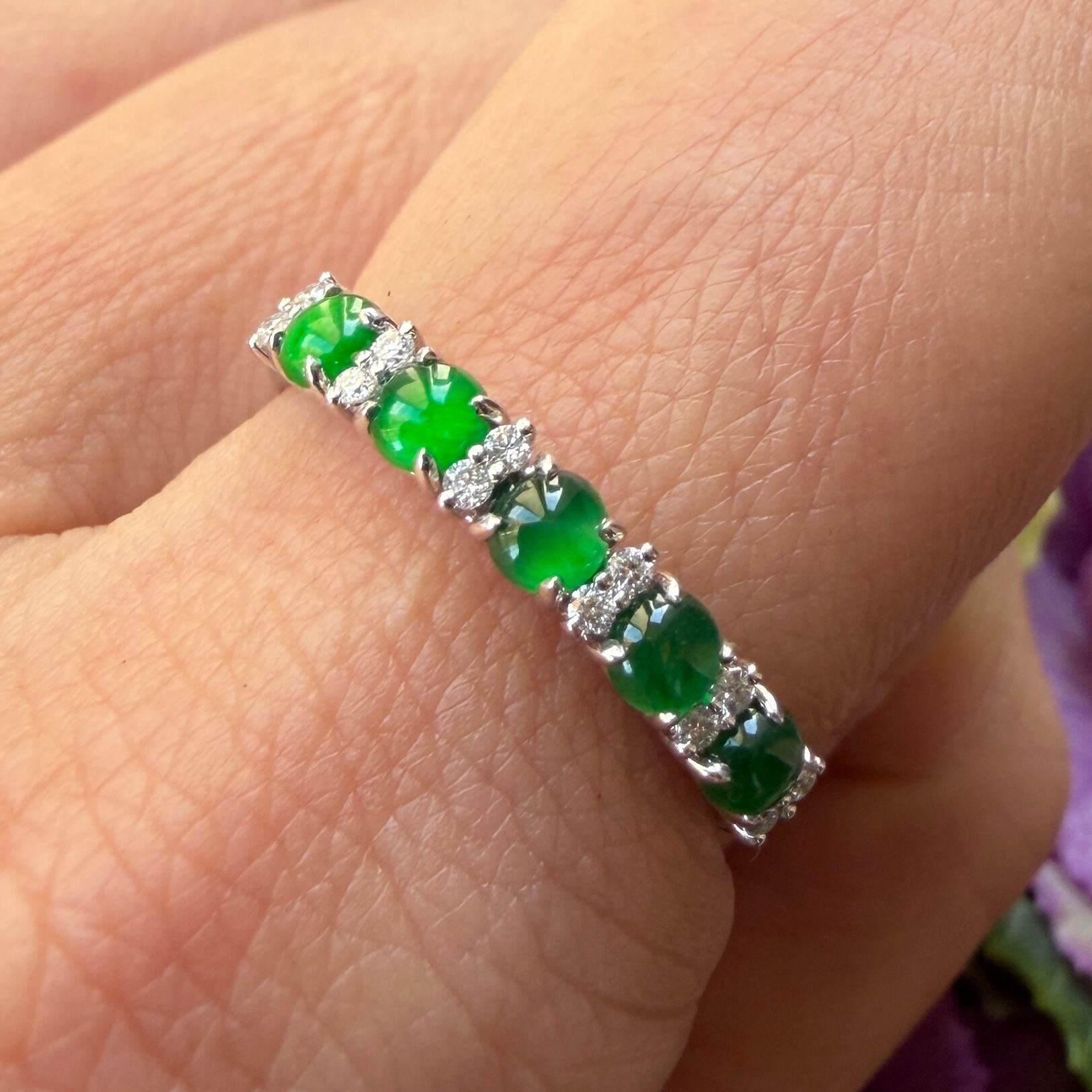 素晴らしい色が特徴の為、この様に小さく磨いても素晴らしい発色でまるで発光しているかの様な美しい緑色が特徴です。天然石でこの様なジュエリーを作る時の苦労はつぶの美しさと、形、色を揃える事。この作業だけであっという間に1日が終わってしまうくらい大変な作業です。そんな苦労を感じさせないくらいうるうるとした瑞々しい緑色のまさに粒よりの翡翠と美しいダイヤモンドを交互に並べて18金ホワイトゴールドでリングに仕立ててあります。
