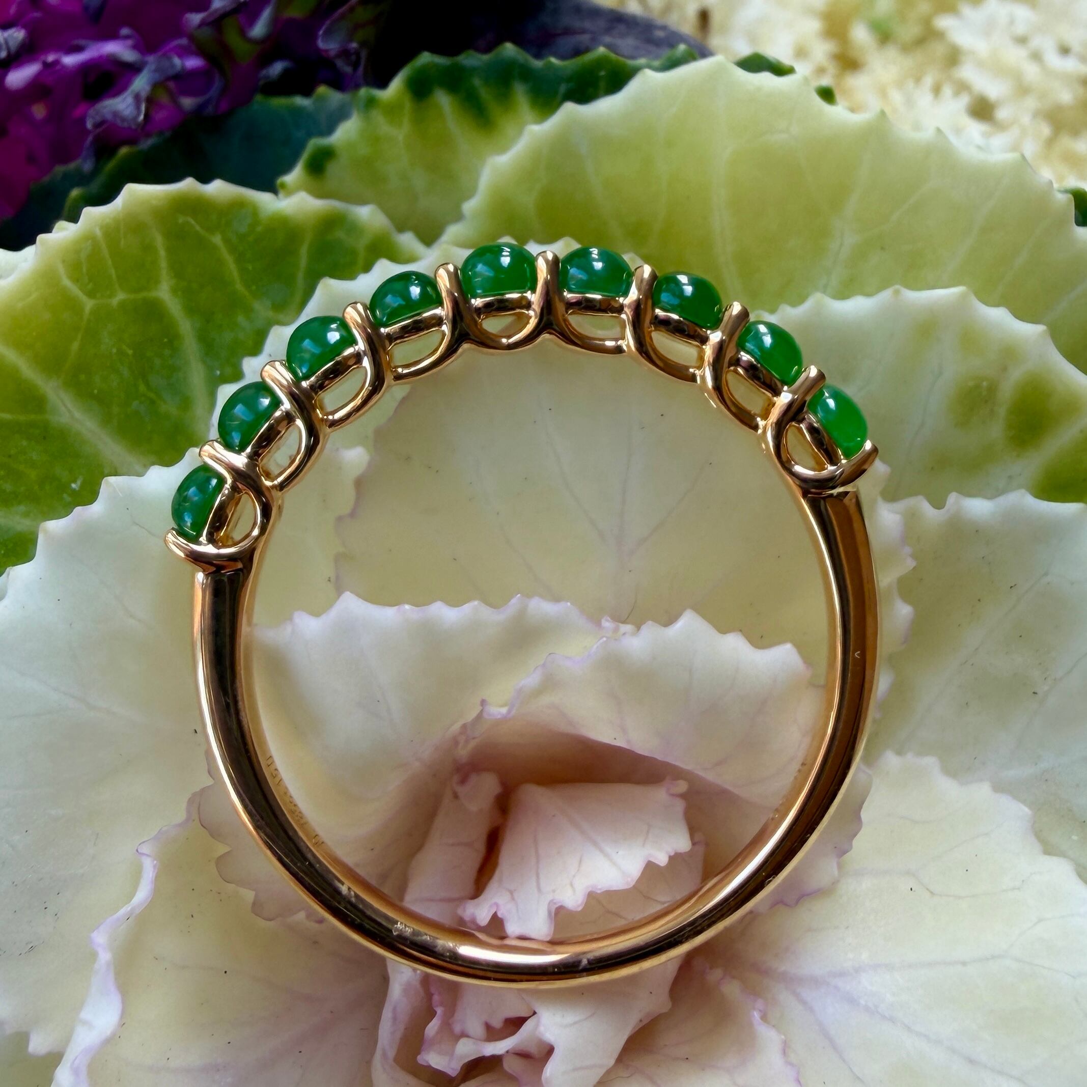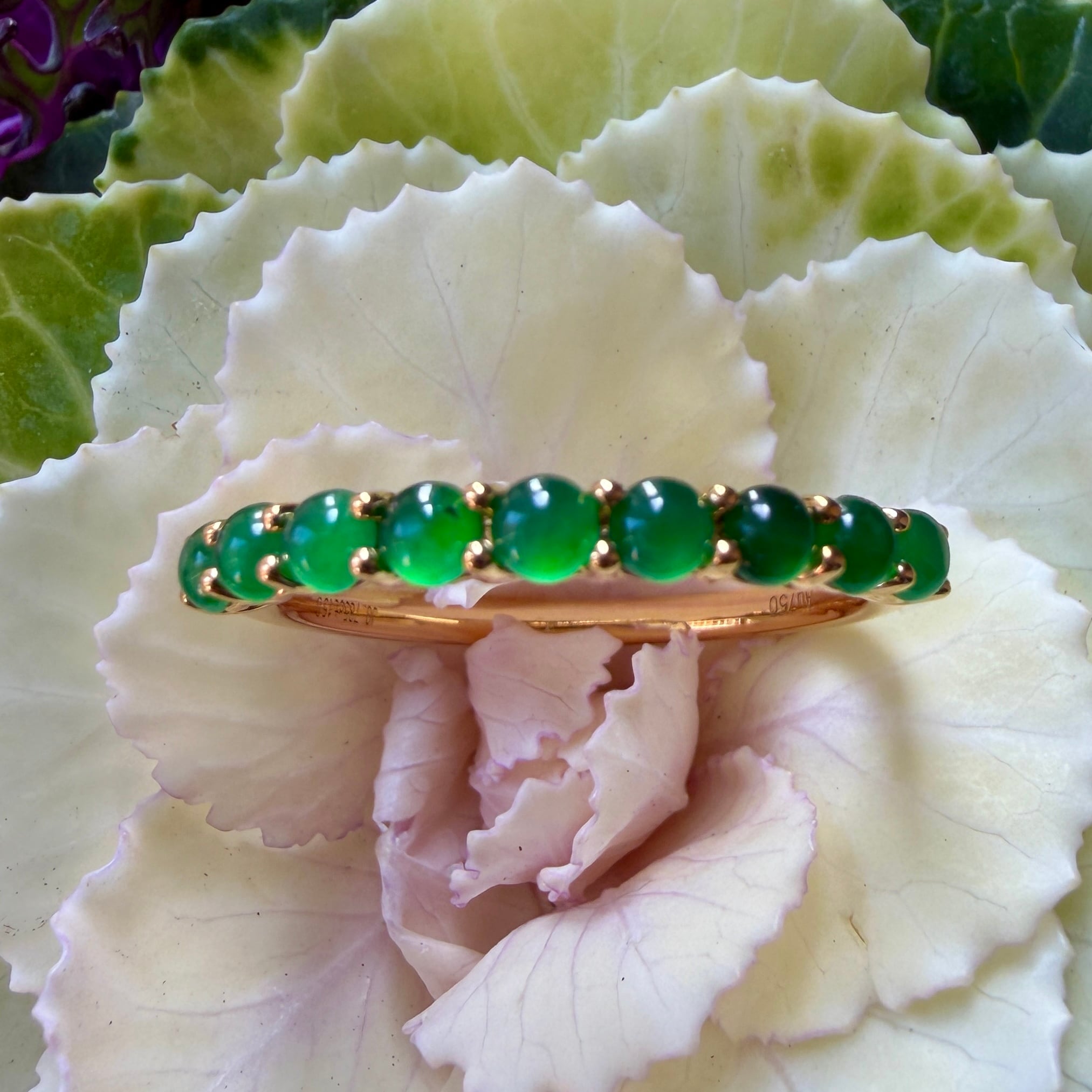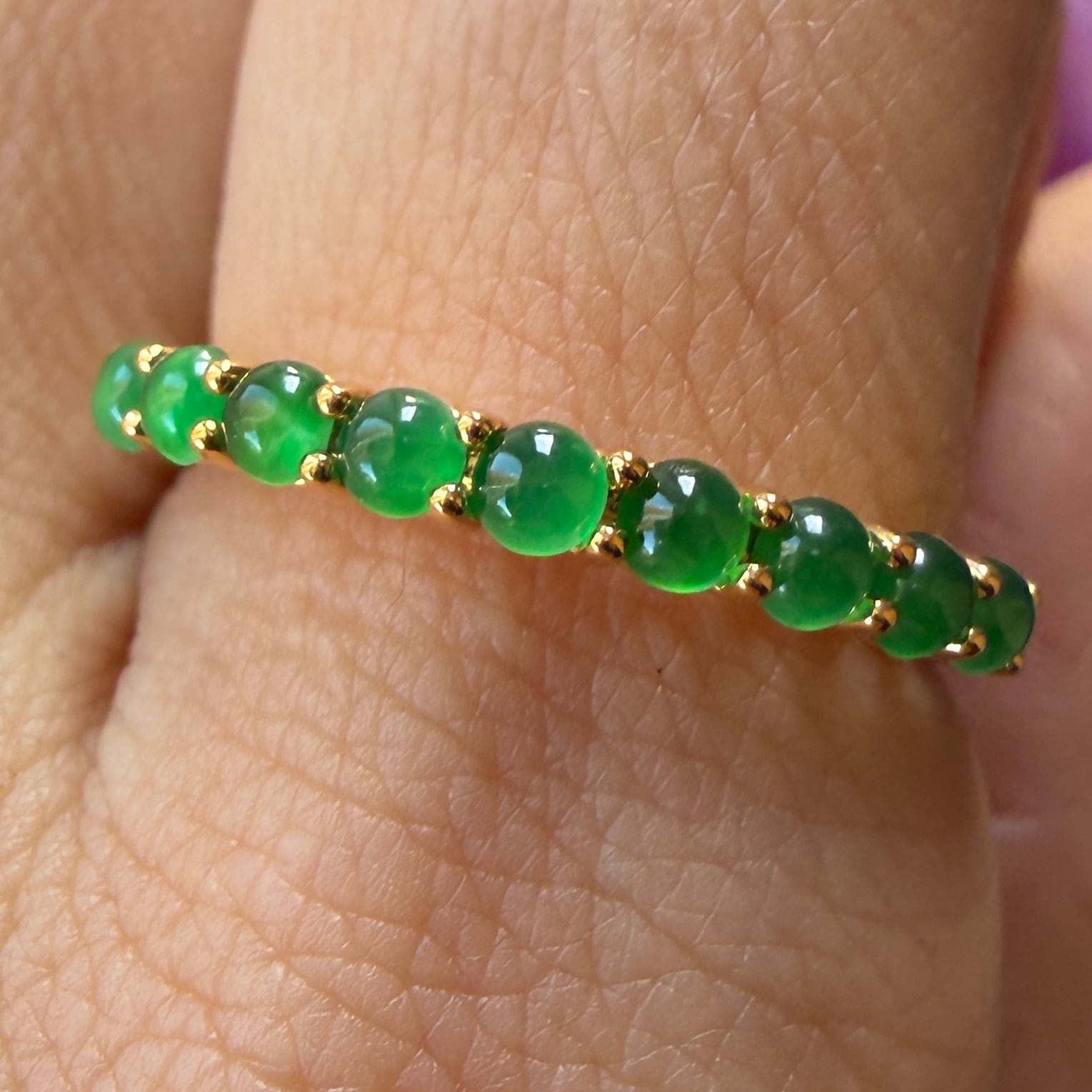 素晴らしい色が特徴の為、この様に小さく磨いても素晴らしい発色でまるで発光しているかの様な美しい緑色が特徴です。天然石でこの様なジュエリーを作る時の苦労はつぶの美しさと、形、色を揃える事。この作業だけであっという間に1日が終わってしまうくらい大変な作業です。そんな苦労を感じさせないくらいうるうるとした瑞々しい緑色のまさに粒よりの翡翠を18金イエローゴールドでリングに仕立ててあります。