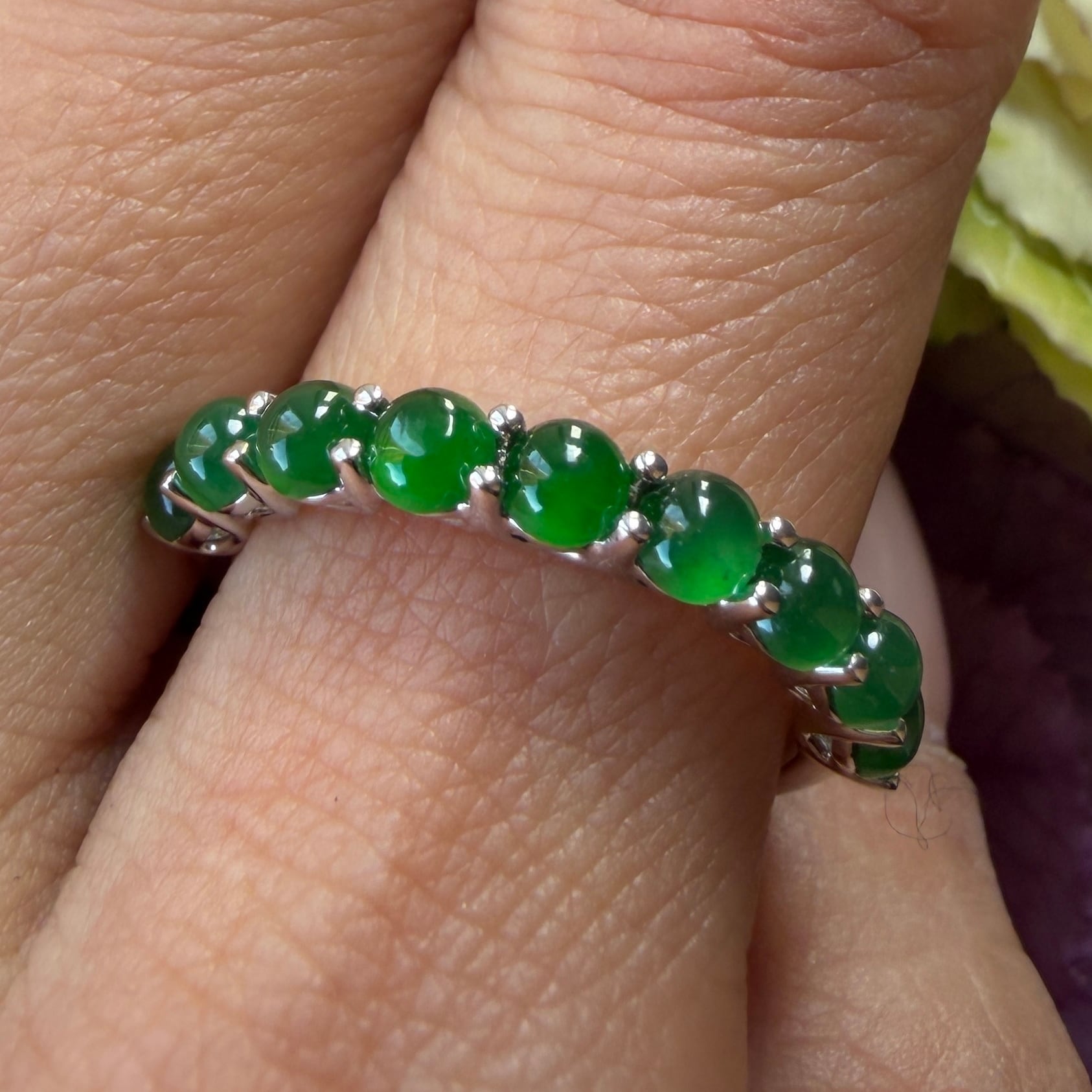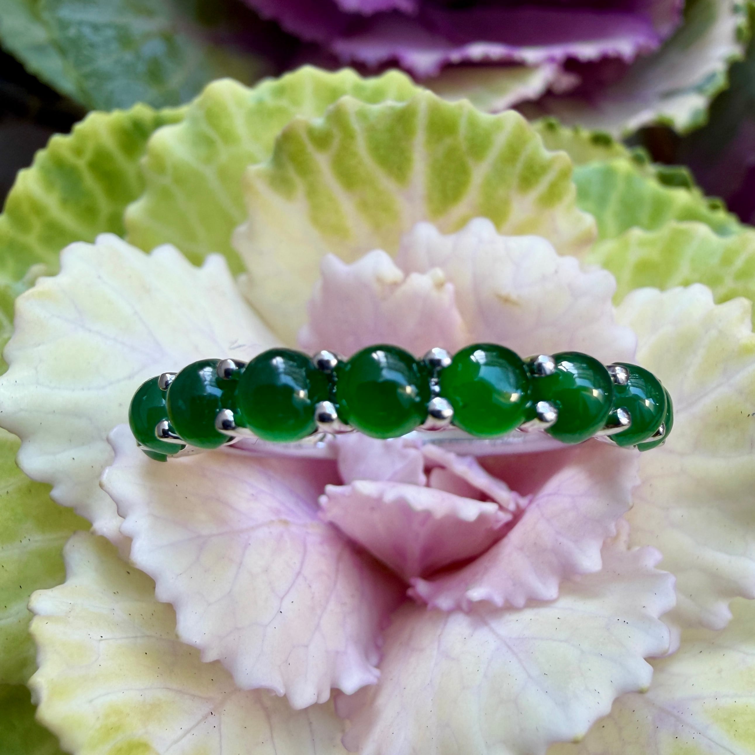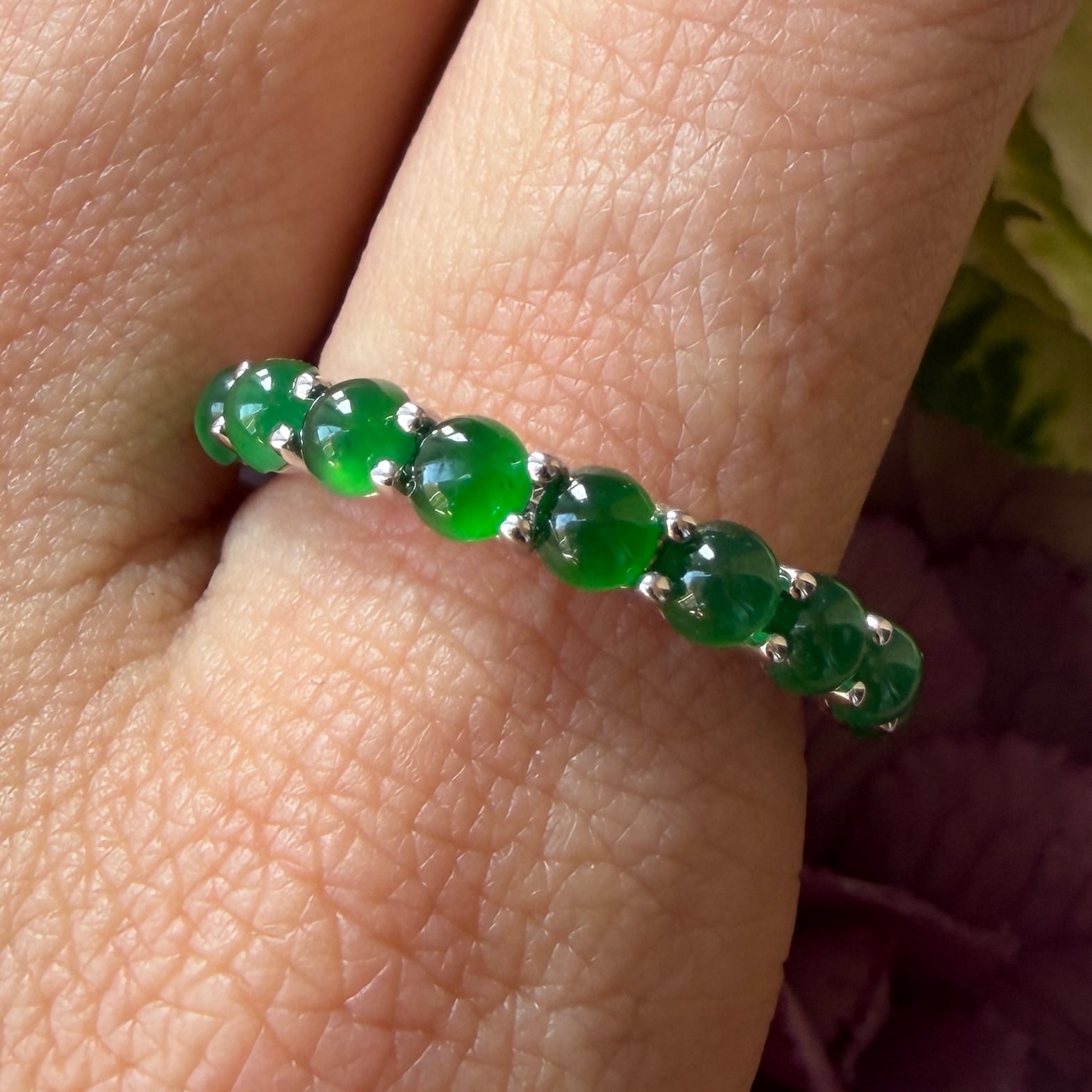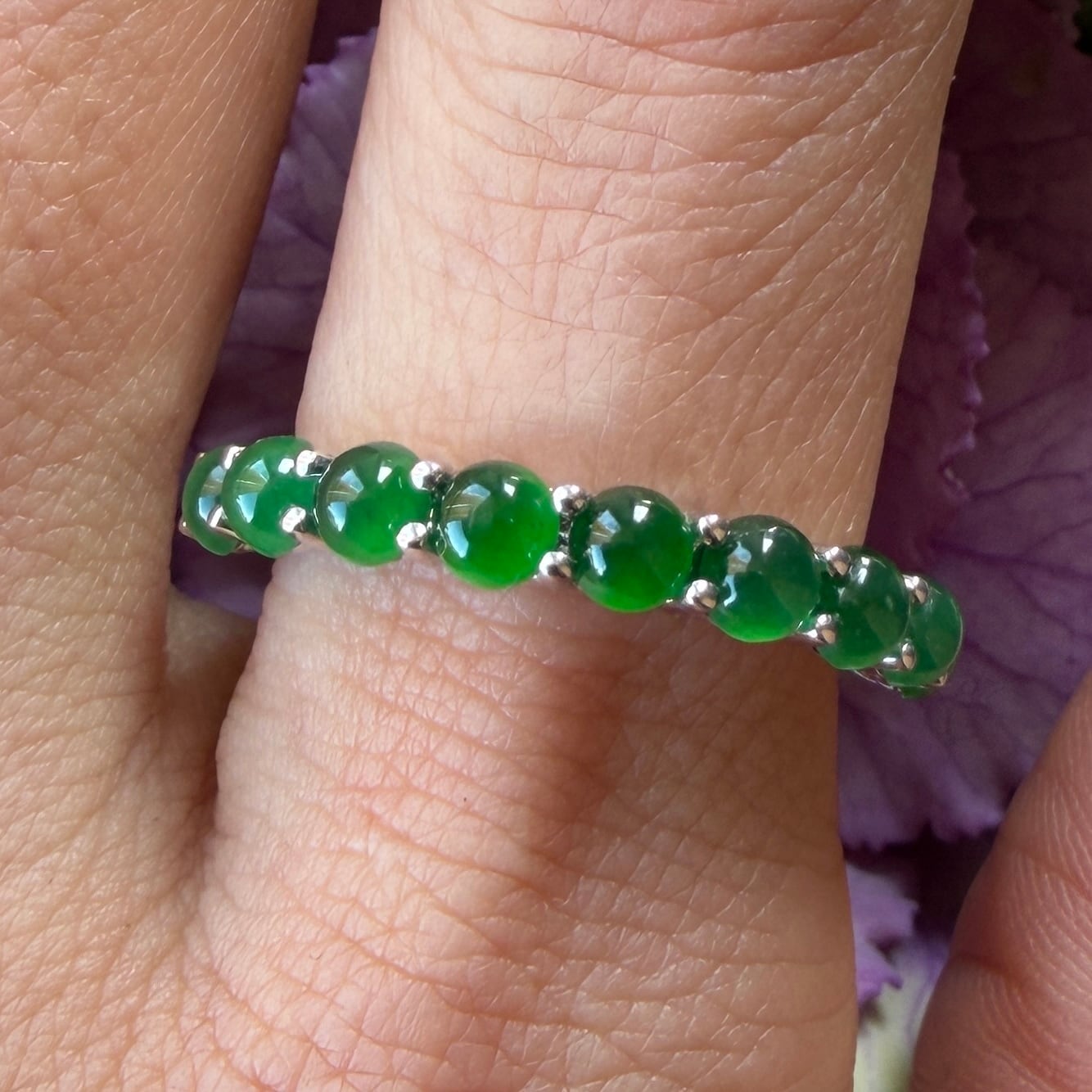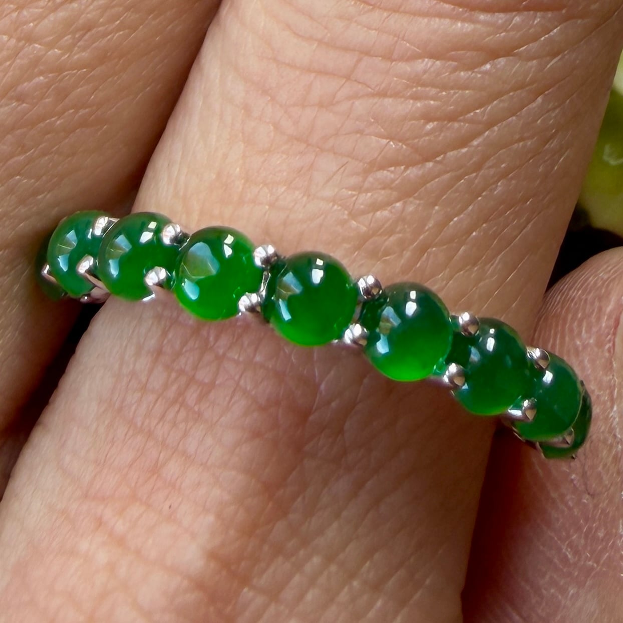 素晴らしい色が特徴の為、この様に小さく磨いても素晴らしい発色でまるで発光しているかの様な美しい緑色が特徴です。天然石でこの様なジュエリーを作る時の苦労はつぶの美しさと、形、色を揃える事。この作業だけであっという間に1日が終わってしまうくらい大変な作業です。そんな苦労を感じさせないくらいうるうるとした瑞々しい緑色のまさに粒よりの翡翠を18金ホワイトーゴールドでリングに仕立ててあります。