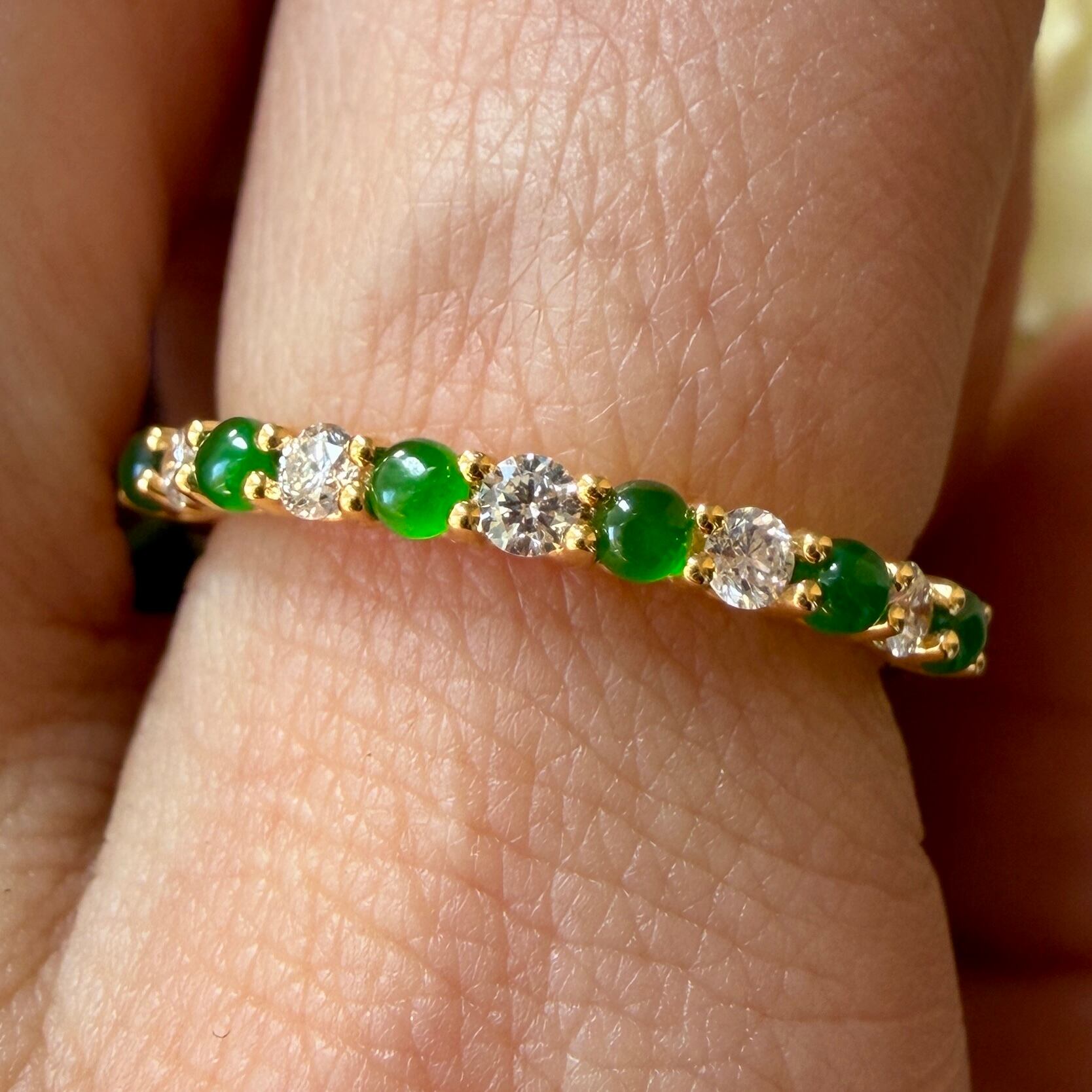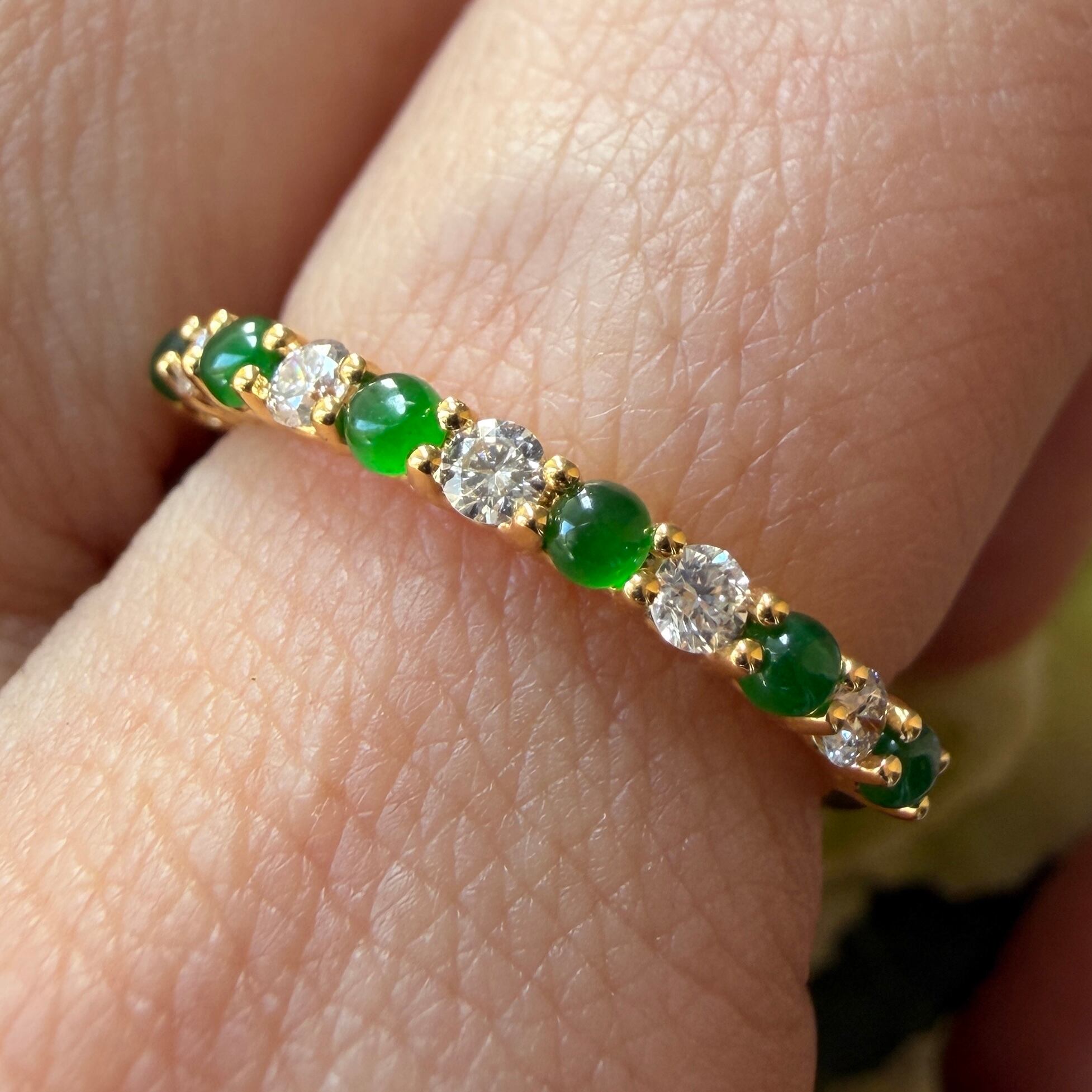 素晴らしい色が特徴の為、この様に小さく磨いても素晴らしい発色でまるで発光しているかの様な美しい緑色が特徴です。天然石でこの様なジュエリーを作る時の苦労はつぶの美しさと、形、色を揃える事。この作業だけであっという間に1日が終わってしまうくらい大変な作業です。そんな苦労を感じさせないくらいうるうるとした瑞々しい緑色のまさに粒よりの翡翠と美しいダイヤモンドを交互に並べて18金ホワイトゴールドでリングに仕立ててあります。