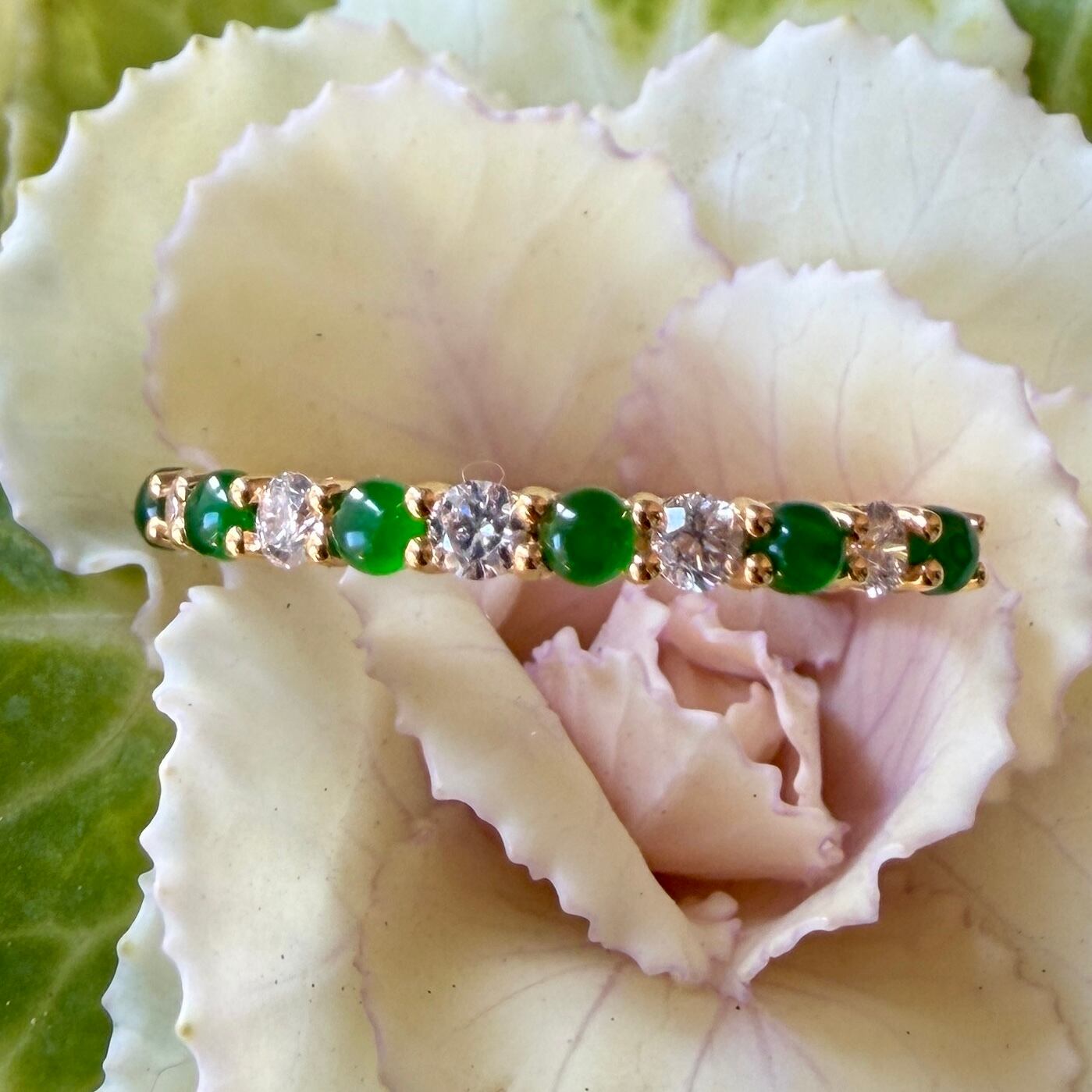 その美しい琅玕翡翠とダイヤモンドを組み合わせた2つの異なる色の光のライン手元に映えるリングです。