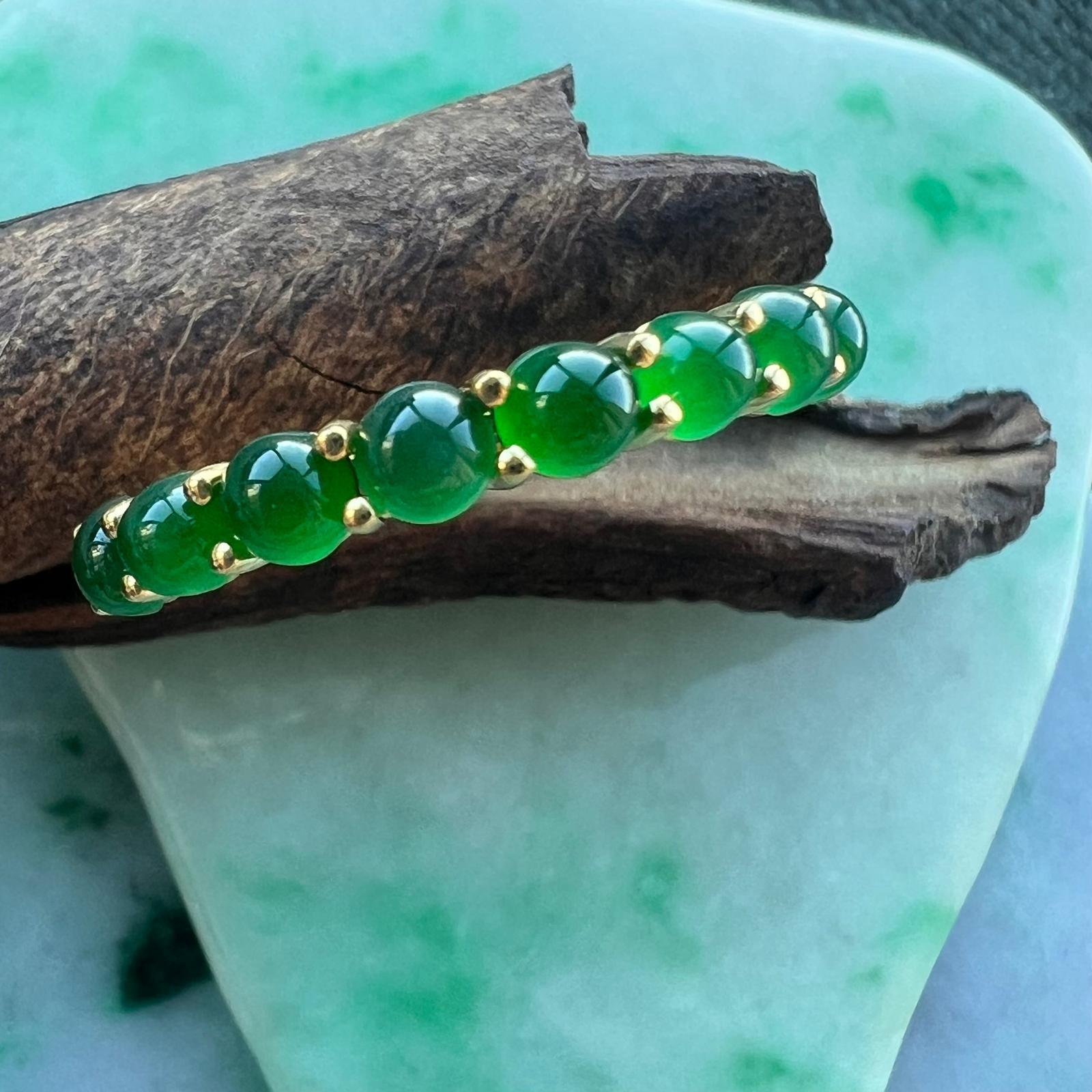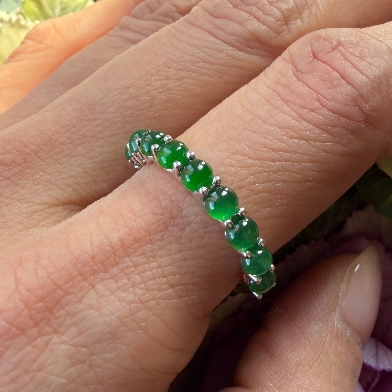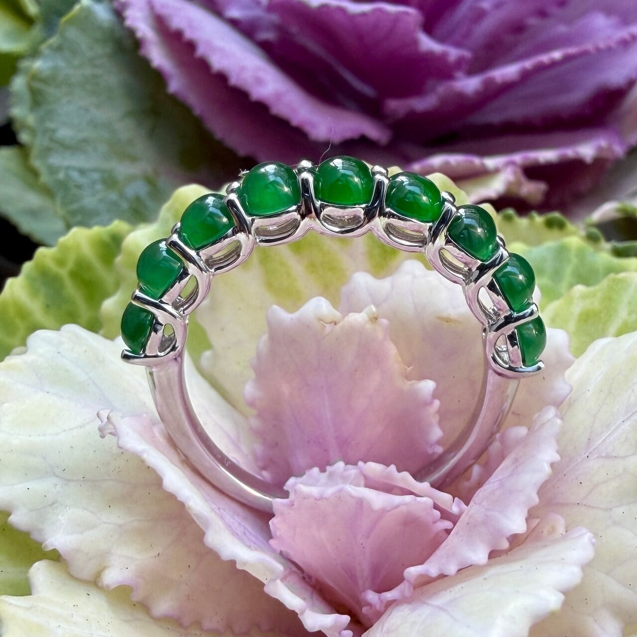 素晴らしい色が特徴の為、この様に小さく磨いても素晴らしい発色でまるで発光しているかの様な美しい緑色が特徴です。天然石でこの様なジュエリーを作る時の苦労はつぶの美しさと、形、色を揃える事。この作業だけであっという間に1日が終わってしまうくらい大変な作業です。そんな苦労を感じさせないくらいうるうるとした瑞々しい緑色のまさに粒よりの翡翠を18金ホワイトーゴールドでリングに仕立ててあります。
