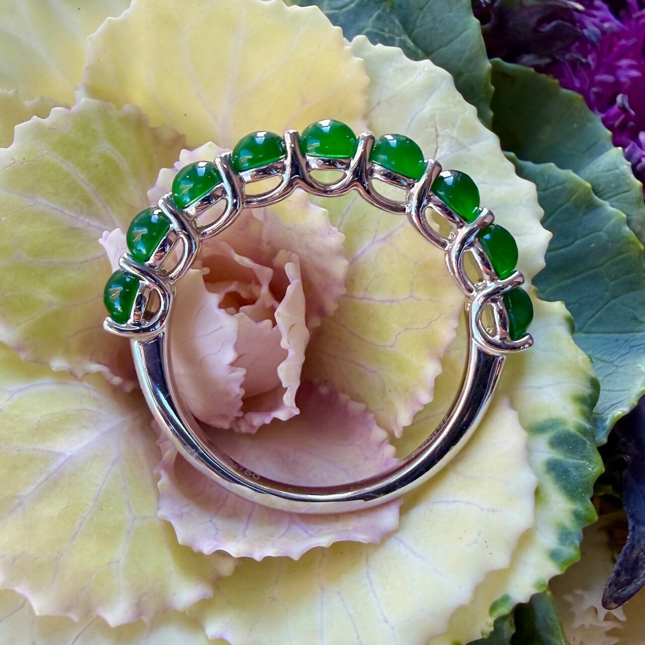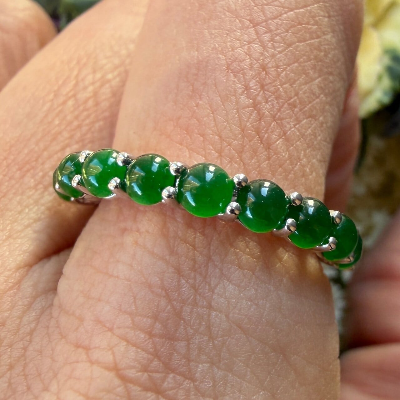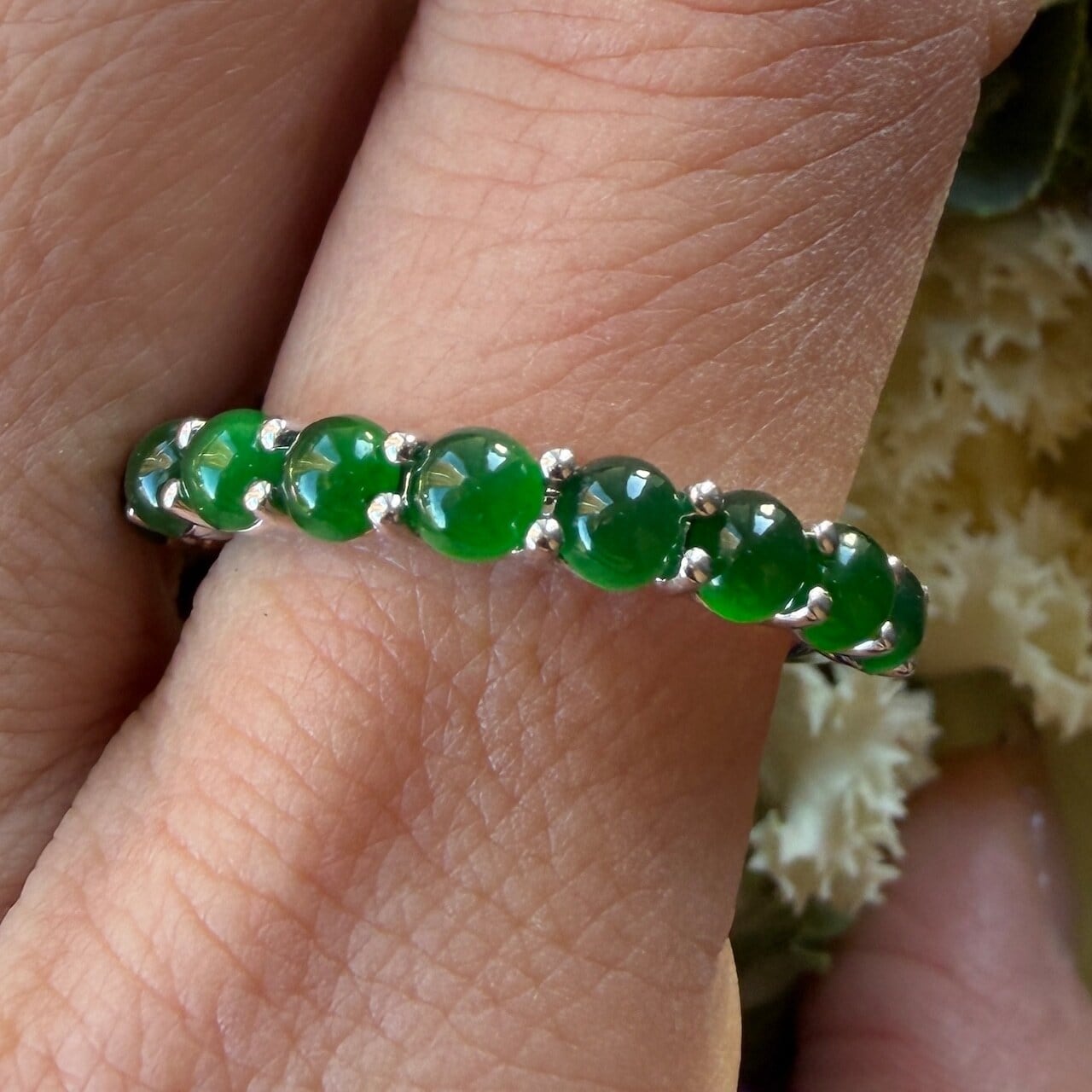 素晴らしい色が特徴の為、この様に小さく磨いても素晴らしい発色でまるで発光しているかの様な美しい緑色が特徴です。天然石でこの様なジュエリーを作る時の苦労はつぶの美しさと、形、色を揃える事。この作業だけであっという間に1日が終わってしまうくらい大変な作業です。そんな苦労を感じさせないくらいうるうるとした瑞々しい緑色のまさに粒よりの翡翠を18金ホワイトーゴールドでリングに仕立ててあります。