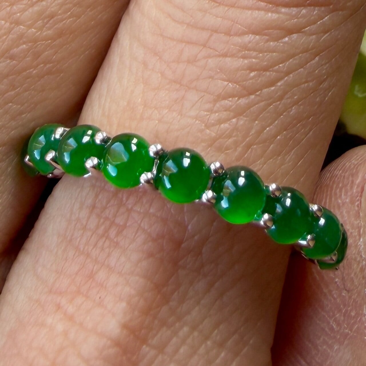 本当に美しい約3.5mmの緑のラインが手元に映える琅玕翡翠のリングです。
