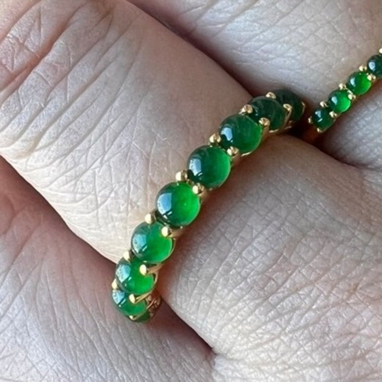 それはサロンや展示会で入手の難しい大粒の3.5ミリのこちらのハーフエタニティーが一番人気があった事です。特にフォーマルやお着物にハイジュエリーと使ったり、永遠の人気であるヨーロッパのハイブランドの地金製品と一緒に使っても負けないクラス感の装いをワンランク上げる様な効果がこの緑色の翡翠にはあるのだと思います。