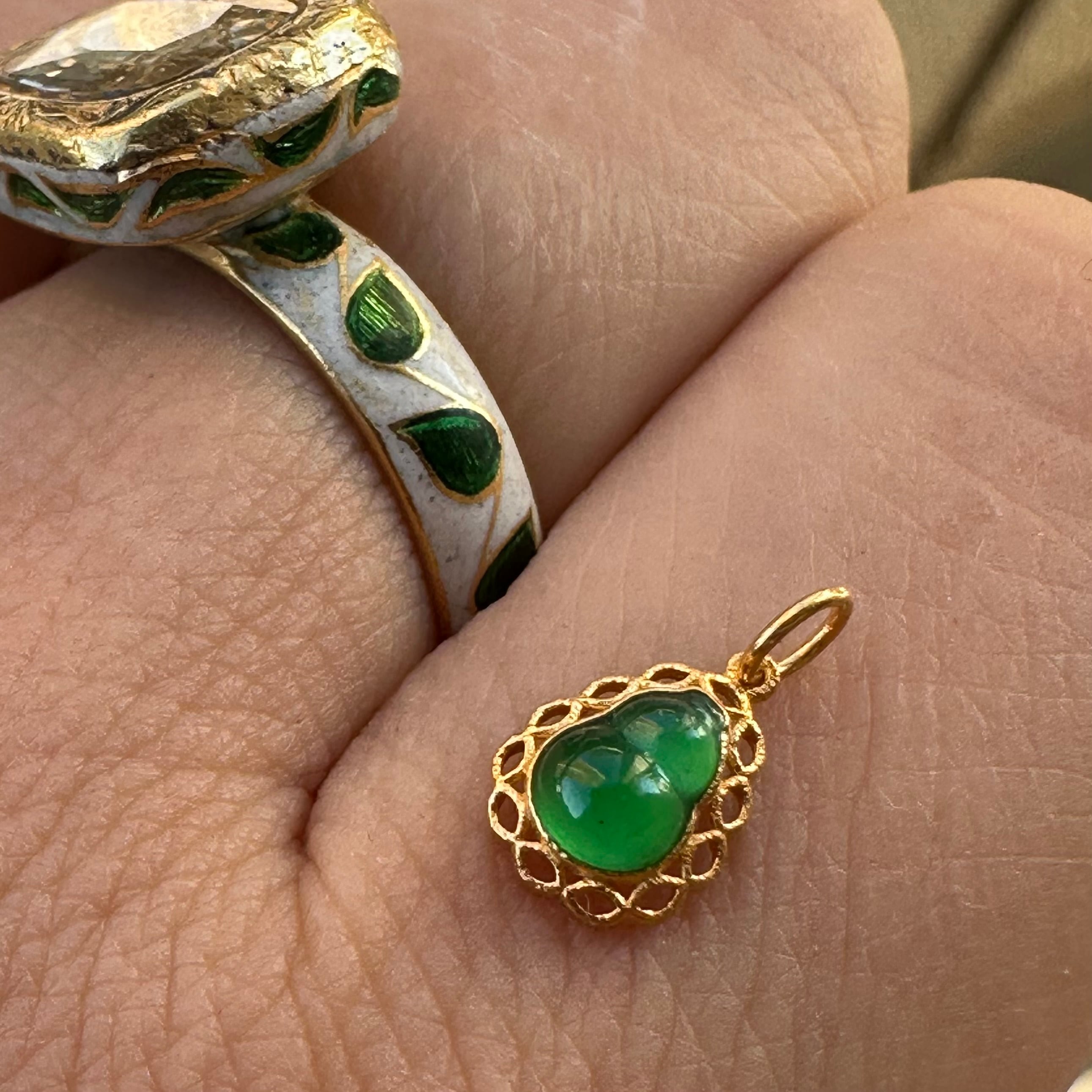 ペンダントトップやブレスレットなどのチャームとしては勿論のこと、少し手を加えてシンプルなリングに下げたり、片耳のピアスや似たような形の同じトップをペアにしてピアスにしても素敵です。中華圏では特に瓢箪は金運をアップさせるお守りとしてお財布の中にこの様な翡翠をお守りとして持つ習慣もあると聞きました。