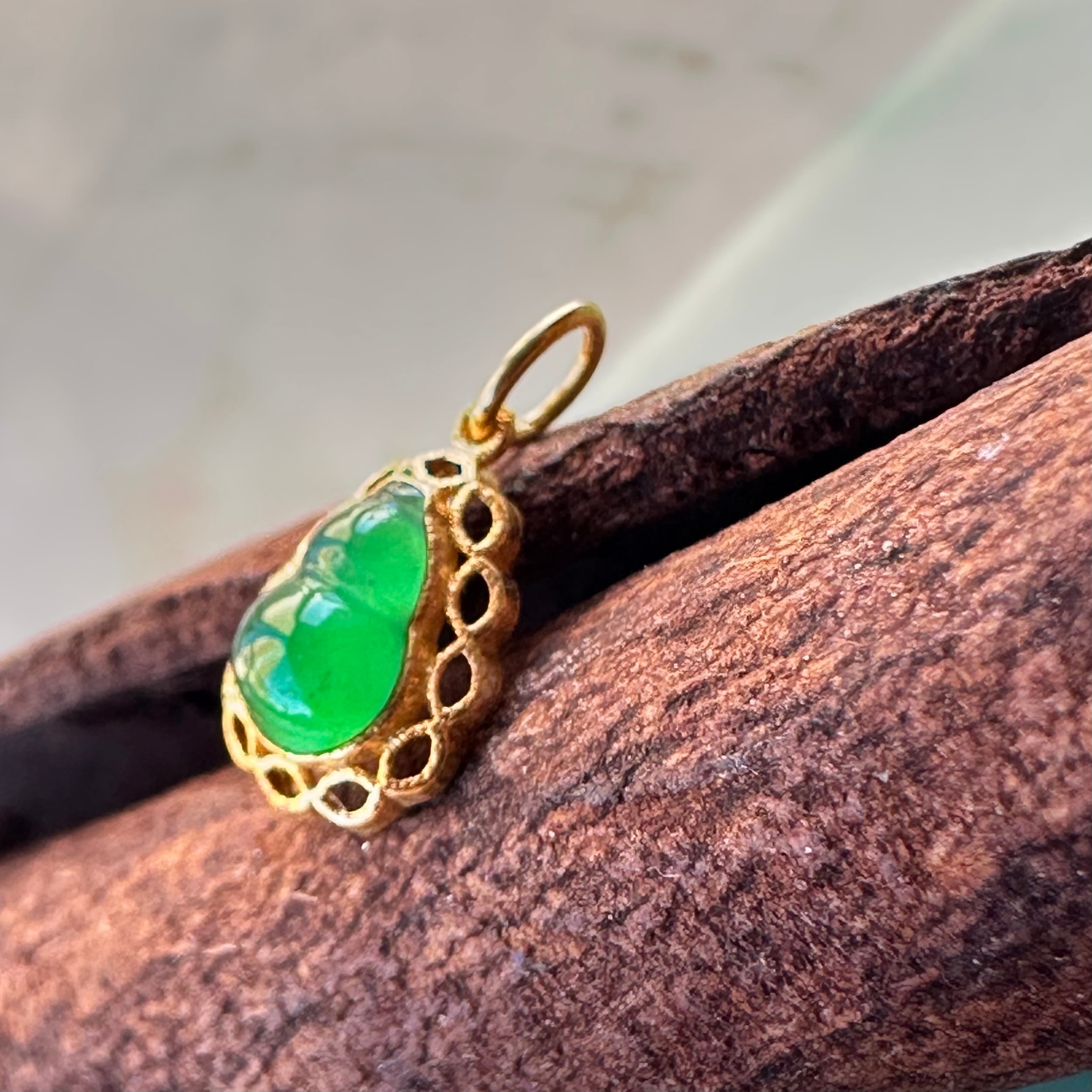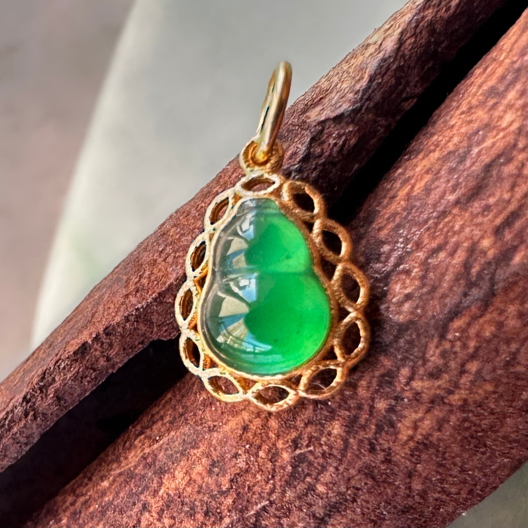 やかな緑色が目にも眩しい美しい瓢箪型の翡翠のペンダントトップです。縁起が良いとされる瓢箪。中華圏では瓢箪(葫蘆/フールー)は、邪気を吸い込み浄化する力があるとして軒先に吊るされ力があるとされており強力な魔よけとされ、瓢箪の発音が「福禄(幸運と財産)」と似ているため、財運向上や子孫繁栄、無病息災をもたらす縁起物として大変重宝されています。