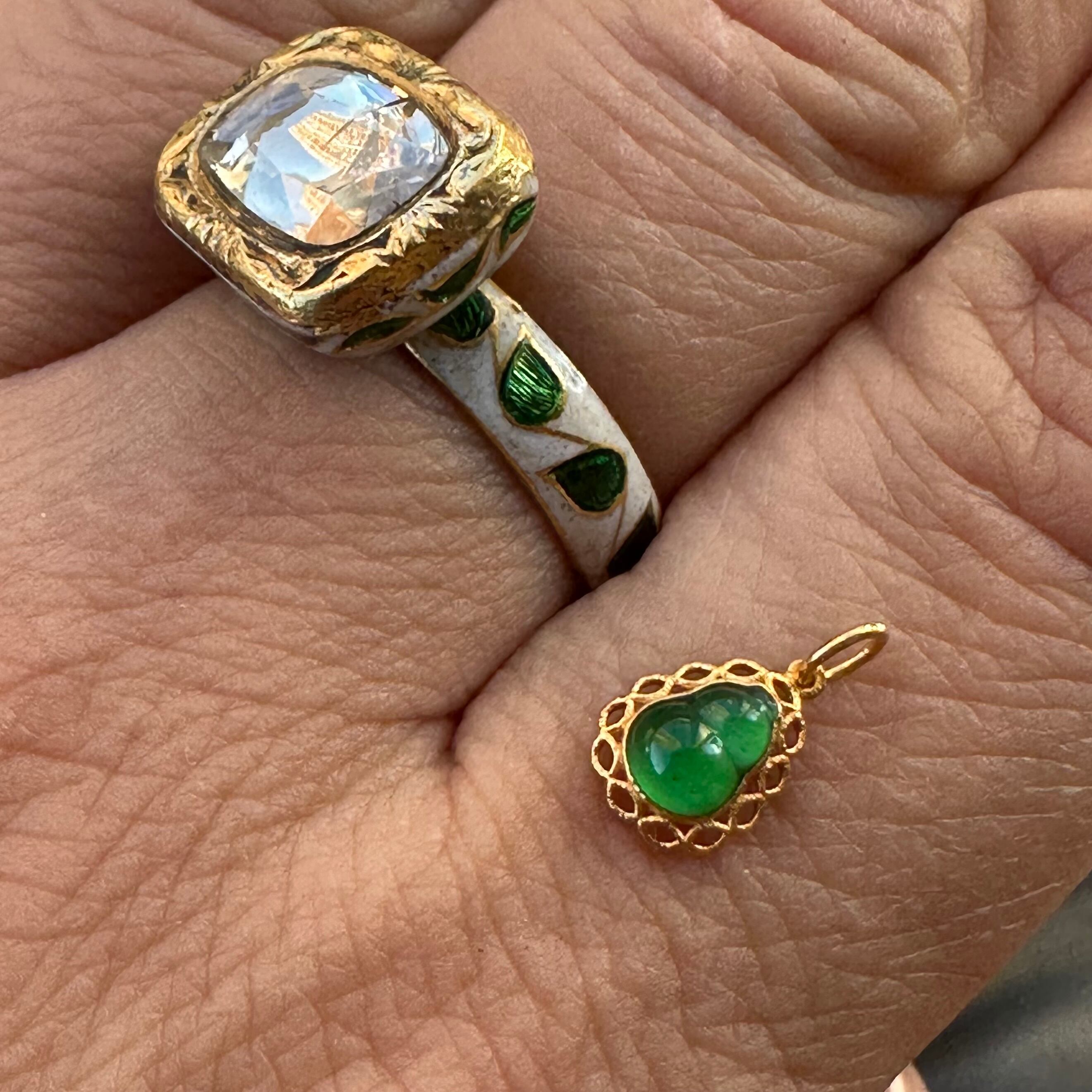 翡翠の周りを18金で手巻きしてあります。旧正月の訪れに向けて中華圏のジュエリーマーケットがどんな盛り上がりをしているかを視察した際に見つけた掘り出し物のチャームです。