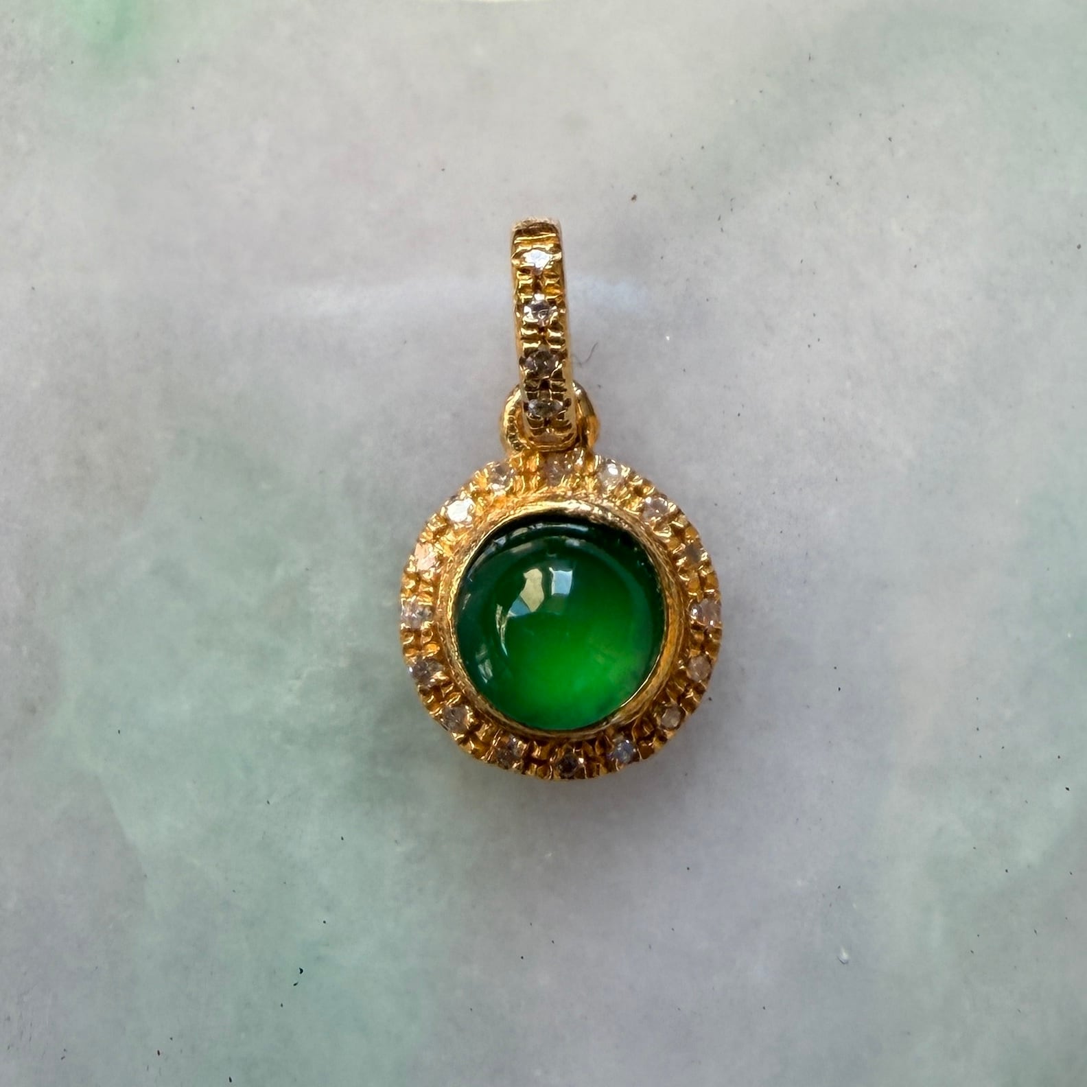 美しい翡翠の周りを細かな18金で一つ一つ手巻きしたトップです。