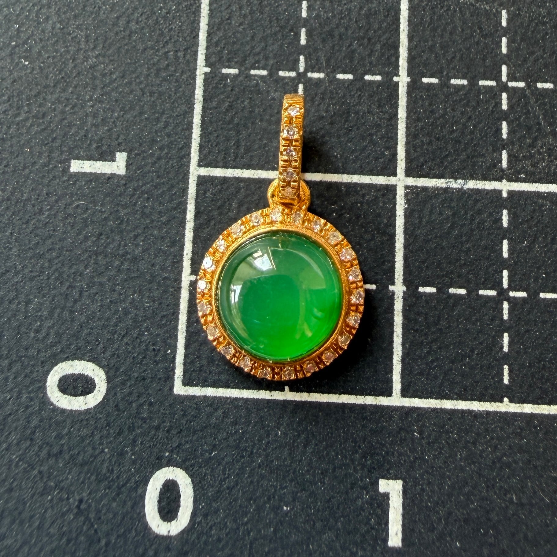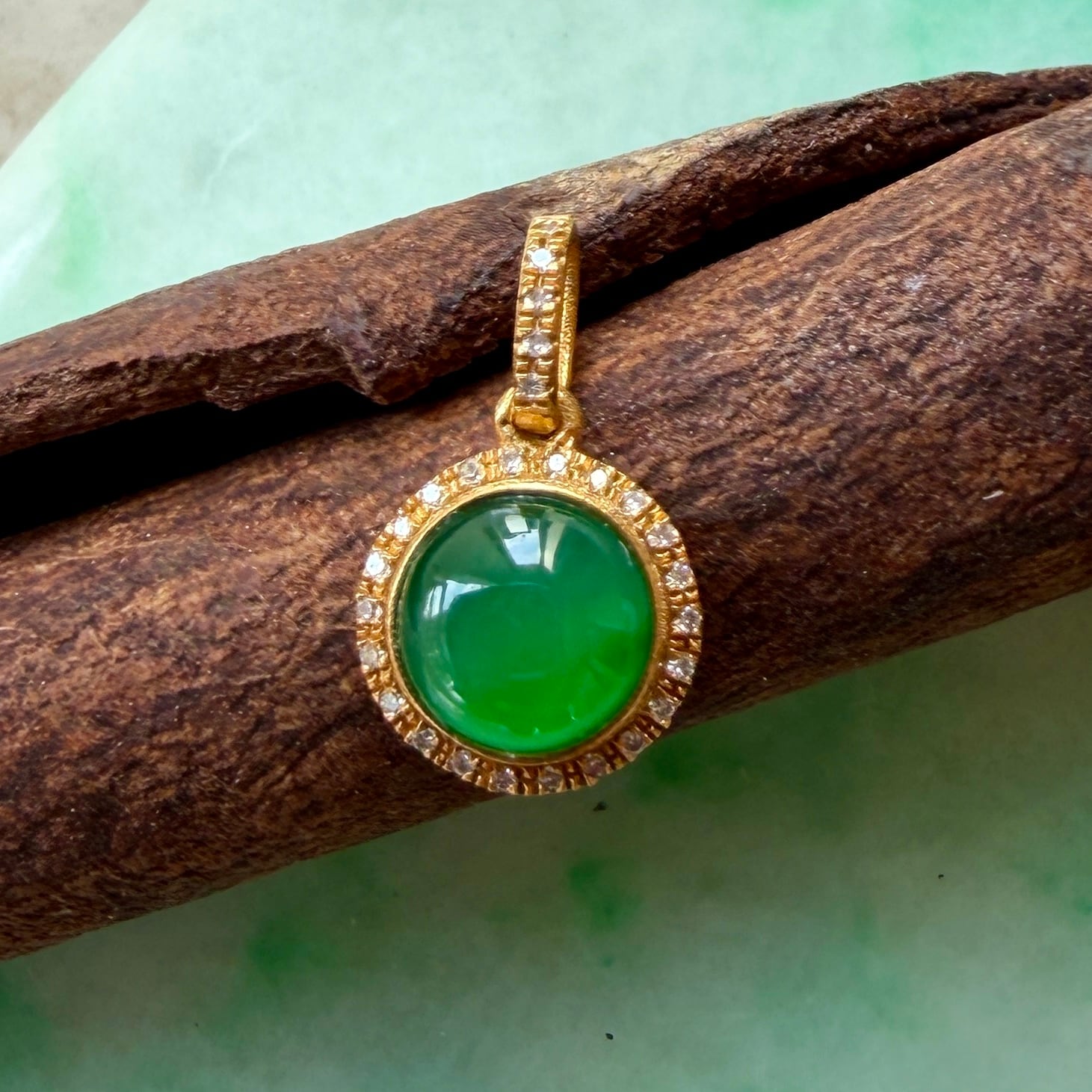 美しい大粒の翡翠の周りを18金で手巻きし、小さなダイヤをあしらったペンダントトップ。