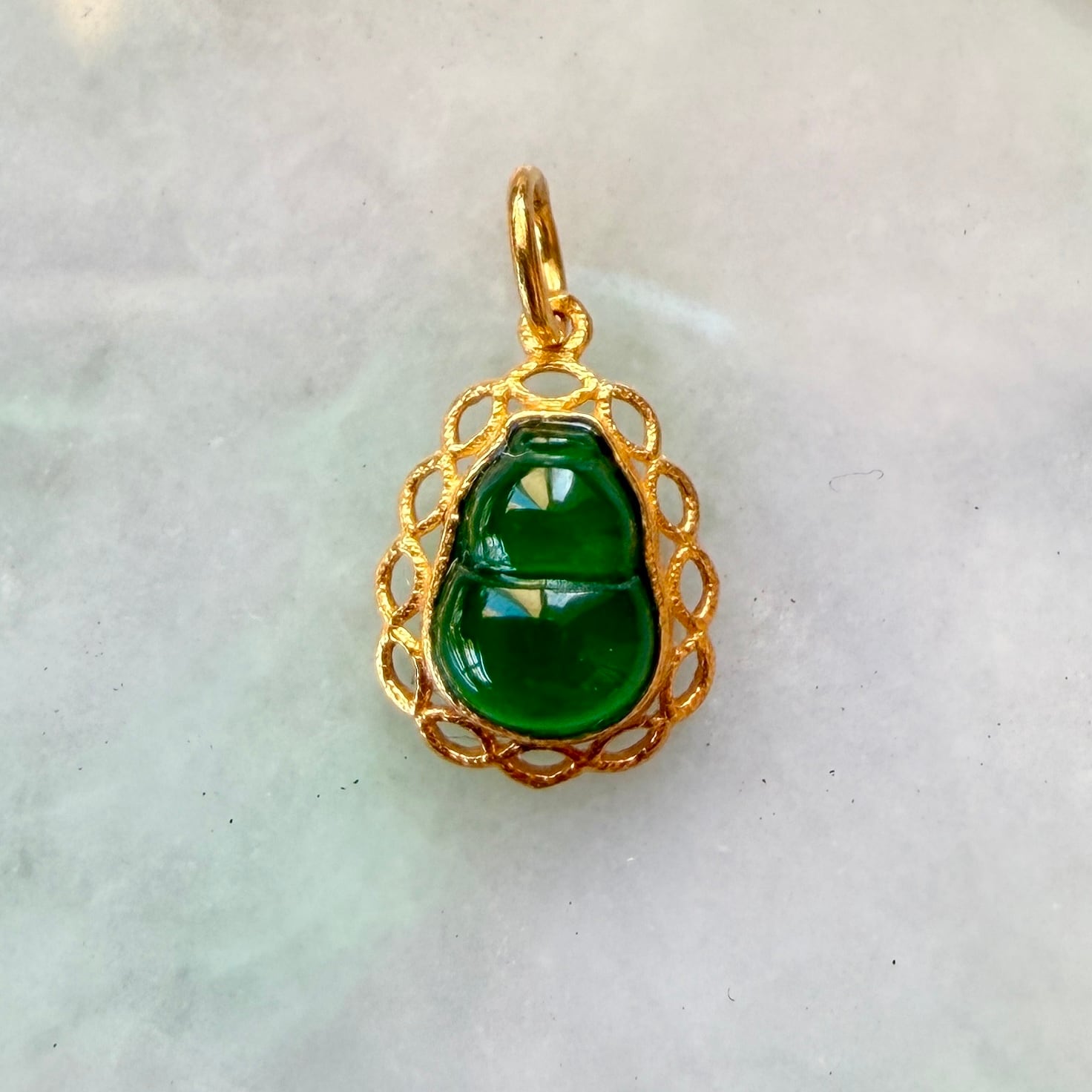 華やかな緑色が目にも眩しい美しい瓢箪型の翡翠のチャームです。縁起が良いとされる瓢箪。中華圏では瓢箪(葫蘆/フールー)は、邪気を吸い込み浄化する力があるとして軒先に吊るされ力があるとされており強力な魔よけとされ、瓢箪の発音が「福禄(幸運と財産)」と似ているため、財運向上や子孫繁栄、無病息災をもたらす縁起物として大変重宝されています。