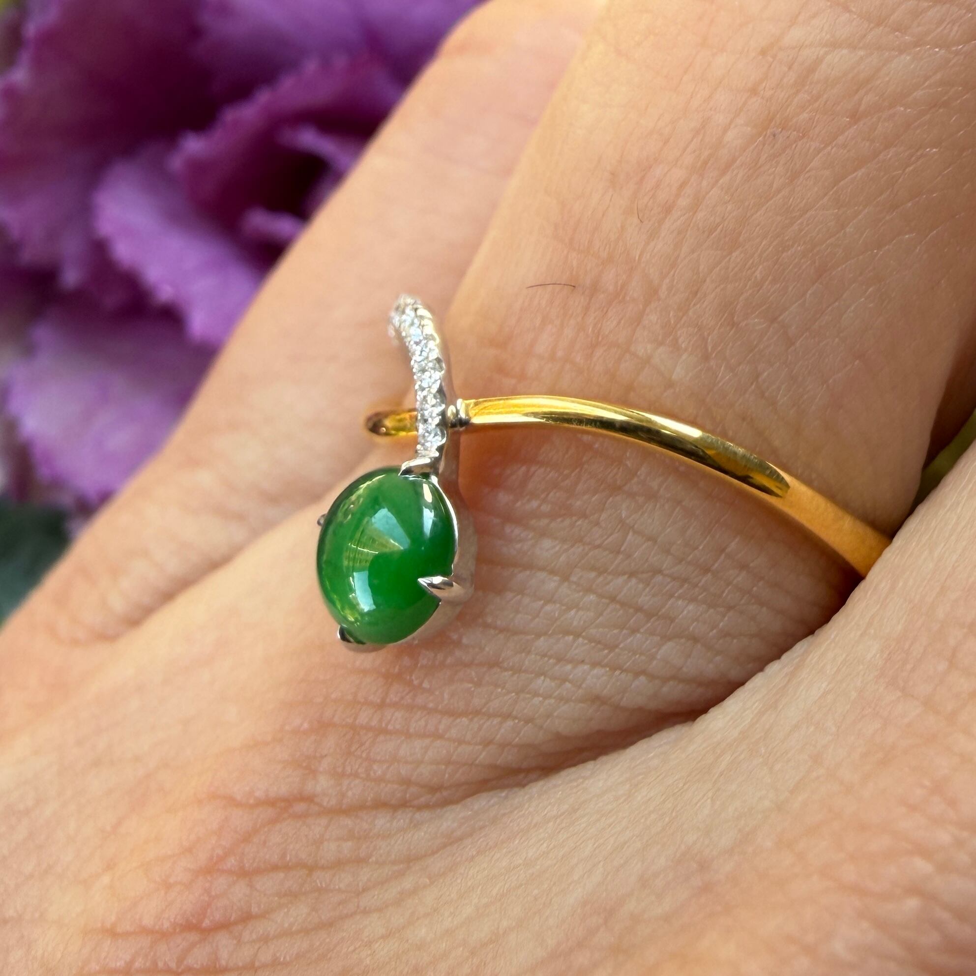 まるで発光しているかの様に美しいと手にされたお客様に大好評の琅玕翡翠。その美しい琅玕翡翠とダイヤモンドのラインを組み合わせた2つの異なる色の光のライン手元に映えるK18イエローゴールドのリングです。