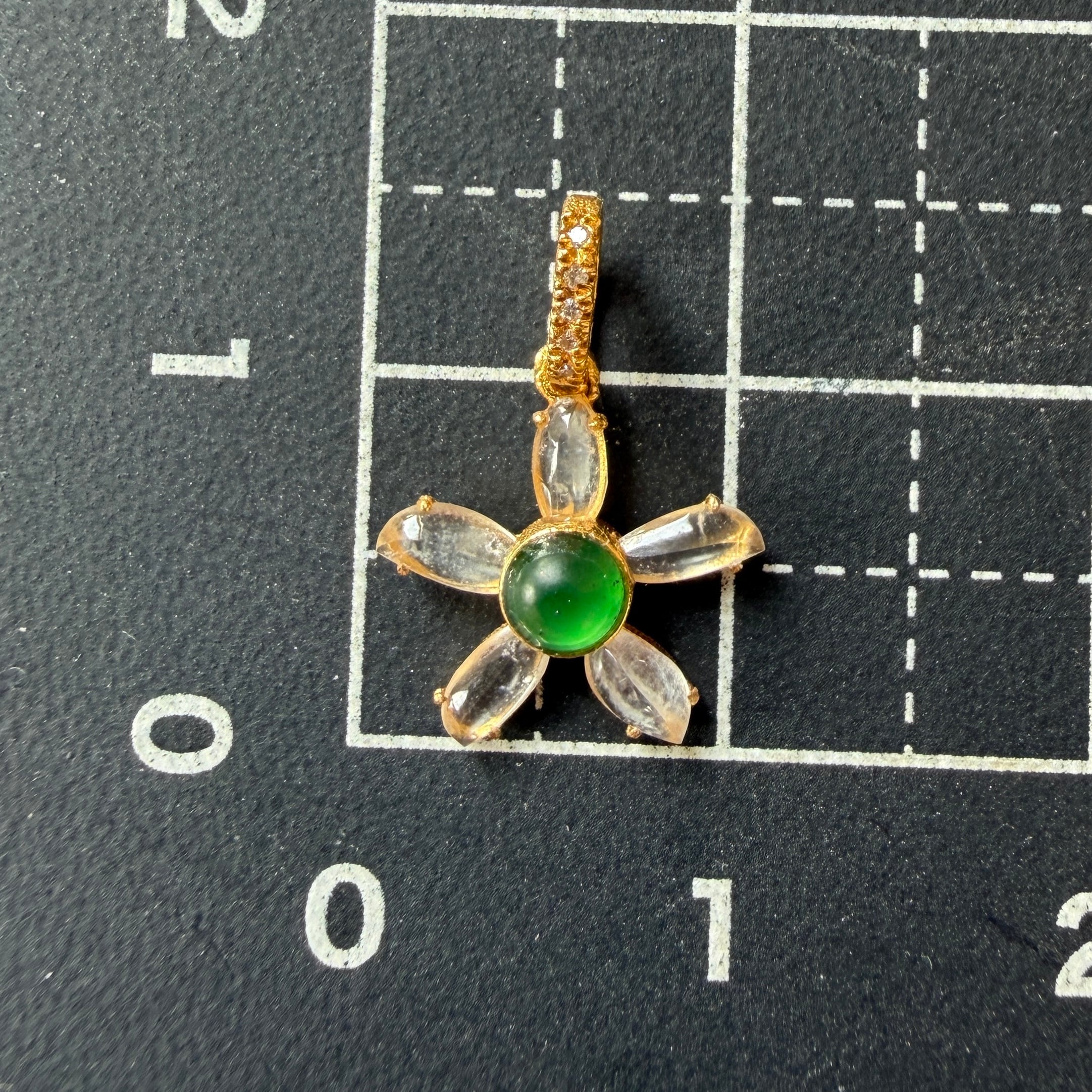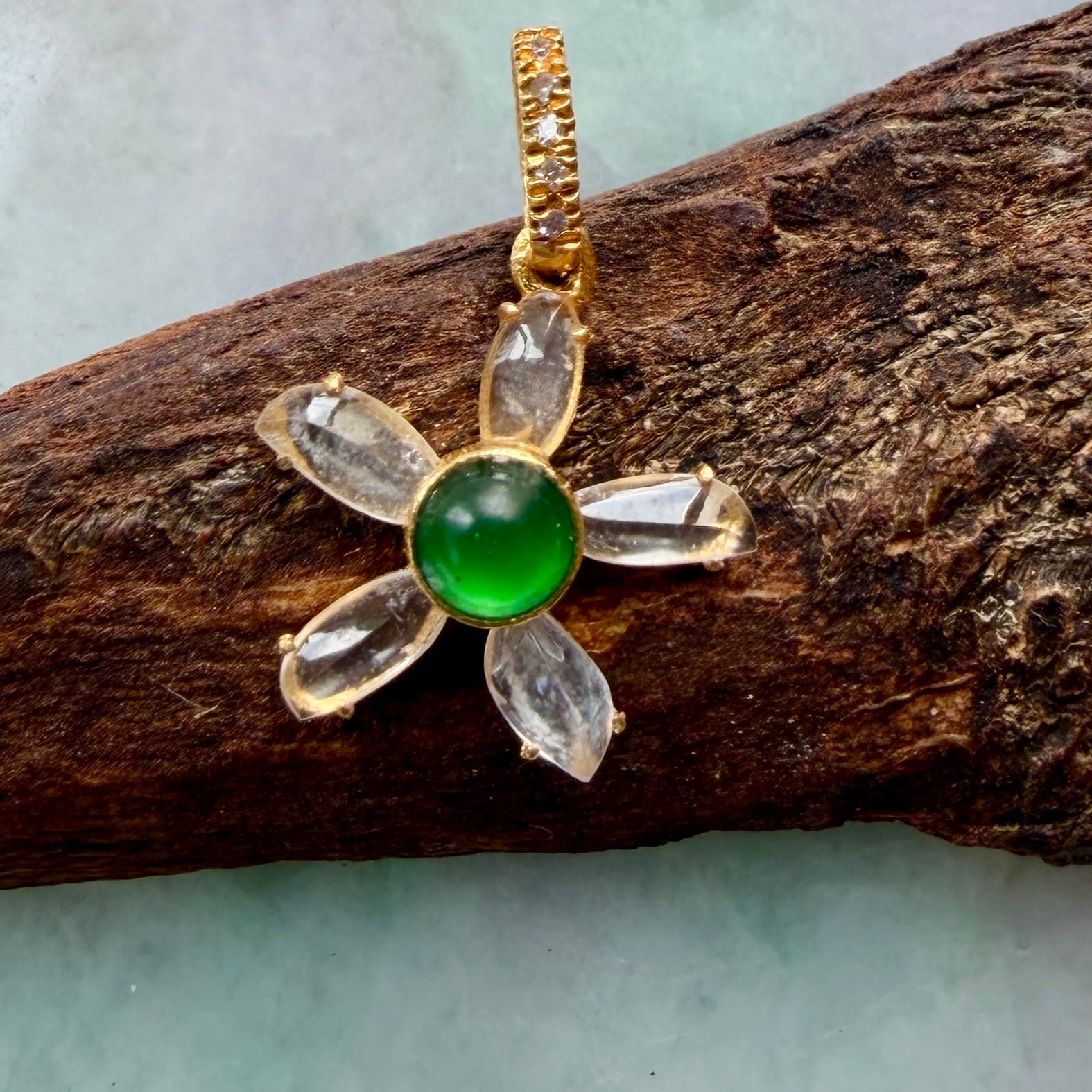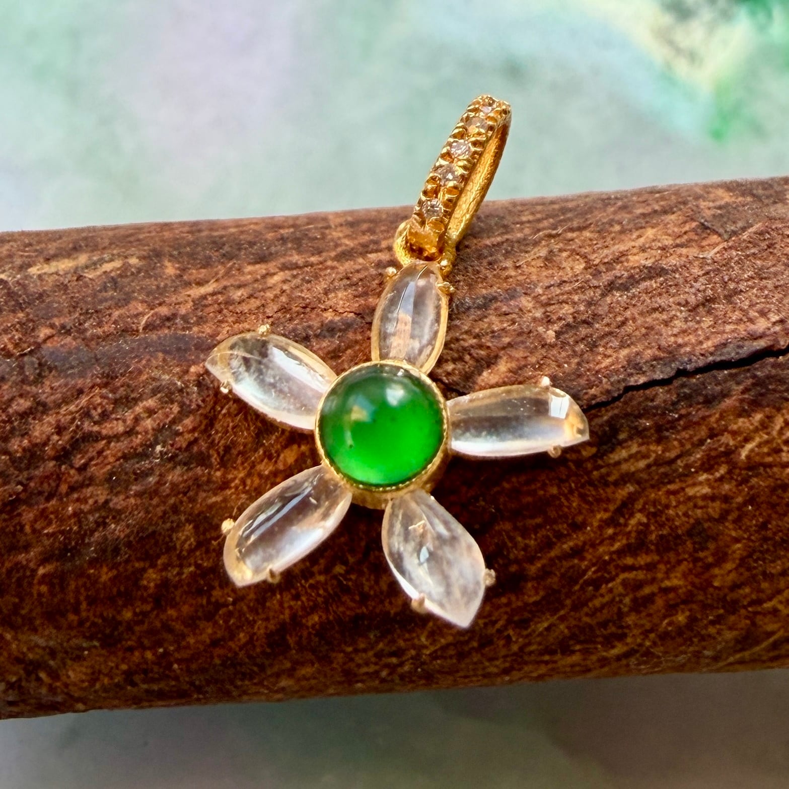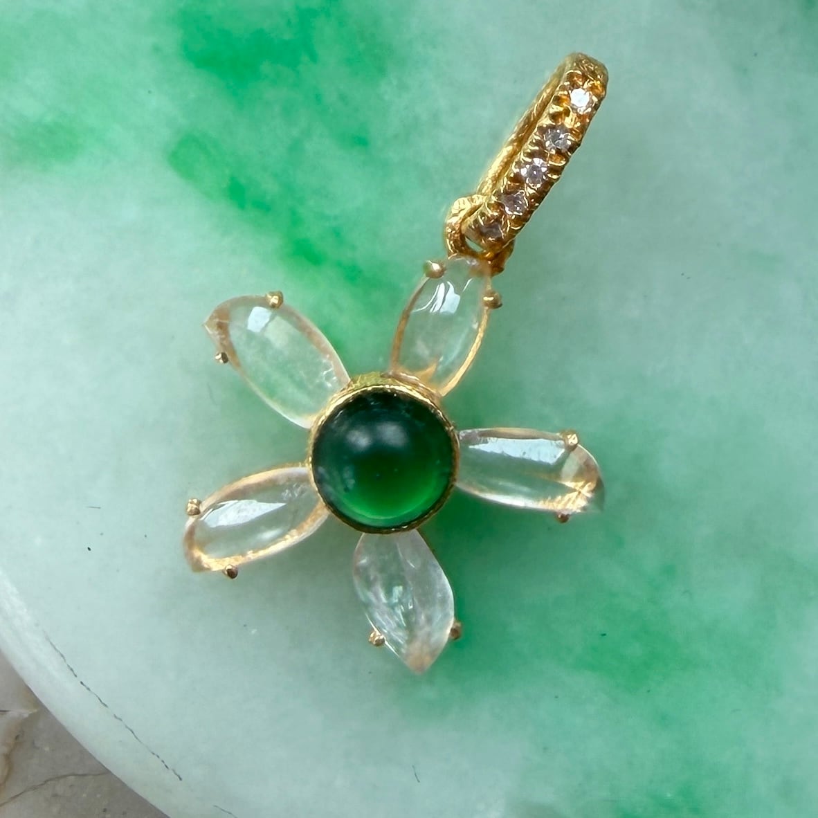 華やかな緑色が目にも眩しい美しい翡翠をセンターに、瑞々しい氷翡翠で囲ったフラワーチャームです。翡翠の周りは18金で手巻きしてあります。バチカン部分にマイクロセットされたダイヤがさりげなく煌めきます。大粒の緑の翡翠が豪華で目にも鮮やかなペンダントトップです。