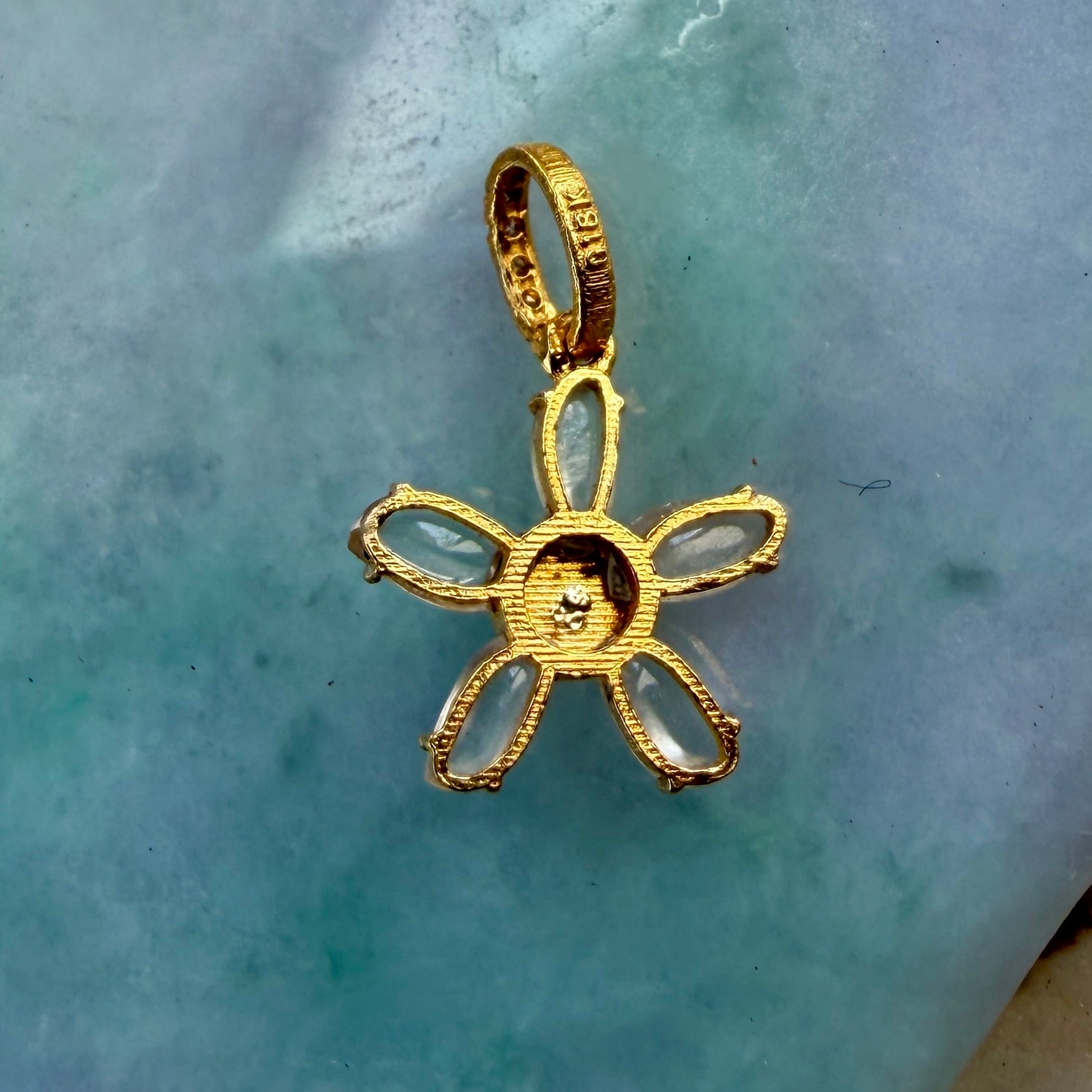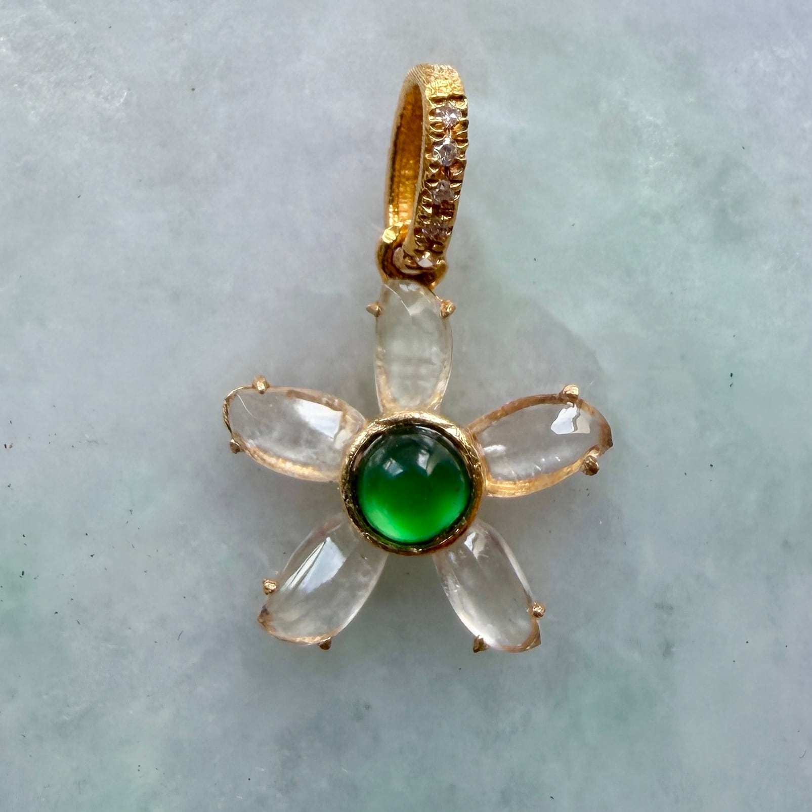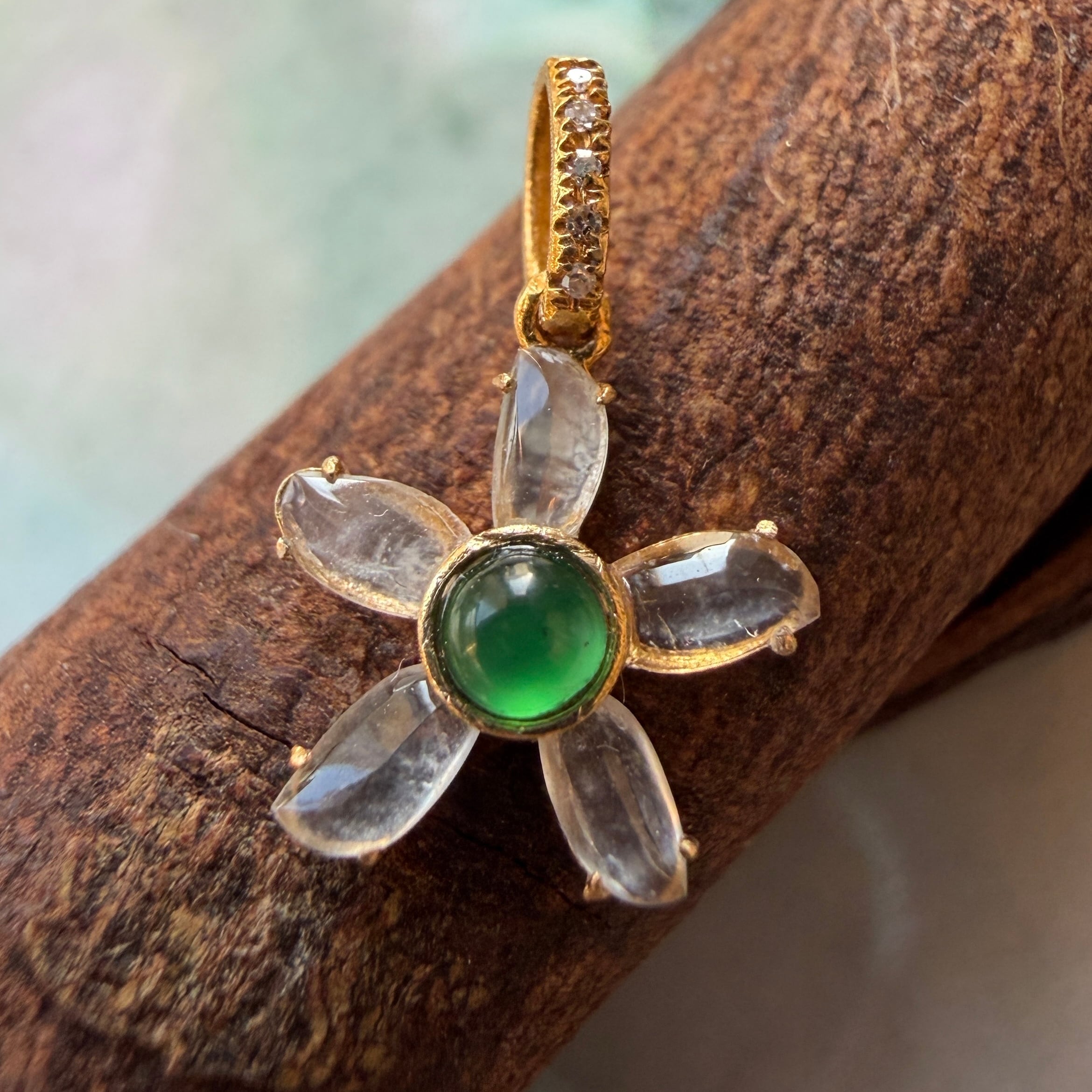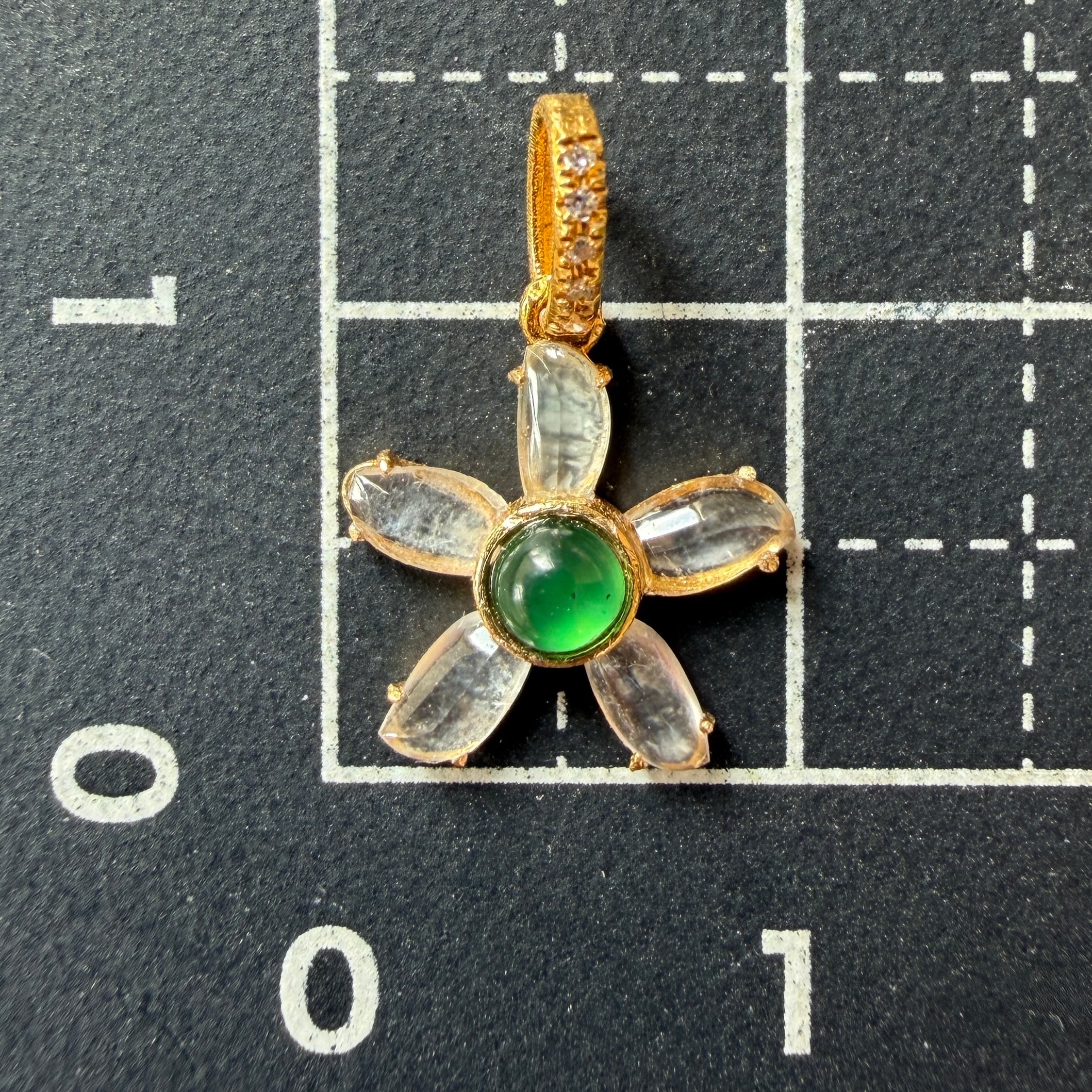 華やかな緑色が目にも眩しい美しい翡翠をセンターに、瑞々しい氷翡翠で囲ったフラワーチャームです。翡翠の周りは18金で手巻きしてあります。バチカン部分にマイクロセットされたダイヤがさりげなく煌めきます。大粒の緑の翡翠が豪華で目にも鮮やかなペンダントトップです。