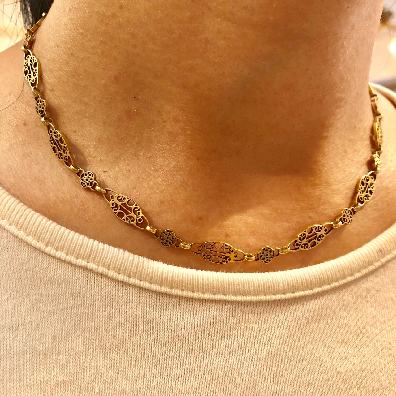 透かしの模様がまるでレースの様に美しいフランスで1890年ごろに作られたと思われるゴールドチェーンです。透かしのゴールドのパーツはは比較的しっかりとした厚みのある18金で出来ており、以前にブログにこの時代のゴールドチェーンのパーツの作り方を書きましたが、打ち抜いてカットされたもので無く、恐らくチューブ状のパーツをロー付け後に加工した大変手の込んだ作りである事がわかります。通常のゴールドチェーンよりかなり凝った二種類のデザインが異なるパーツを組み合わせて作られており、たっぷりとゴールドが使われている事からもチェーンを手にした時の重みと共にこのチェーンが少し特別である事がわかる気がします。この時代に作られたゴールドのチェーンはアンティークジュエリーの中でも最も手入れの楽なもので、素肌に身につけて汗をかいても水洗いが出来、普通のTシャツやワンピースもネックレスを一本つけるだけでお洒落なコーディネートに仕上がります。写真の様に薄手のタートルに合わせてもぐっと素敵な首元を演出出来るのでお勧めです。