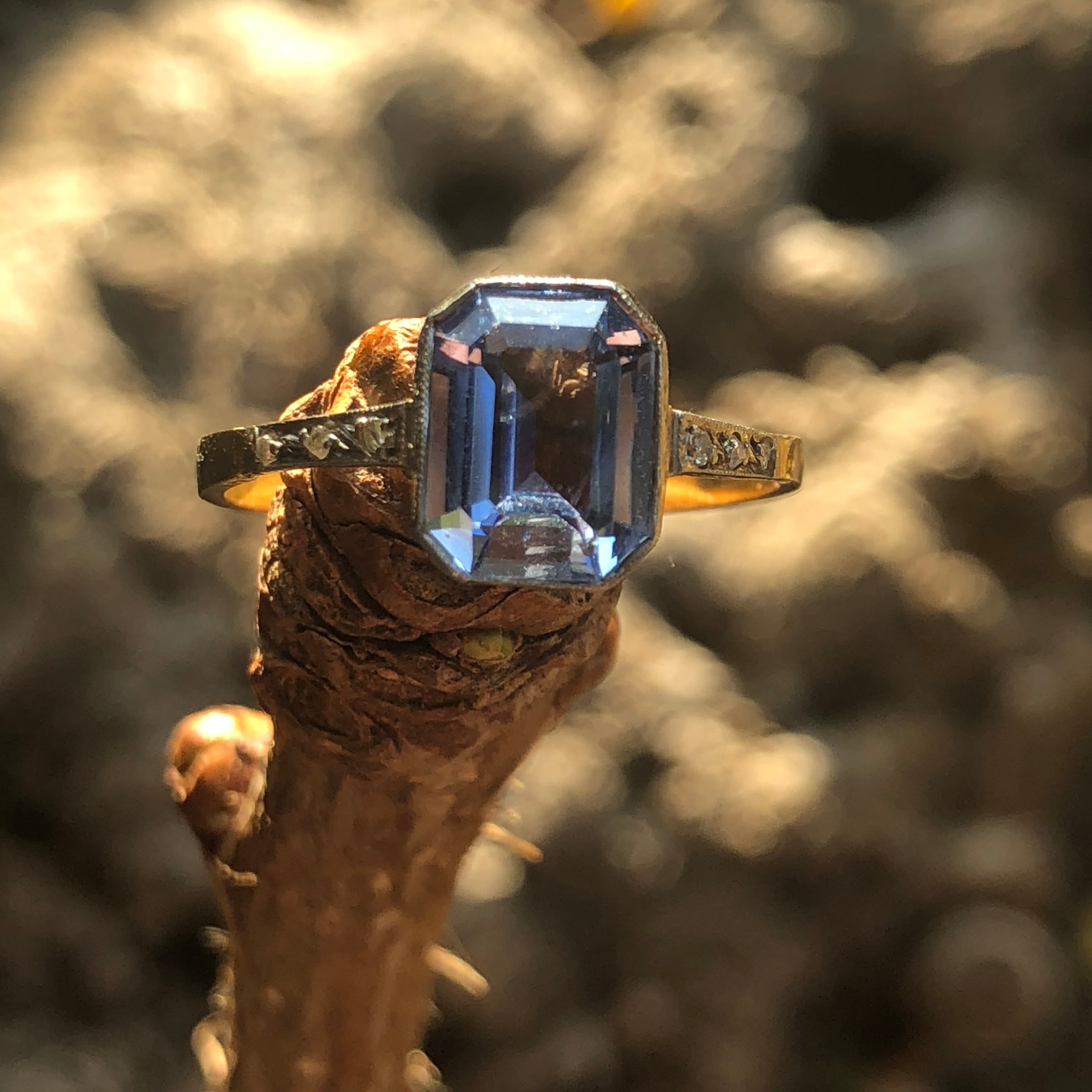 思わず息を飲む様なシャープなカットが印象的なセイロンサファイアとダイヤモンドの20世紀初頭にフランスで作られたと思われるアンティークリングです。サファイアの大きさは3ctより少し小さめですがフラットな身につけても邪魔にならない作りの為実際の大きさより少し大きく見えるのもこのリングの特徴です。このサファイアは光によって優しいブルーから少し曇り空の様なスチールブルーの色にカラーチェンジするので身につけていて楽しくなるリングだと思います。もう一点のサファイアリングにも書きましたが、1ct以上のサファイアはどうしたんだろう?と思うくらい市場から姿を消し、価格も高くなっています。ちょっと個性的なアール・デコのサファイア。オールシーズン活躍しそうなリングです。
