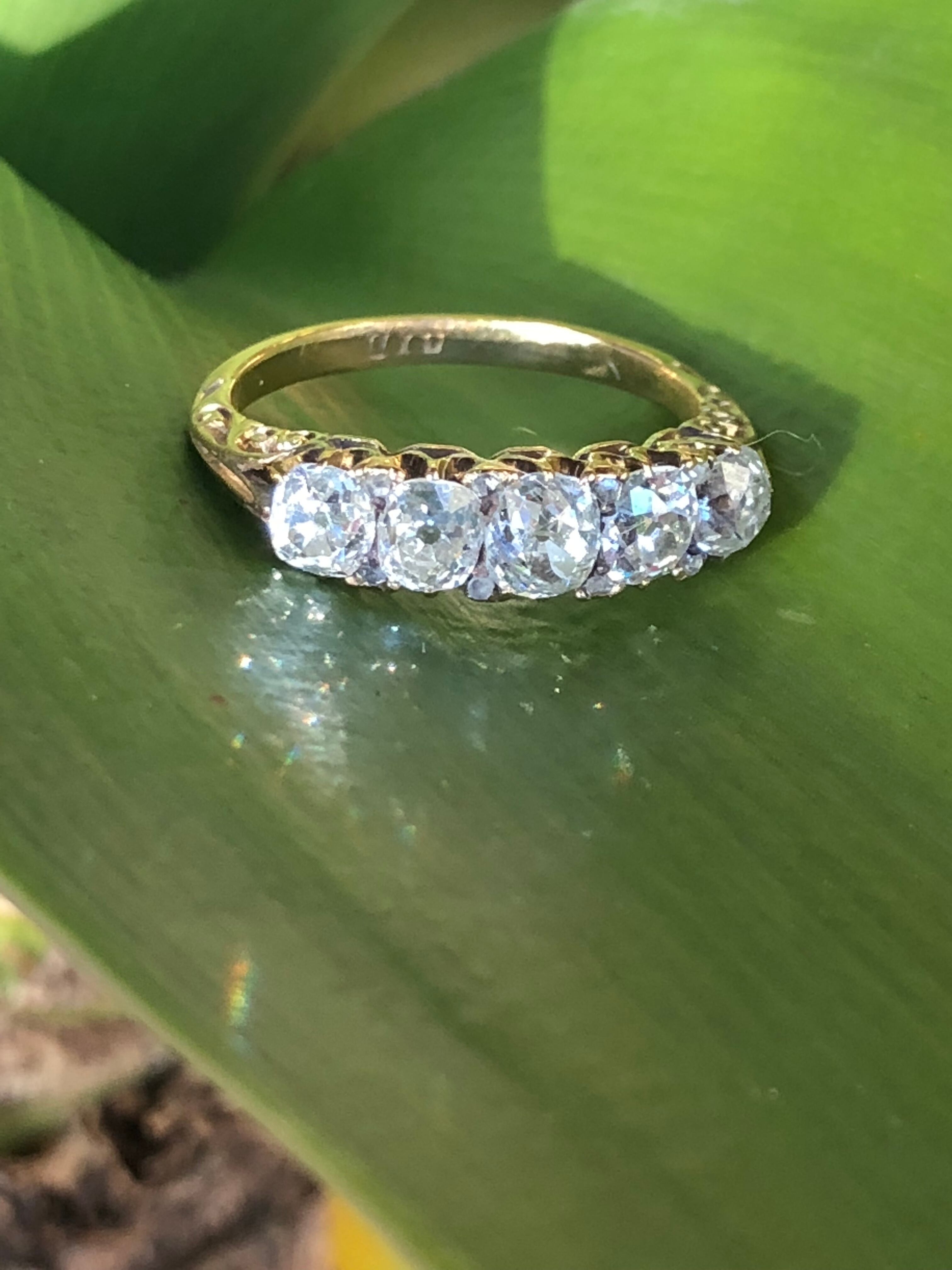 今までに見たハーフフープのリングで1番バランスが良く美しいのでは?と思うクッションカットダイヤモンドのハーフフープリングです。ヴィクトリアンのハーフフープリングは比較的良く入荷するアイテムですが、カットの美しいクッションカットのハーフフープダイヤモンドリングは珍しく、大きすぎず上品で端正にカットされたクッションカットダイヤモンドが5粒並び、隙間がほとんど無い様に石の間に敷き詰める様に留められたローズカットダイヤモンドとゴールドのスクロールワークのデザインにはうっとりとしてしまいます。