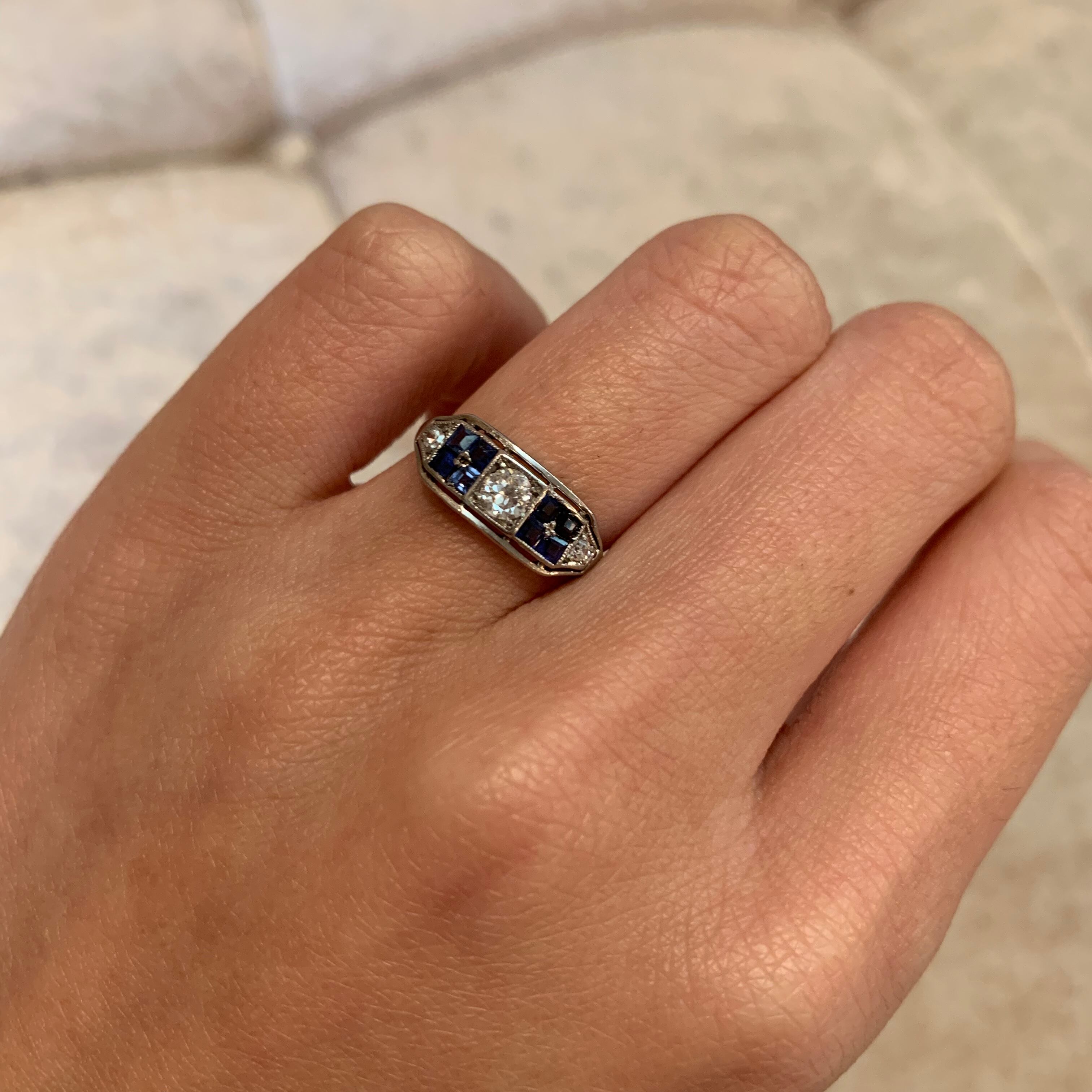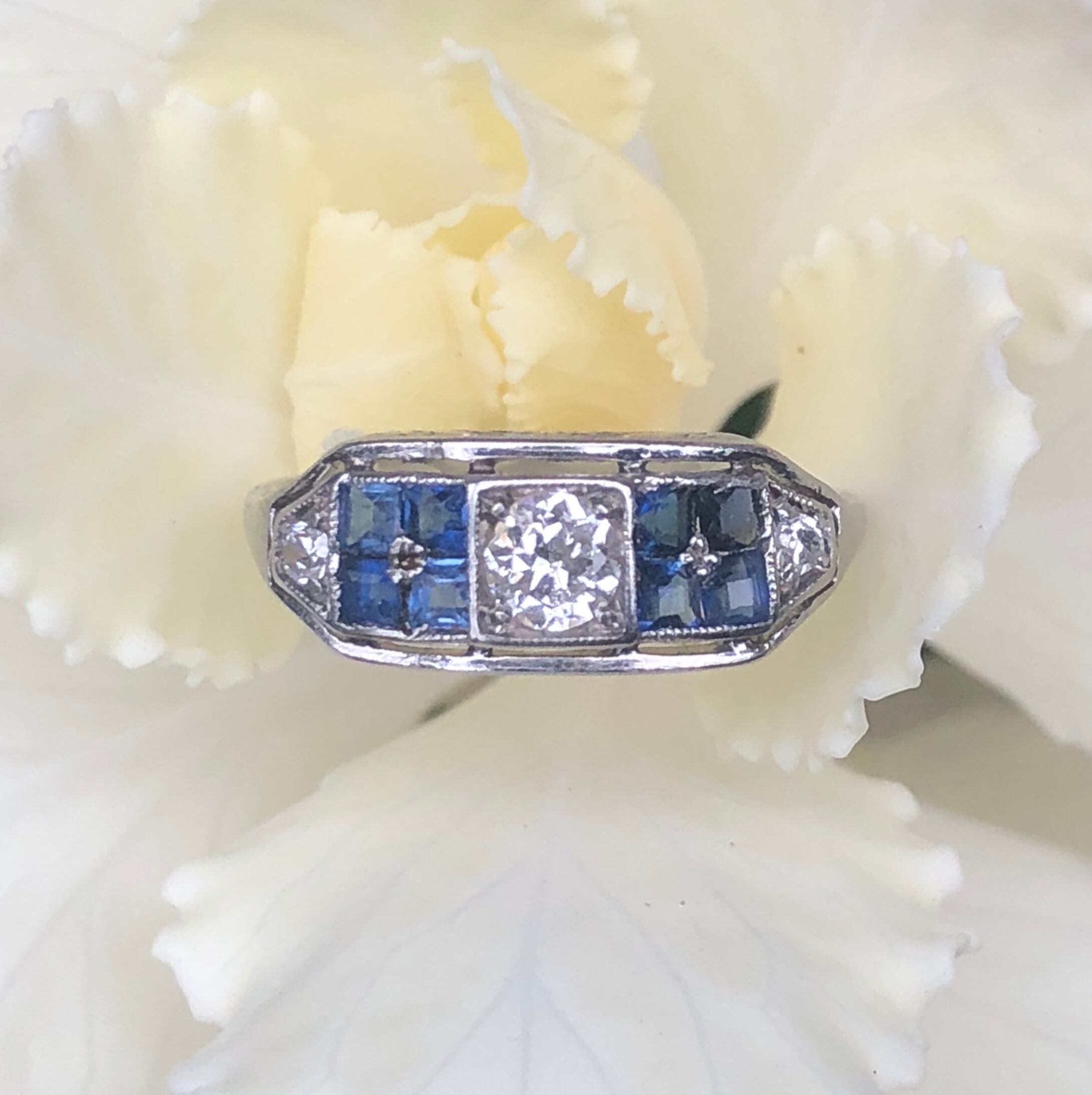 紫陽花の花を思わせるモンタナサファイアブルーの小花と白いダイヤモンドのコントラスト。細くて華奢な印象を受けるリングですが意外にもしっかりと作ってありプラチナの重みを感じます。小花は4つのサファイアをカリブレカット、セットする際に中心に花芯の様にプラチナのビーズが施されています。簡単なアイディアですが初めて見るデザインとセッティングです。