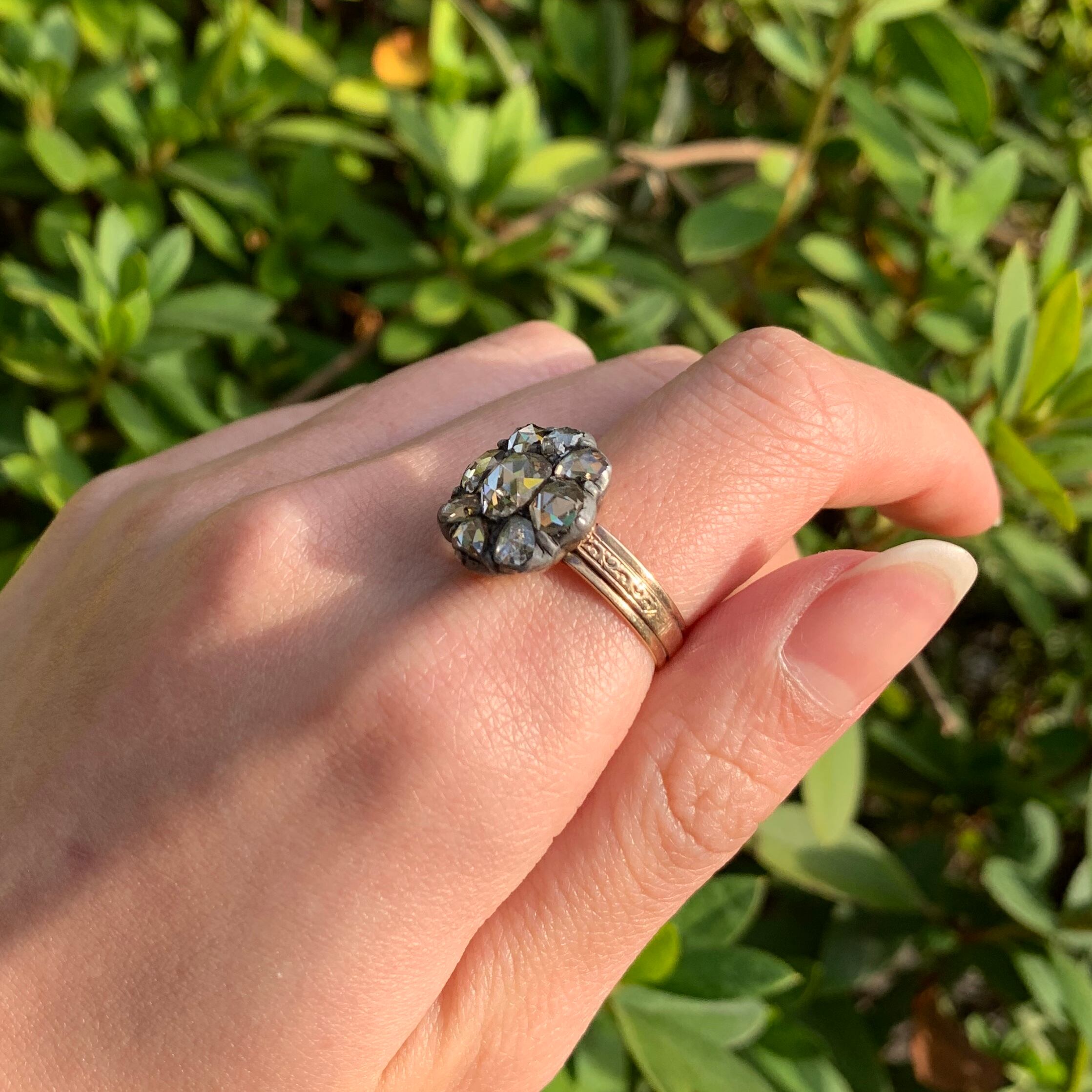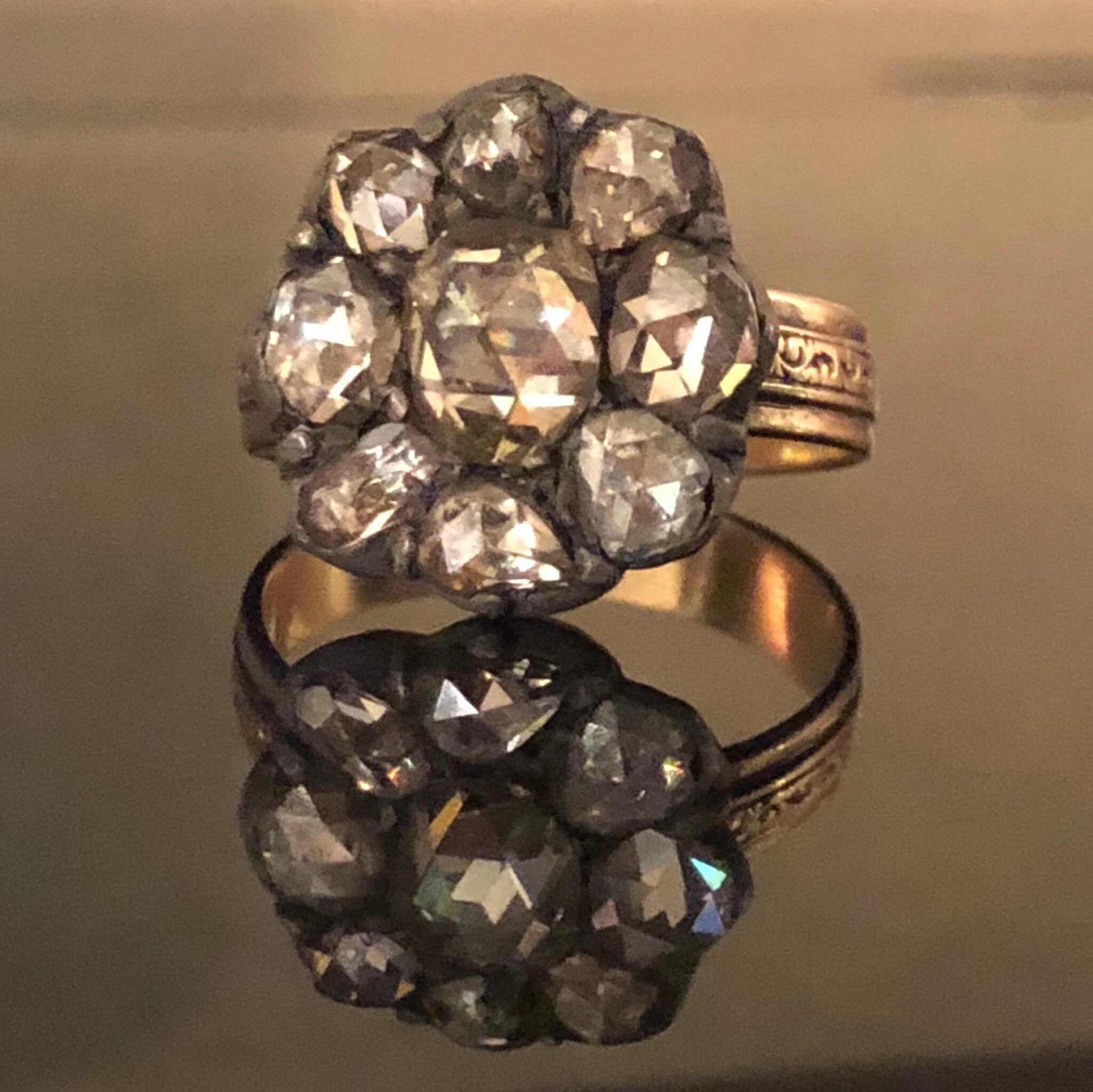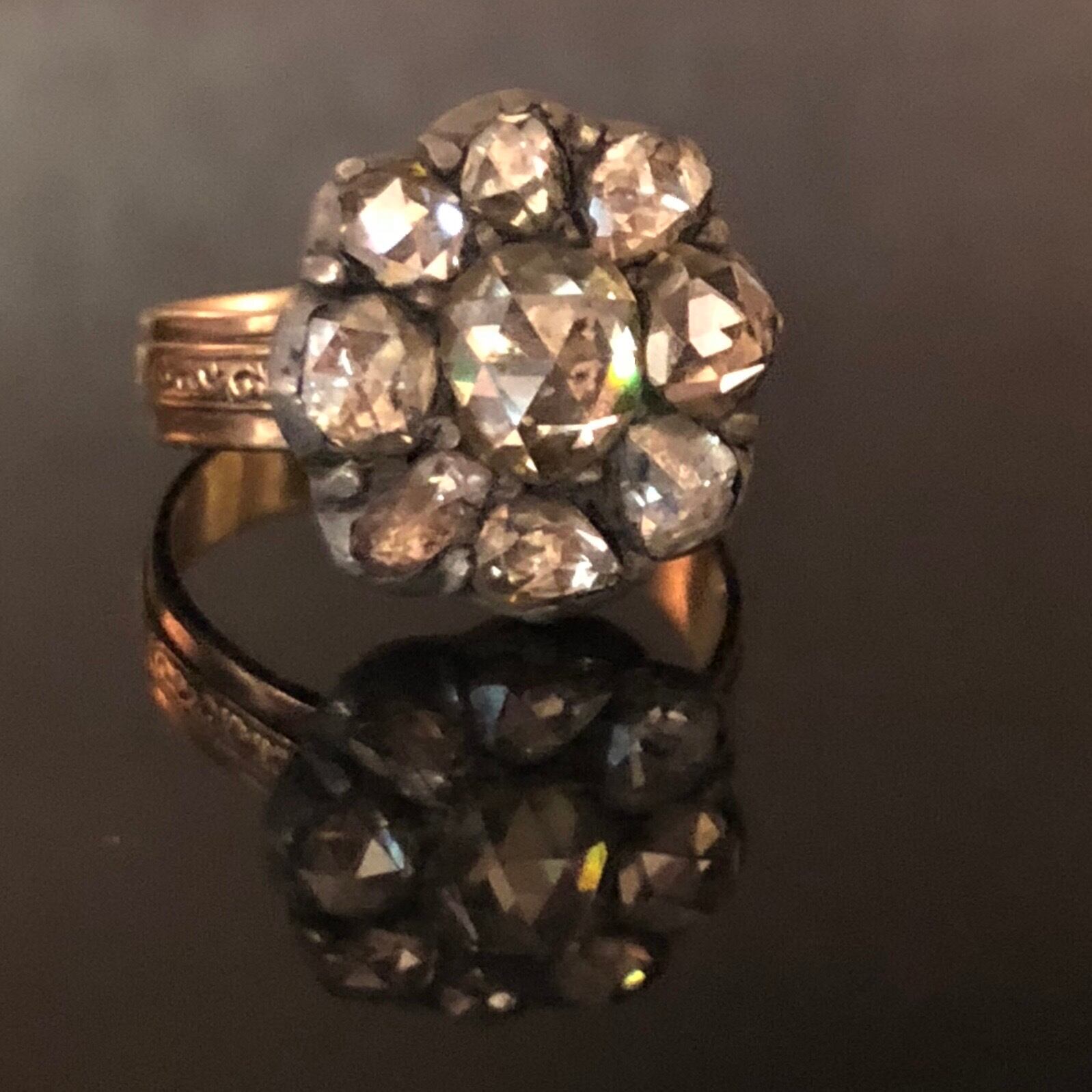 19世紀中期に作られたと思われるコロコロとした山高の大粒のローズカットダイヤモンドを集めたアンティーククラスターダイヤモンドリングです。カットの表面の先が尖っているその形状が薔薇のつぼみを思わせ、ローズカットと命名されたそのカットのダイヤモンドの光の鍵はダイヤモンドの高さとなる厚み。現在のキラキラと細かな光のブリリアントカットのダイヤモンドと違い、入って来た光はその深さがあるほど大きな光となり、また跳ね返される様にギラリと大きく光ります。このリングに使われたローズカットのダイヤモンドの裏には箔が施され閉じられ、大きさとカットが似たダイヤモンドが向かい合わせに並べられ真ん中のローズカットダイヤモンドの周りを取り囲みクラスターリングの光の花を作り上げています。この様なローズカットダイヤモンドのクラスターリングは最初はボタンとして作られ後から指輪の輪の部分のシャンクがつけられたり、最初から古く見せた作りのリングが数多くアンティークマーケットには流通していますが、偽物か本物のオリジナルか見分ける手がかりは、指をリングに入れた時の滑らかさと、裏側から見た時のシャンク部分とダイヤモンドのセットされたメインの部分との繋がりの一体感の美しさも一つのポイントと言えます。アンティークジュエリーが沢山流通するロンドンやパリなどでもなかなかこのボリュームのローズカットダイヤモンドでこの美しいアンティークのオリジナルのリングが出ることは無いと思います。今回のトレジャーハントの様な約四週間の長い旅での掘り出し物のリングと言えます。ダイヤモンドの質、カットのユニークさやシャンク部分のゴールドのエングレイビングの美しさ、作りの良さやコンディション。どこの部分を見ても良い自信を持ってお勧めできるリングです