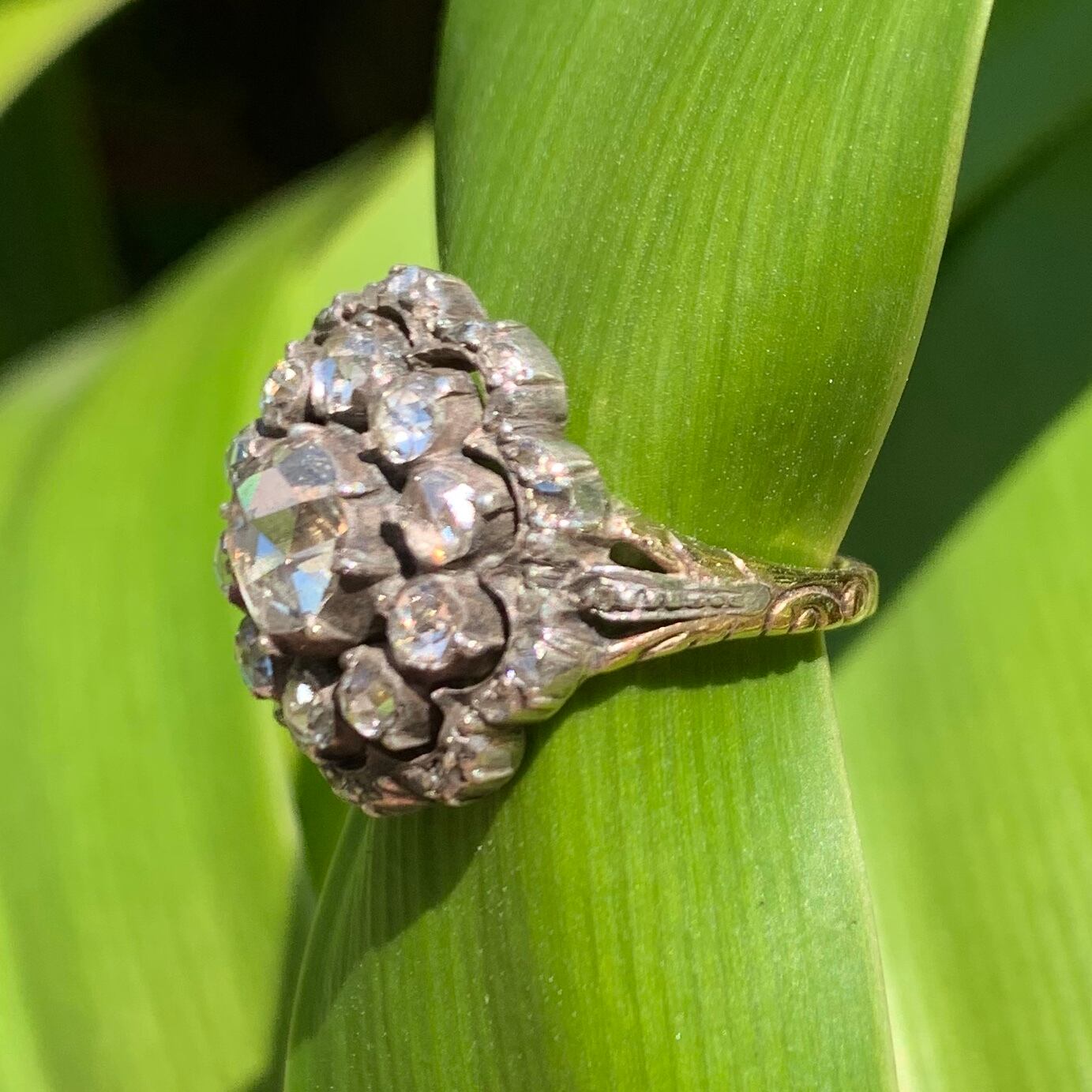 オランダのクラウンジュエラーとして名高いFa Rosenthal工房によるローズカットリングです。まるで雪の結晶が指に咲いたような、ゴージャスでシックなデザインはクラスターリングと呼ばれるもので、1900年頃にオランダで制作されました。