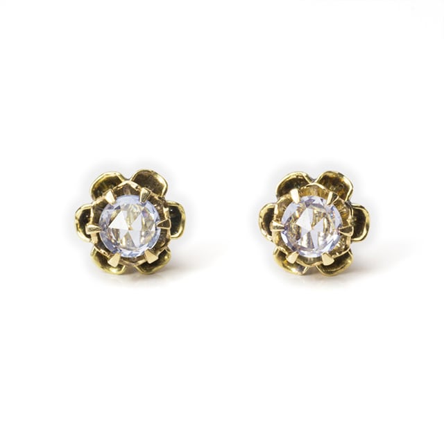 ヴィクトリアンボックスオリジナルのスタッドピアスです。ほんのりと青みがかったローズカットを施したサファイアはアンティークスタイルのバターカップのゴールド枠に包まれています。二重の花弁で包まれたローズカットサファイアはまるでブルーダイヤモンドのような神秘的な輝きを放っています。