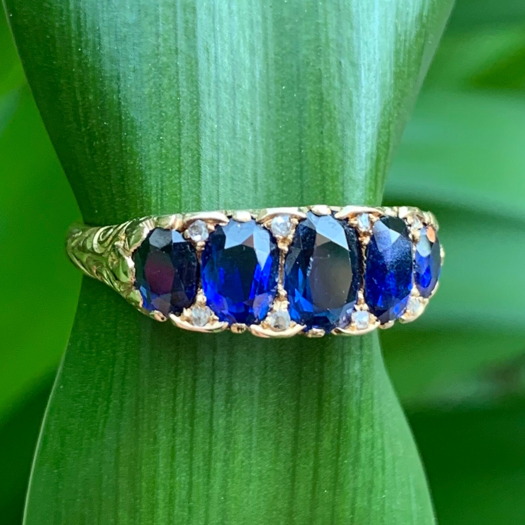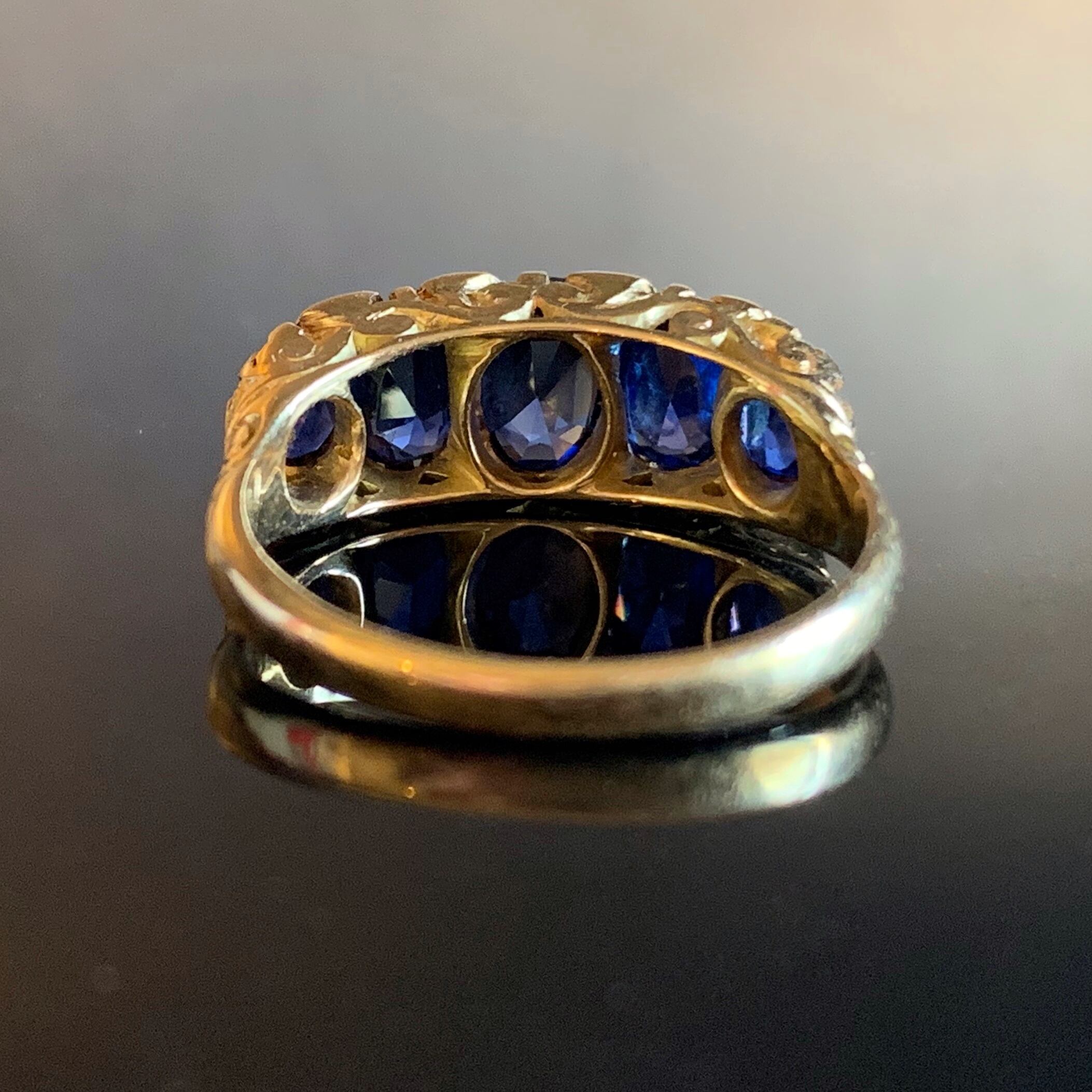 美しく良質なロイヤルブルーのサファイアを5粒並べ、ゴールドのスクロールパターンのセッティングに丁寧に爪留めされたヴィクトリア時代に作られたファイブストーンリングです。