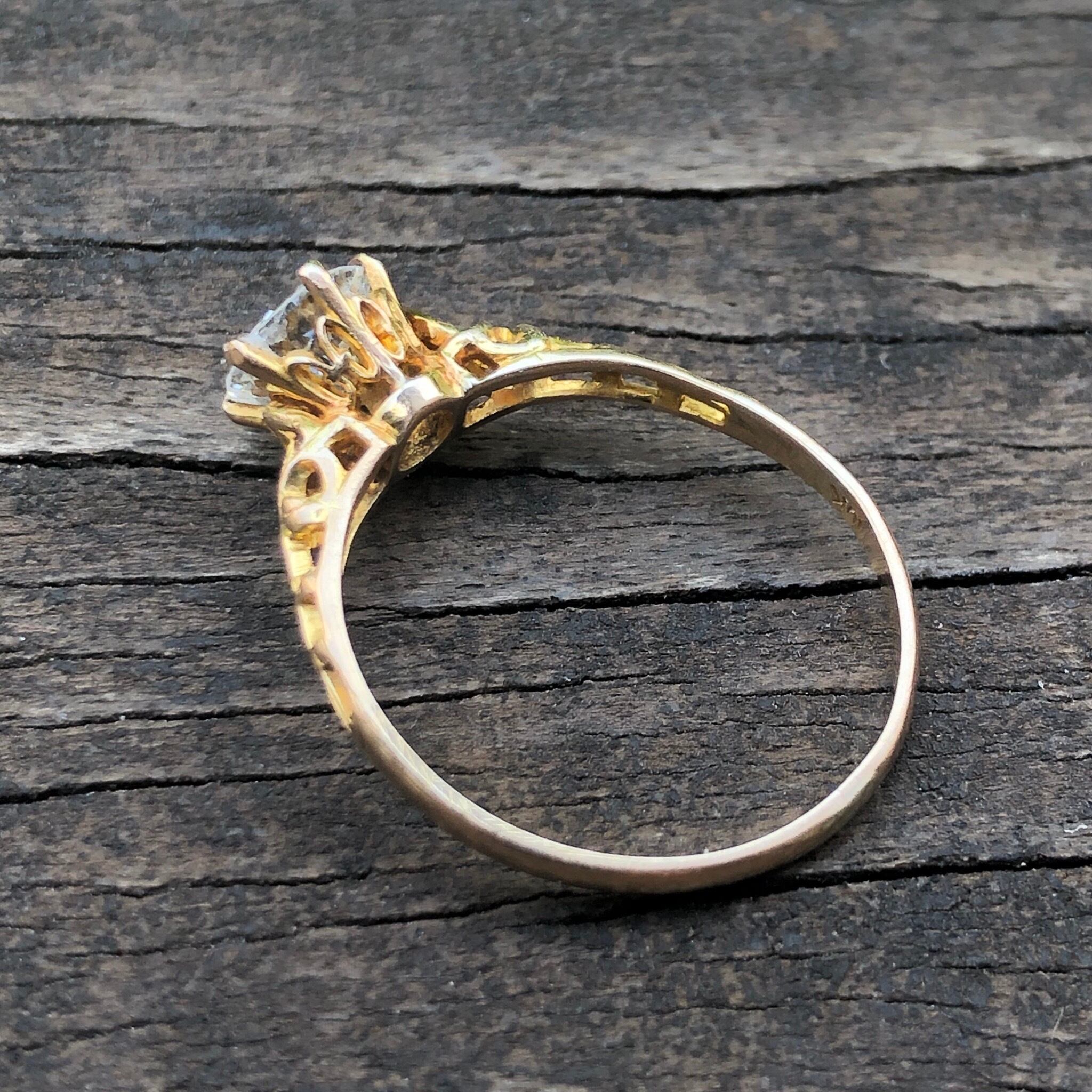 気持ちの良いくらいクリアで綺麗なオールドヨーロピアンカットのダイヤモンドを美しいゴールドの細工のセッティングにセットした王道のアンティークダイヤモンドのソリティアリングです。最後の他のリングと並べた参考写真で見て頂いてもルーペで見ても色の白さとダイヤモンドの輝き、殆ど見つける事の出来ない内包物などオールドカットなのにこんなに綺麗で輝くダイヤモンドがあるのか。。。と思う様なリングです。