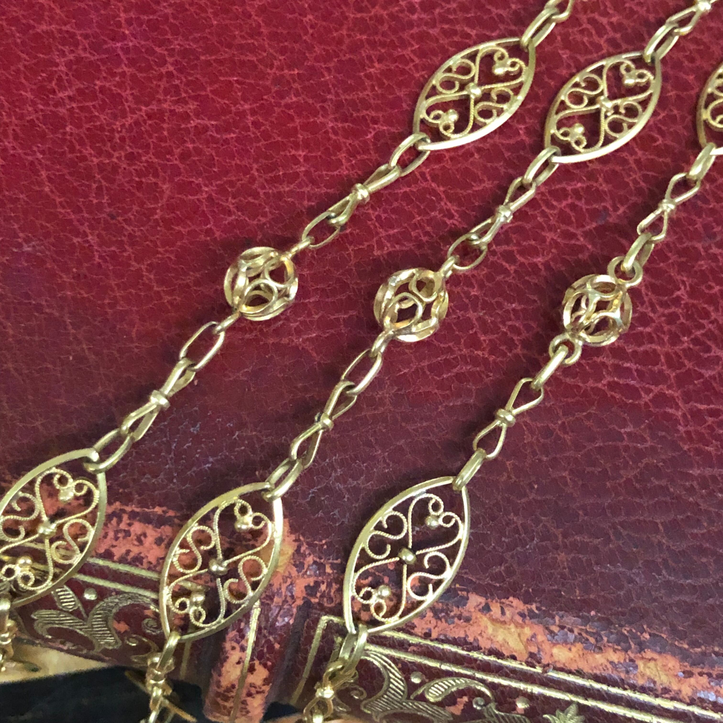 買い付けの際にどうしても気になって仕方がなく他のお品の交渉をしているのにも関わらず、ちょっと上の空になりそのお品ばかり見てしまう事があります。そんな素敵なお品がこのチェーン。船形のフィリグリーのオープンパーツに立体的なボールパーツ。海外のお客様の為に大きなダイヤモンドを探しに行き偶然お店にお嫁に来たばかりのこの美しいゴールドチェーンを買い付ける事が出来ました。このチェーンは19世紀末から20世紀の初めに作られたものと思われます。
