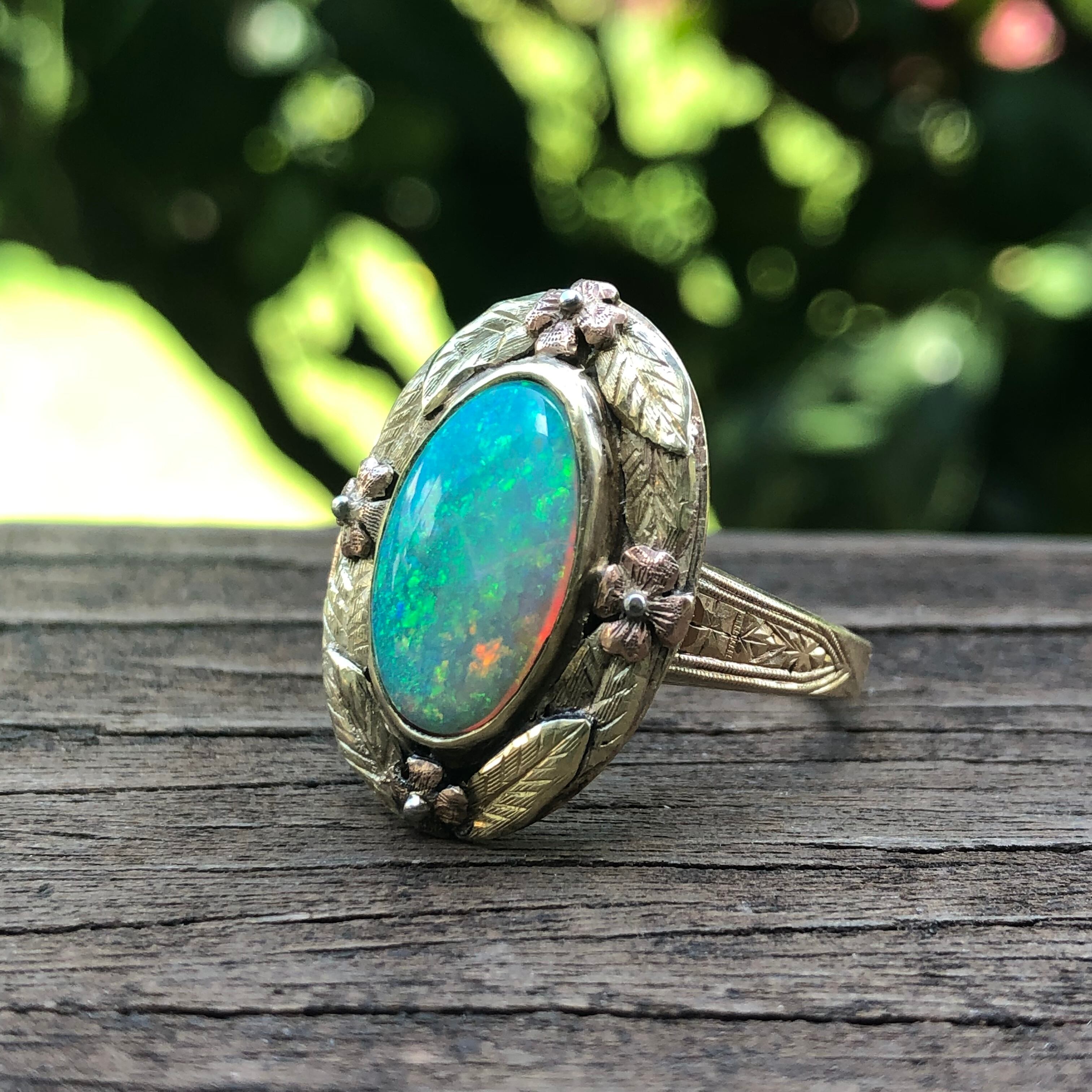 私もこのリングを実家の庭で撮影したのですが、宝石をプロとして扱っていても驚くほどの美しい色が次々と現れるこの大粒のオパールと美しくユニークなセッティングに心奪われました。