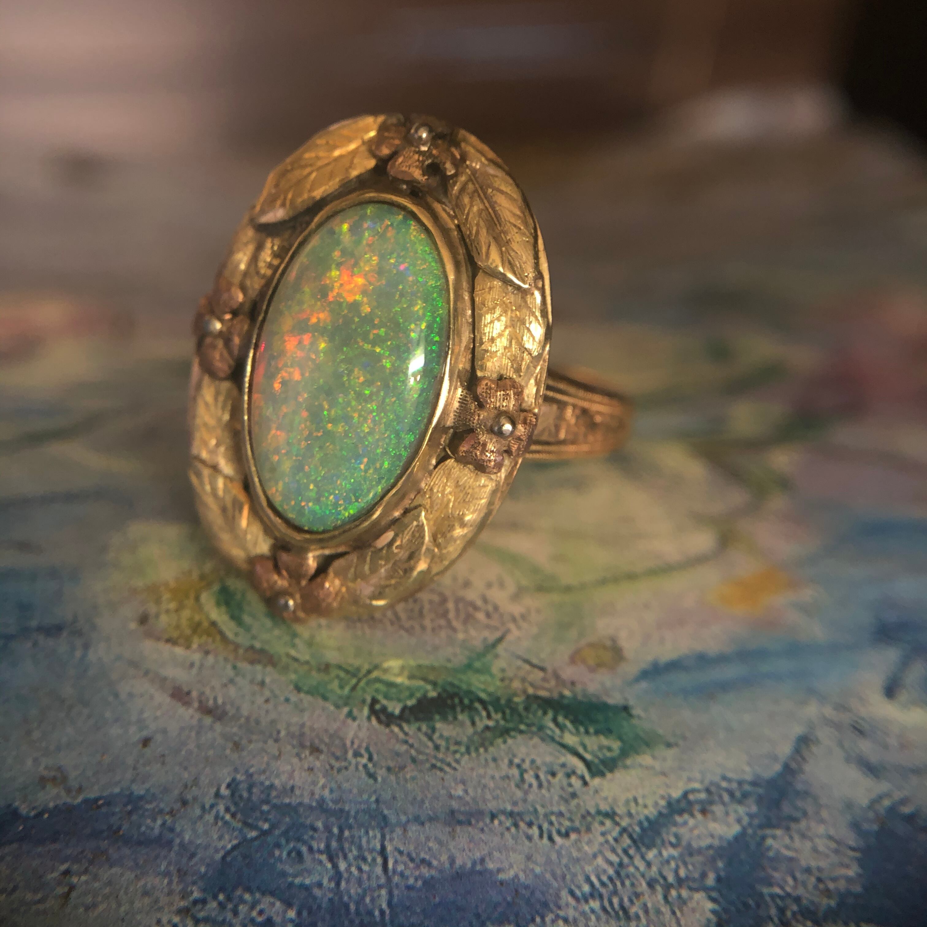 びっくりするくらいセッティングも石も美しいオパールのリングです。アメリカのブラックヒルズゴールドと言うグリーン、ホワイト、ローズ3色の異なるゴールドを使った細工やサイドのローズゴールドの彫模様のシャンク、オレンジや緑の色が光によって変わる色がまさに遊ぶように石に次々と現れる遊色効果の美しいオパール。