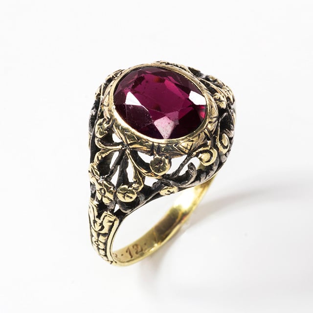 イタリアンジュエリー特有の美しい彫り、見事な彫金のマウント、良質なワインのような深い赤のガーネットがアンティークジュエリーならではの美しさが印象的なリングです。