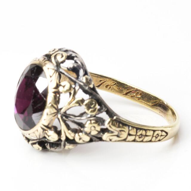 ほの暗い古美のシルバーの蔦が伸びやかに絡み合い構成されたドームの中にゴールドであしらわれた花やつぼみが浮かび上がり、ガーネットの芳醇な輝きを引き立てます。ガーネットをセットした枠や腕下に連なるシャンク部分にも端正な彫りが施され、どの角度から見ても惚れ惚れとさせられるアンティークならではの手仕事の美しさが詰まったリングです。