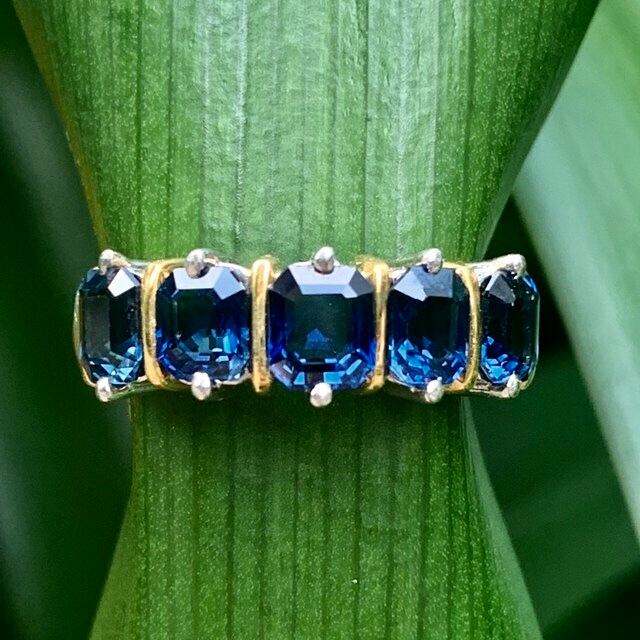 美しい青い色と一粒一粒が大きめの長方形のカットが印象的なサファイアを5つ並べたヴィンテージのハーフフープリングです。プラチナとゴールドがたっぷりと使ってあり、ずっしりとした重みも感じます。金色と銀色どちらの色も使ってあることからお手持ちのジュエリーや時計と合わせても馴染みの良いサファイアブルーはどんなお洋服にも合う万能のリングです。